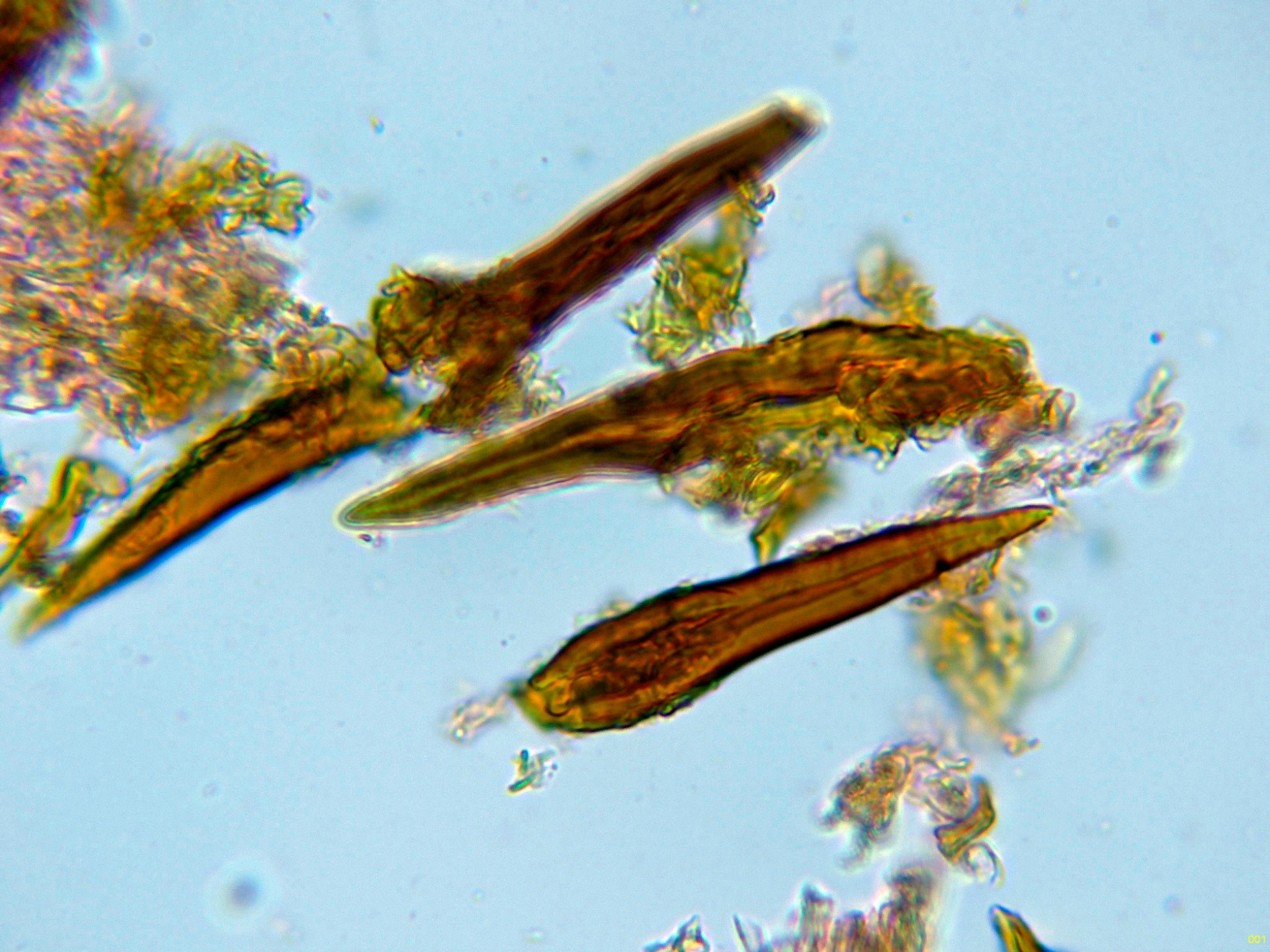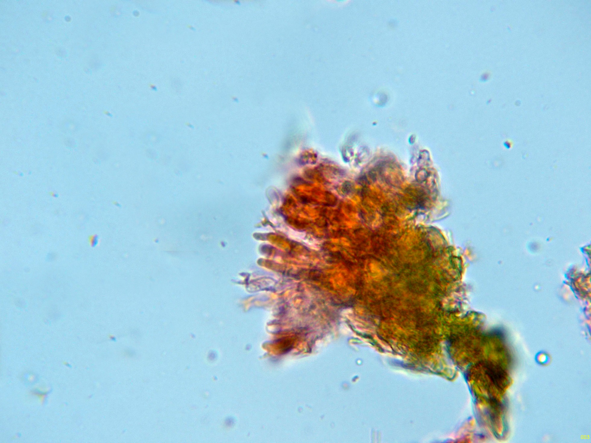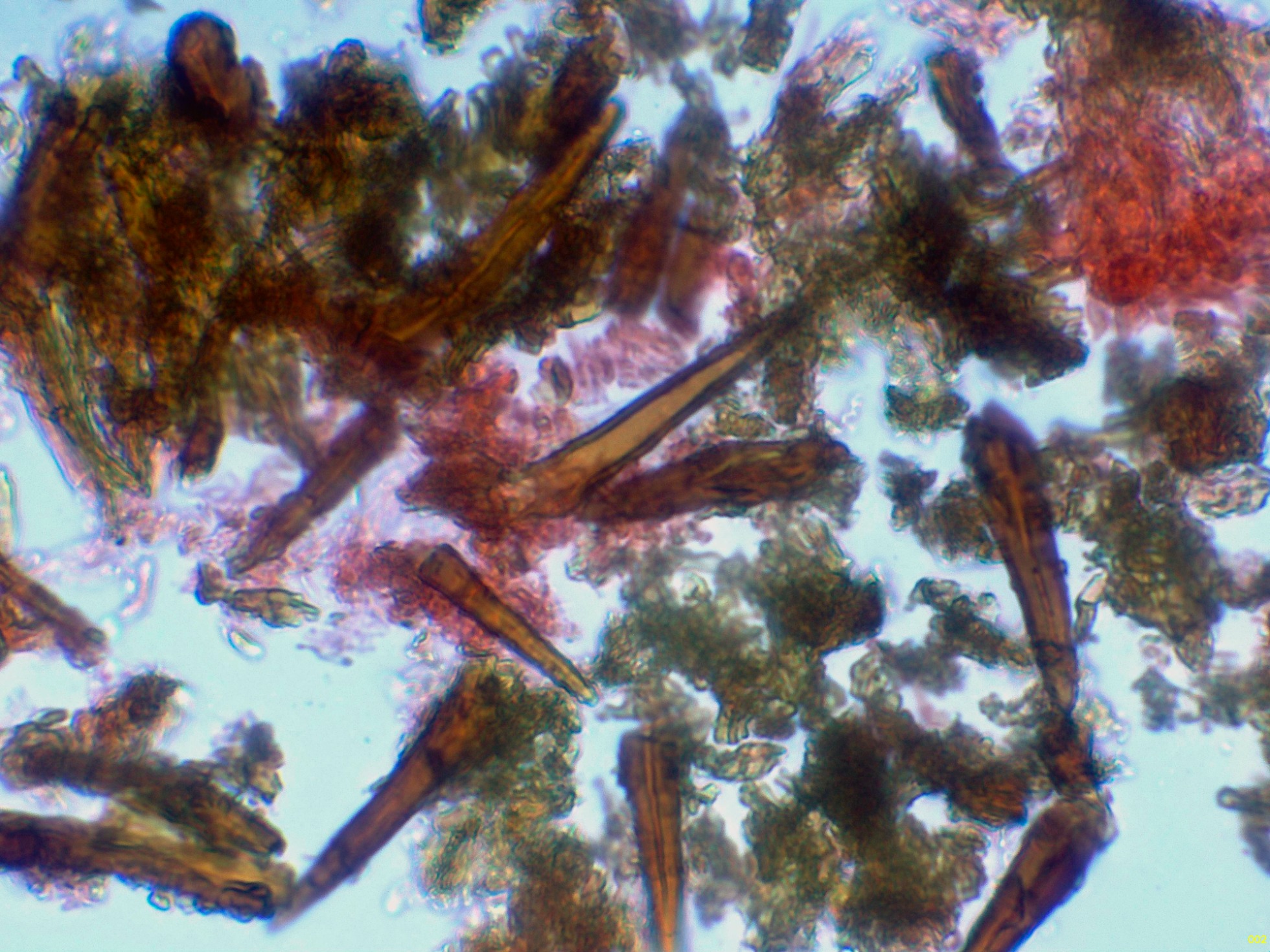 Observaciones: A pesar de llevarme muestras de todas las etapas de su desarrollo, en ningún caso pude obtener esporas por medio de la esporulación natural y tampoco observé esporas libres. Este detalle no es la primera vez que me pasa con el género Hymenochaete ya que de 3 estudios realizados a la Hymenochaete rubiginosa, solo en una ocasión pude conseguir esporas y en un solo estudio realizado a la Hymenochaete cinnamomea, solo pude conseguir media docena de esporas libres.