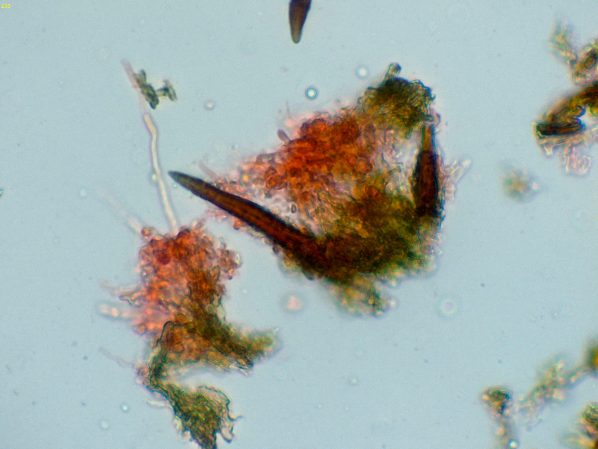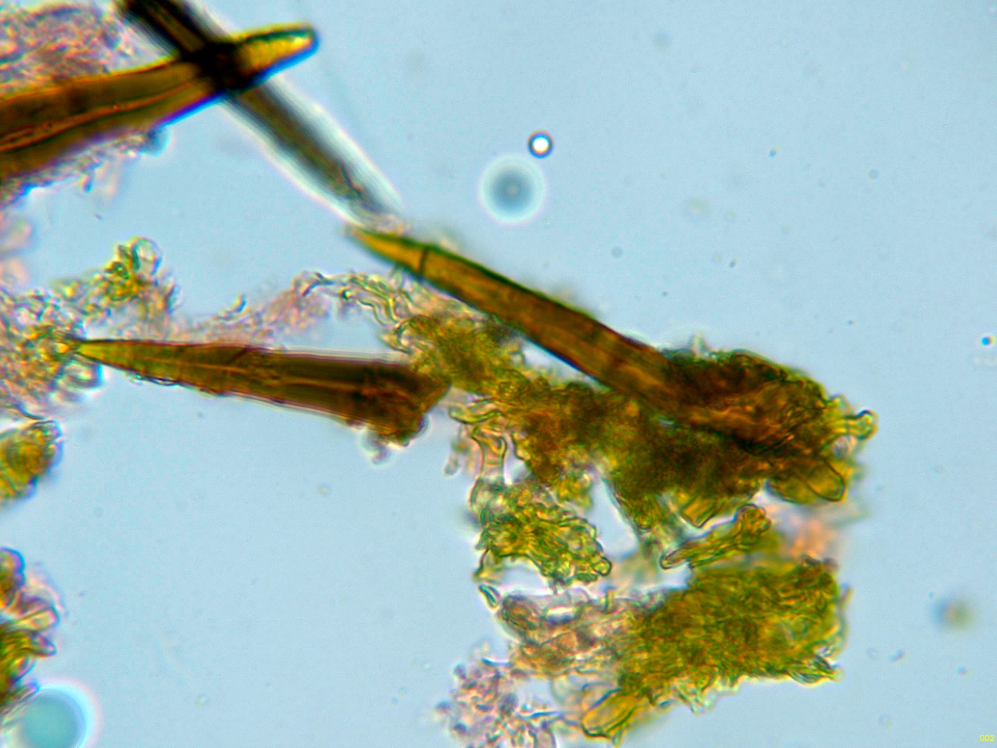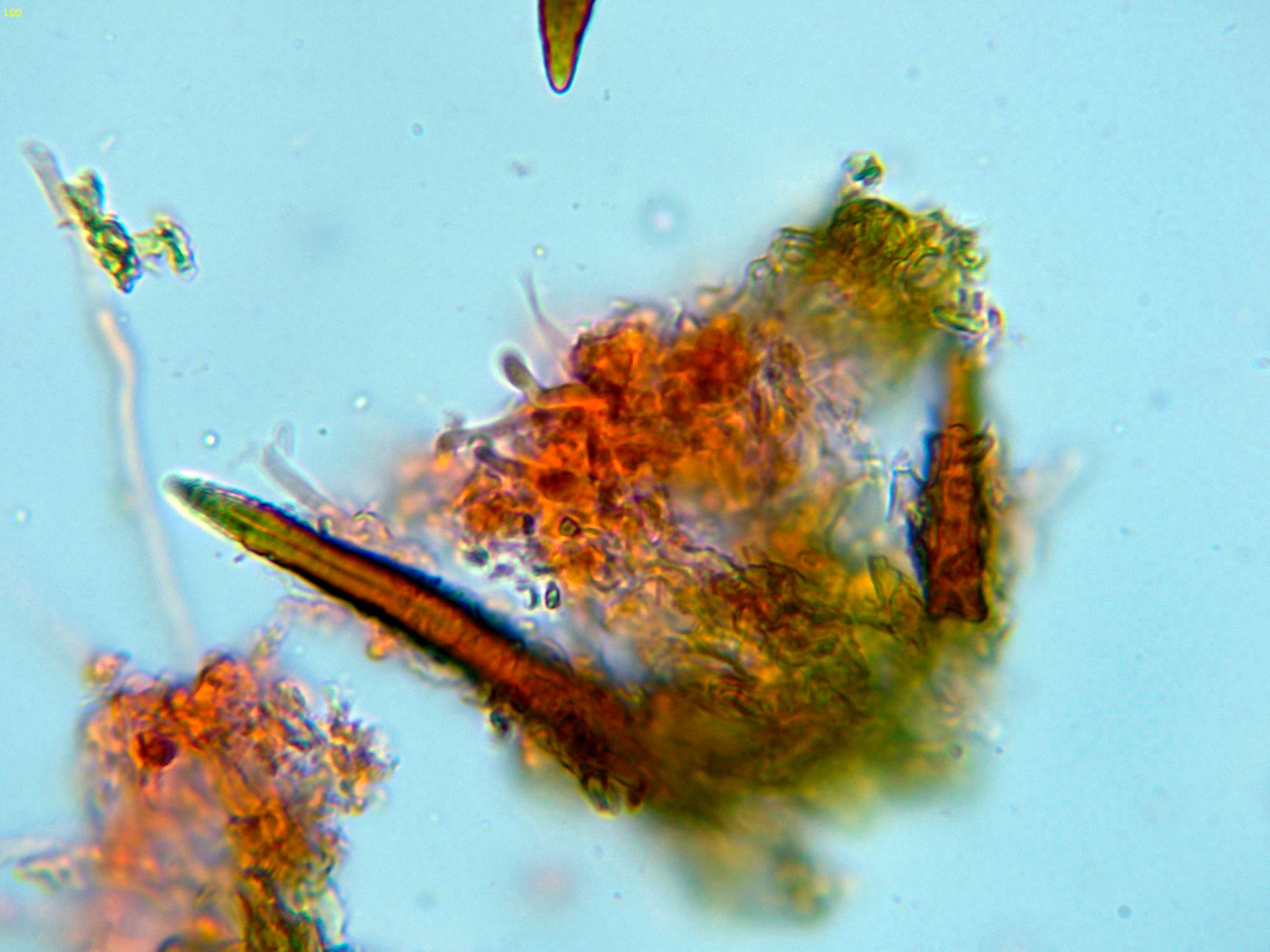 Observaciones: A pesar de llevarme muestras de todas las etapas de su desarrollo, en ningún caso pude obtener esporas por medio de la esporulación natural y tampoco observé esporas libres. Este detalle no es la primera vez que me pasa con el género Hymenochaete ya que de 3 estudios realizados a la Hymenochaete rubiginosa, solo en una ocasión pude conseguir esporas y en un solo estudio realizado a la Hymenochaete cinnamomea, solo pude conseguir media docena de esporas libres.