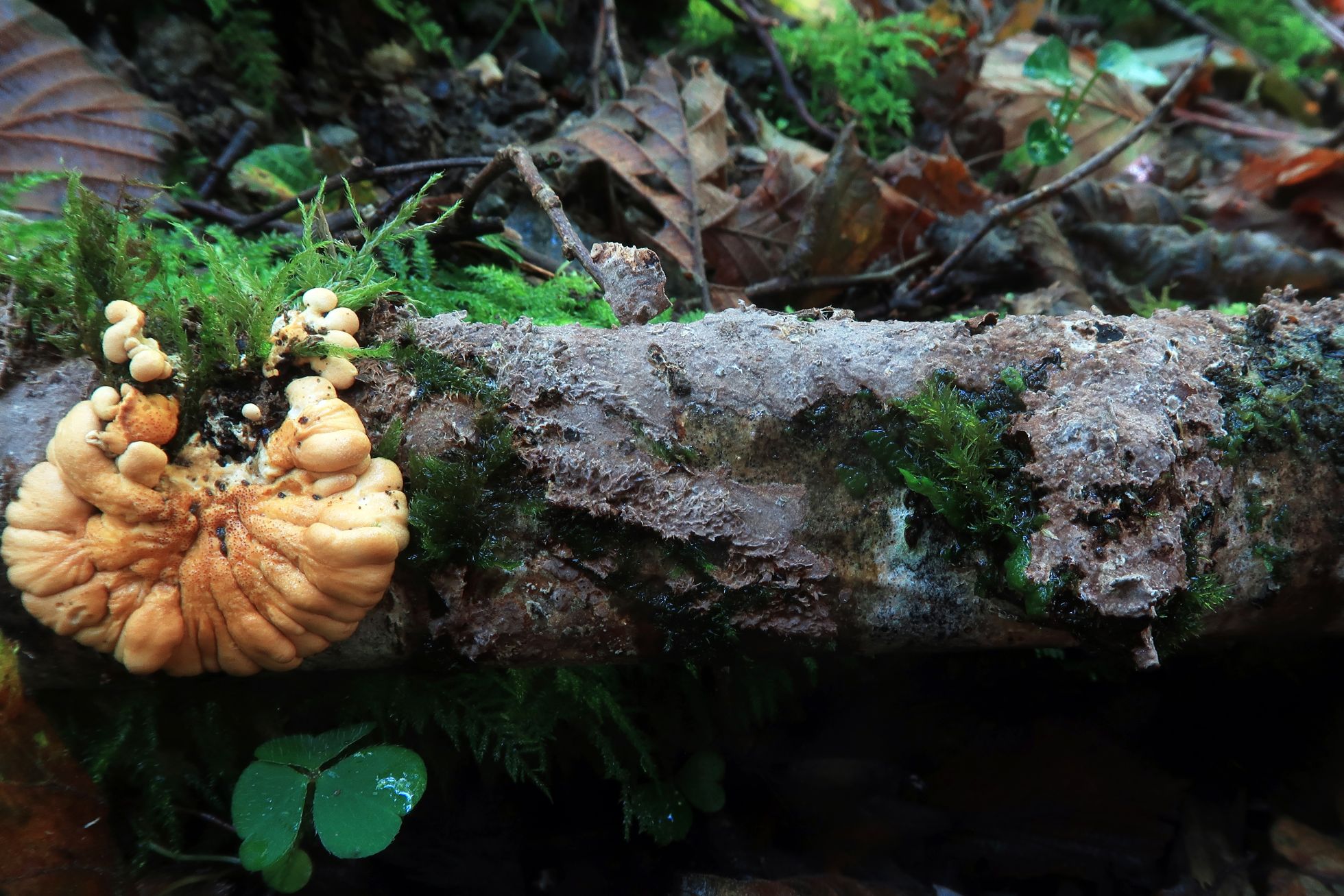 La Hydnoporia corrugata y a la izquierda su parásito, la Hypocreopsis rhododendri.