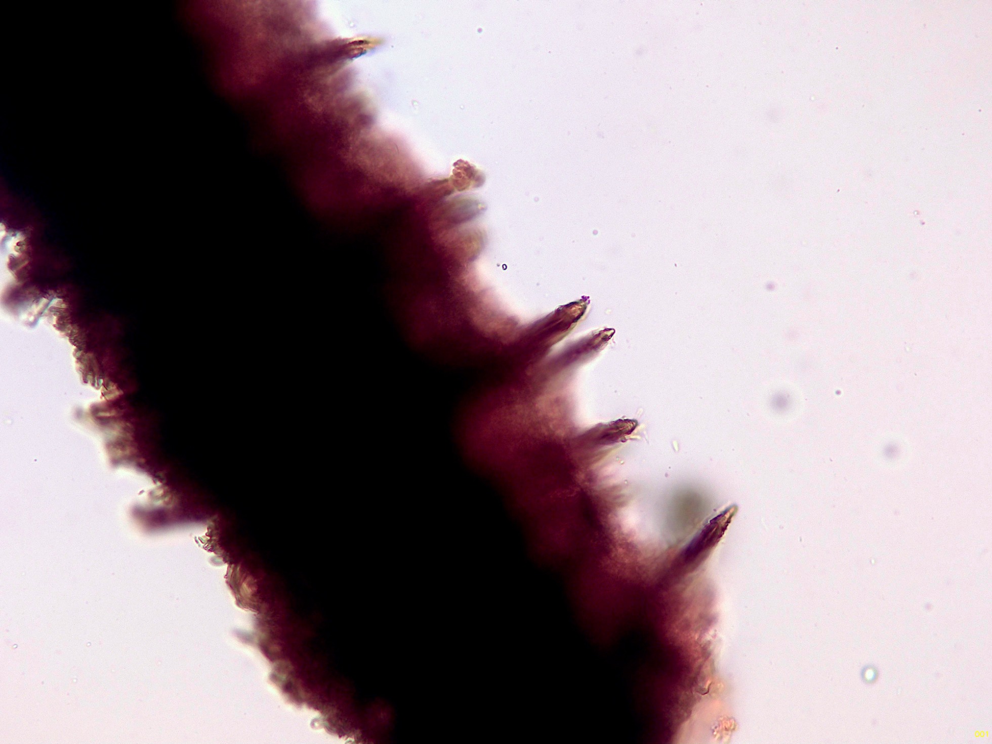 El himenio a 400 aumentos con una gran cantidad de cistidios a modo de setas.