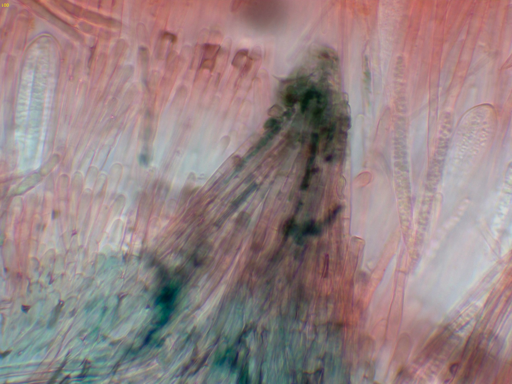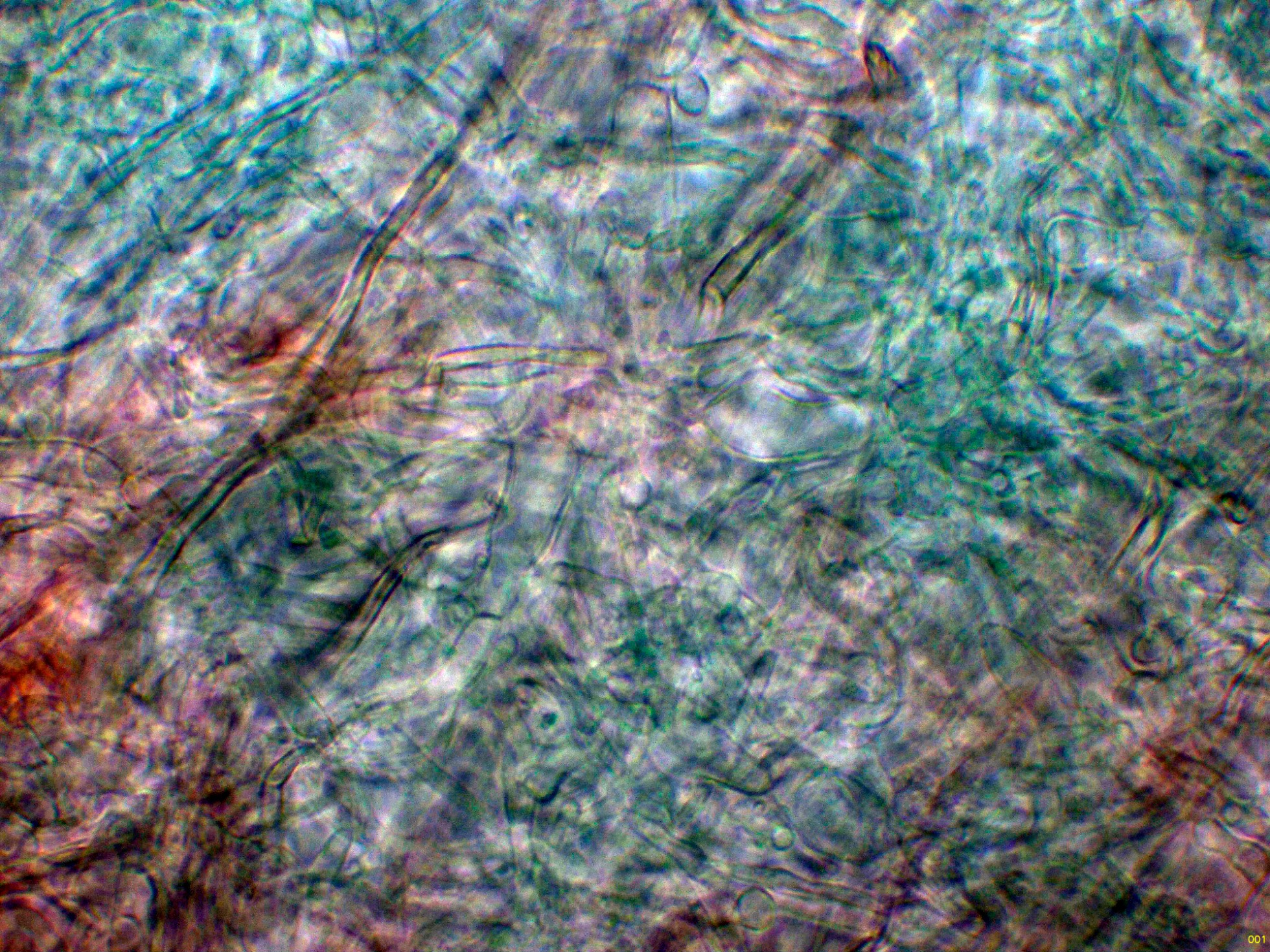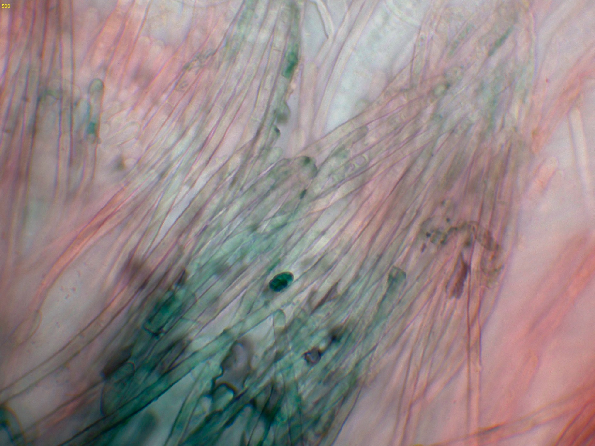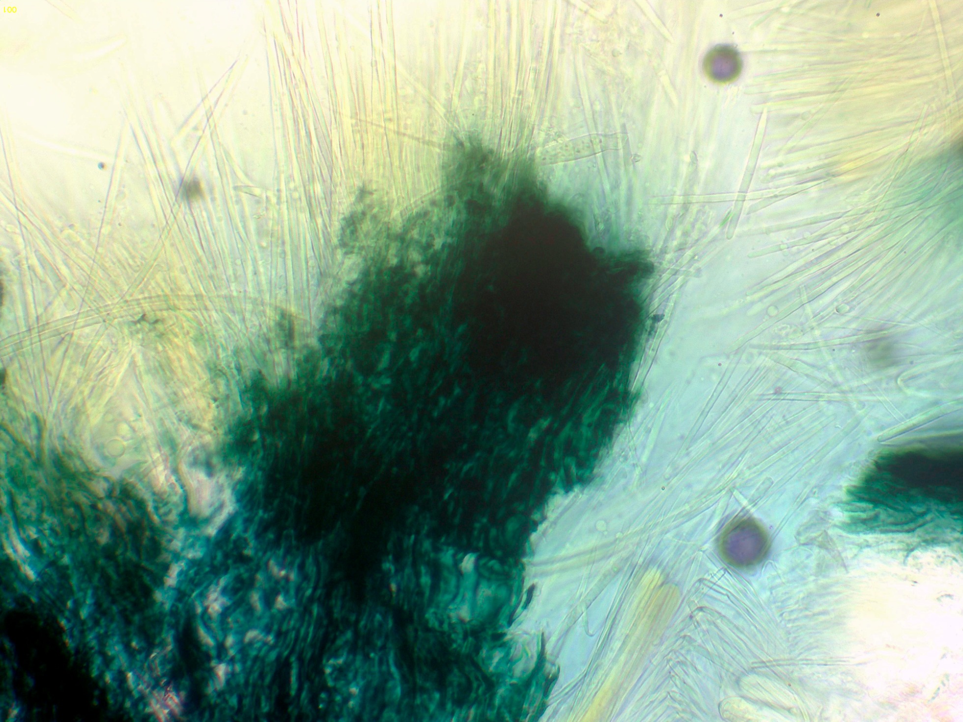 Hifas del contexto a 400 aumentos, con abundante pigmento verdoso.