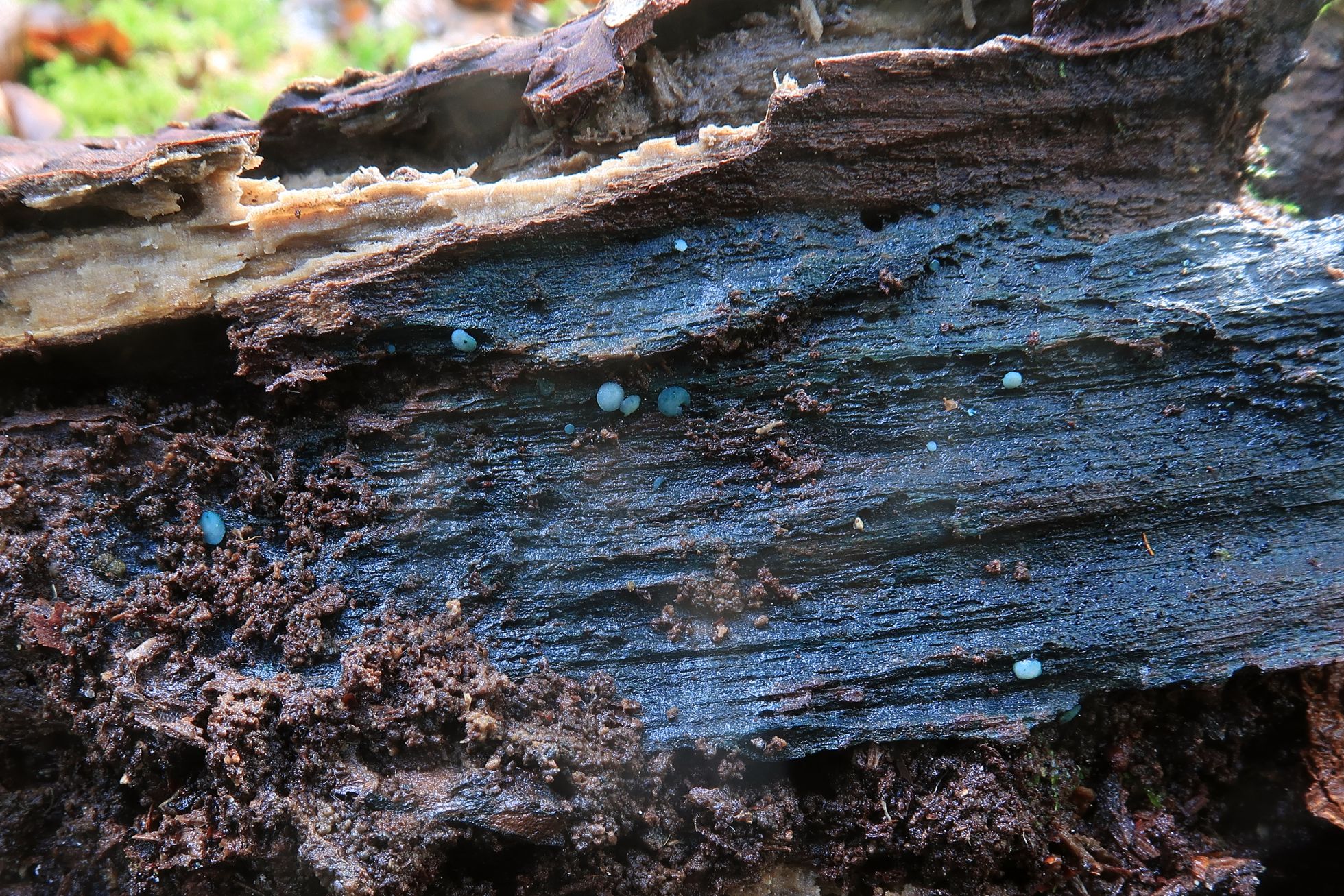 Un pequeño ascomiceto azulado con forma de disco con pie, fotografiado el pasado 19 de septiembre en La Foret d'Issaux.