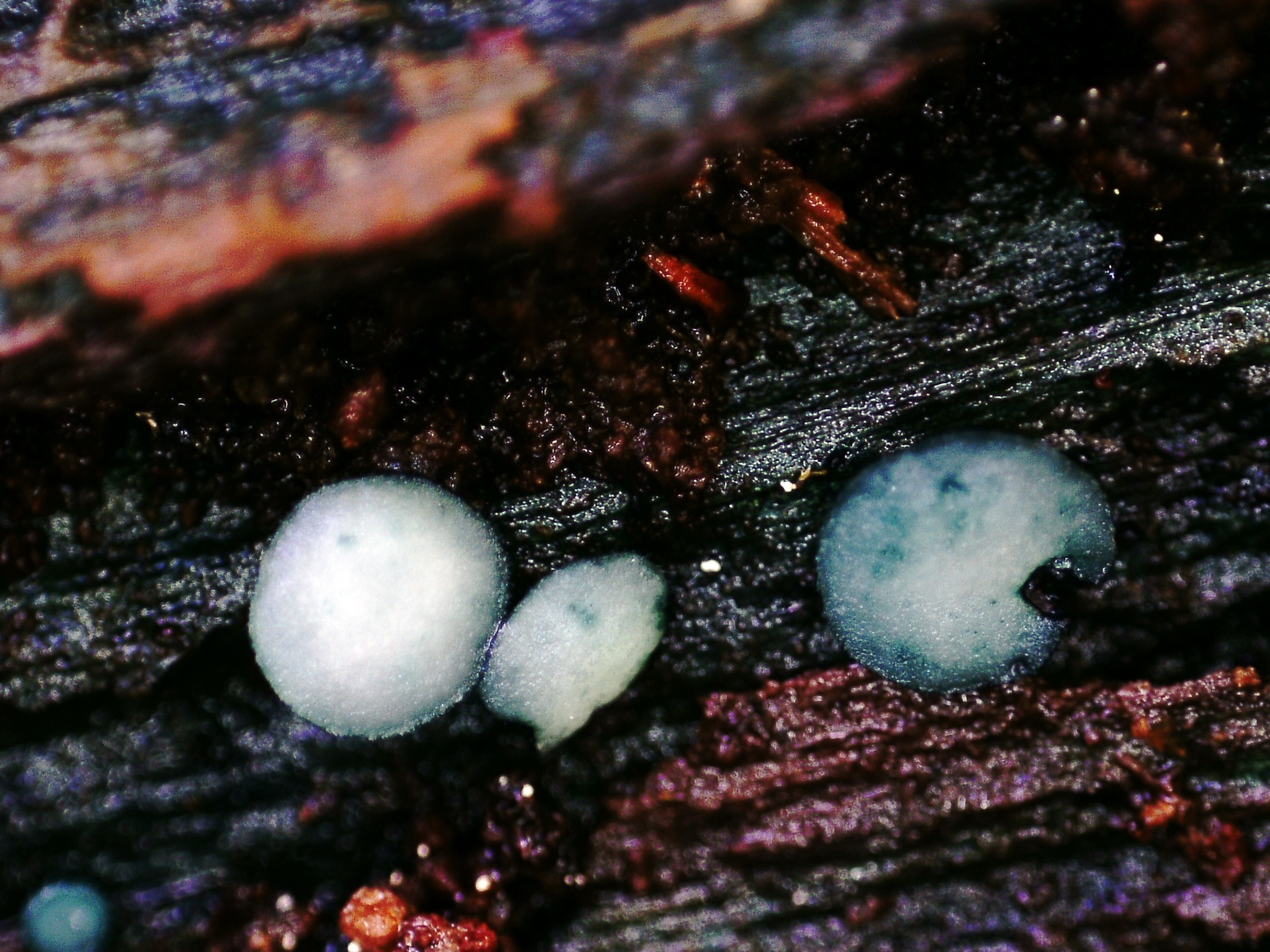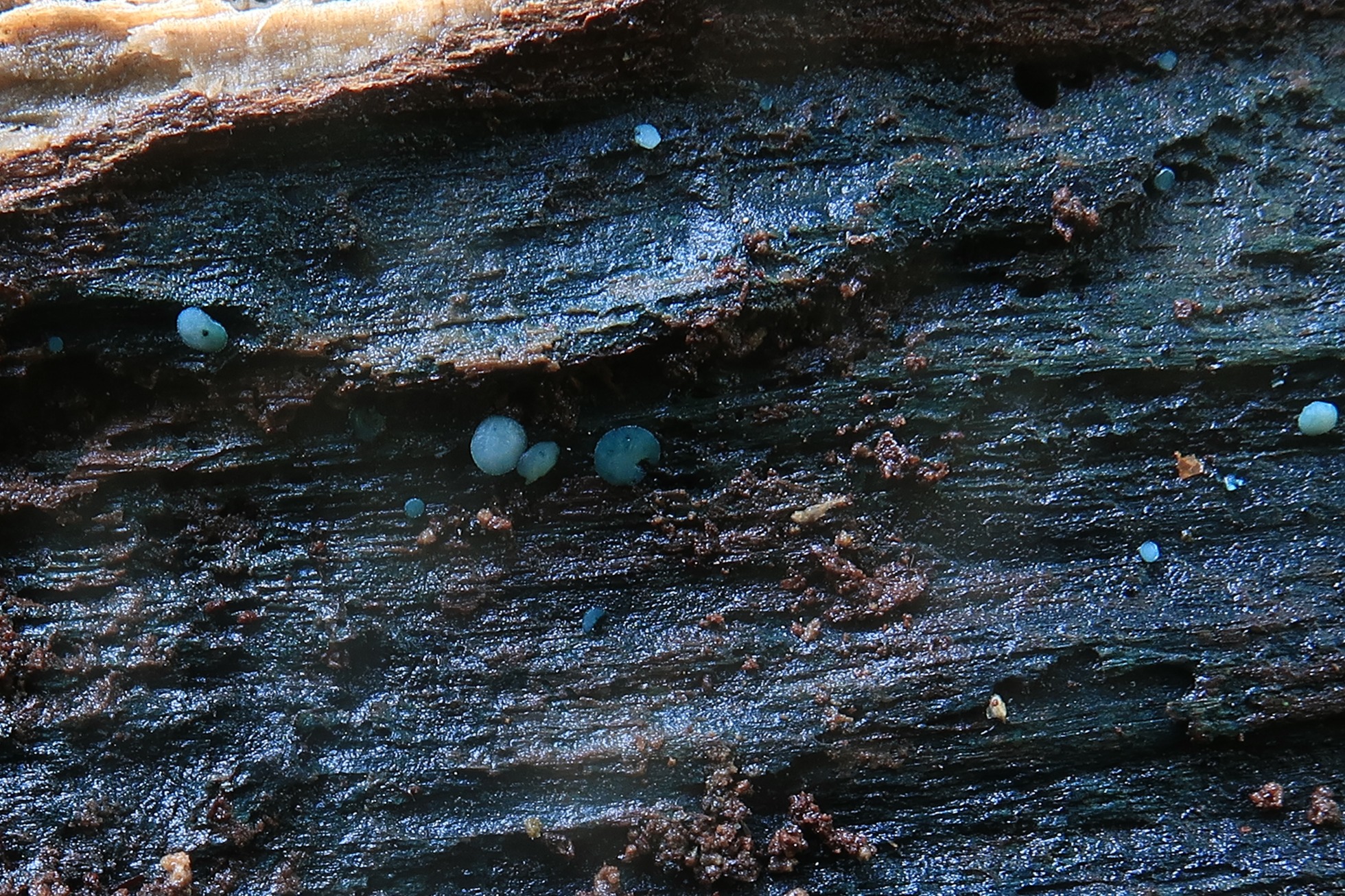 Esta especie por su aspecto y los tonos azulados, se podría confundir con primordios de Chlorocyboria, aunque se puede separar fácilmente por su microscopía completamente distinta.