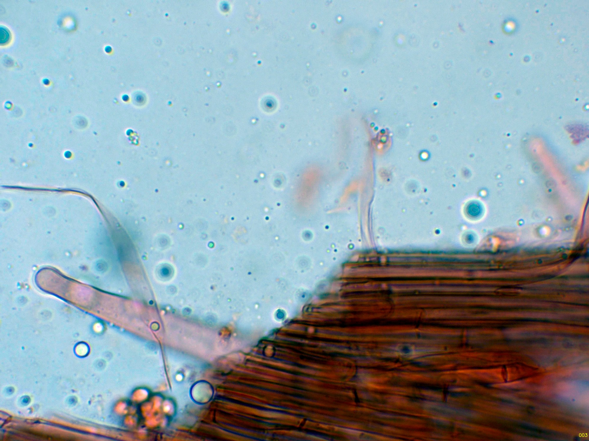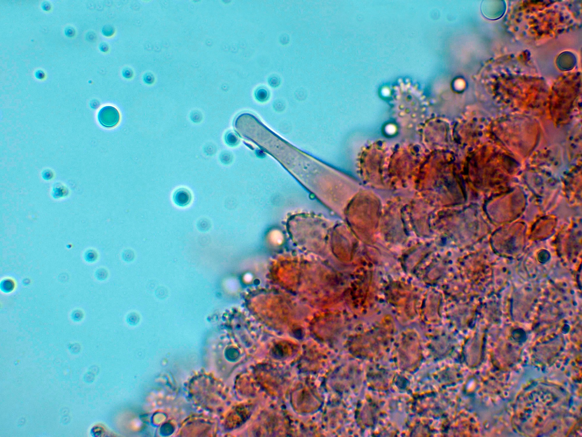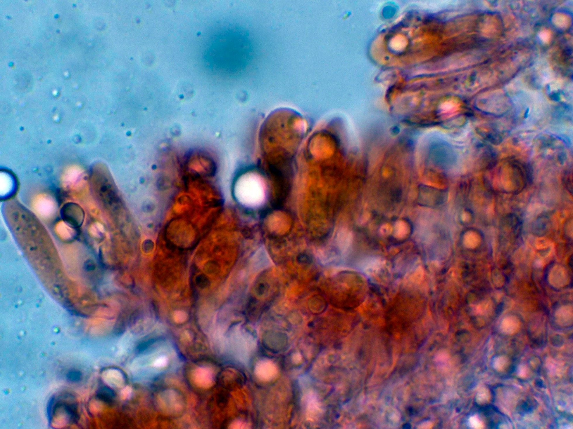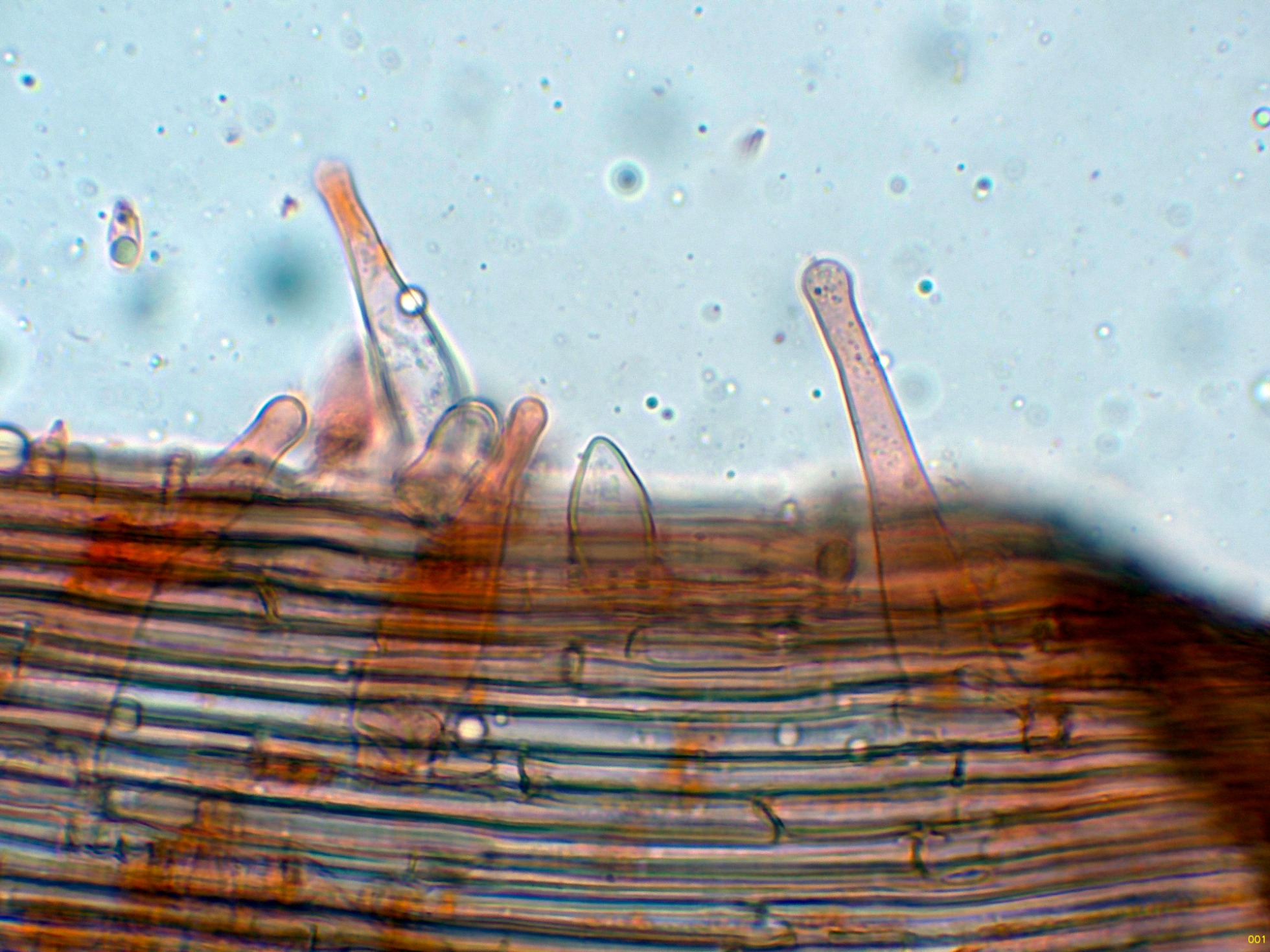 Dermatocistidios dispersos en el píleo con una morfología parecida a los caulocistidios.