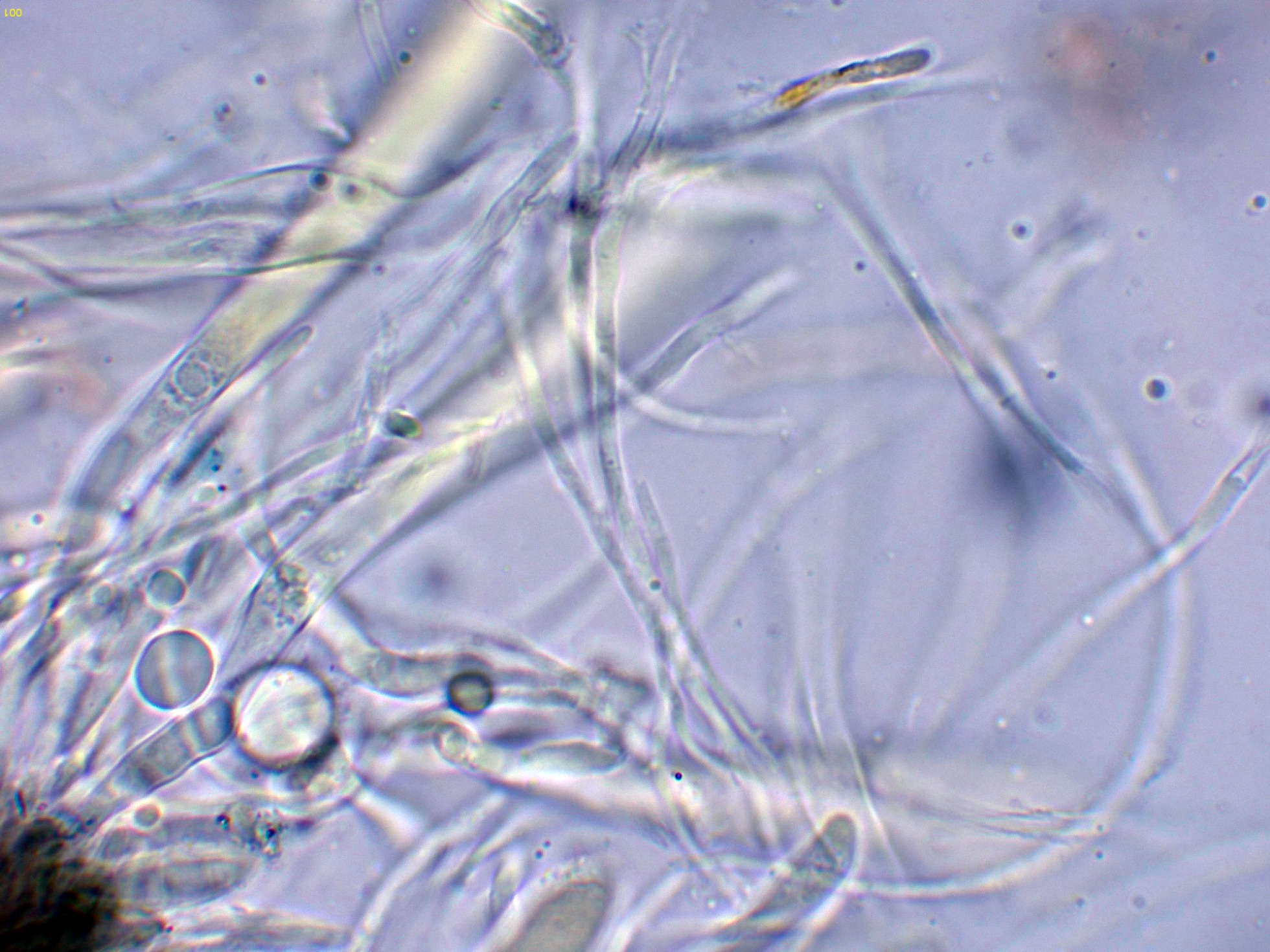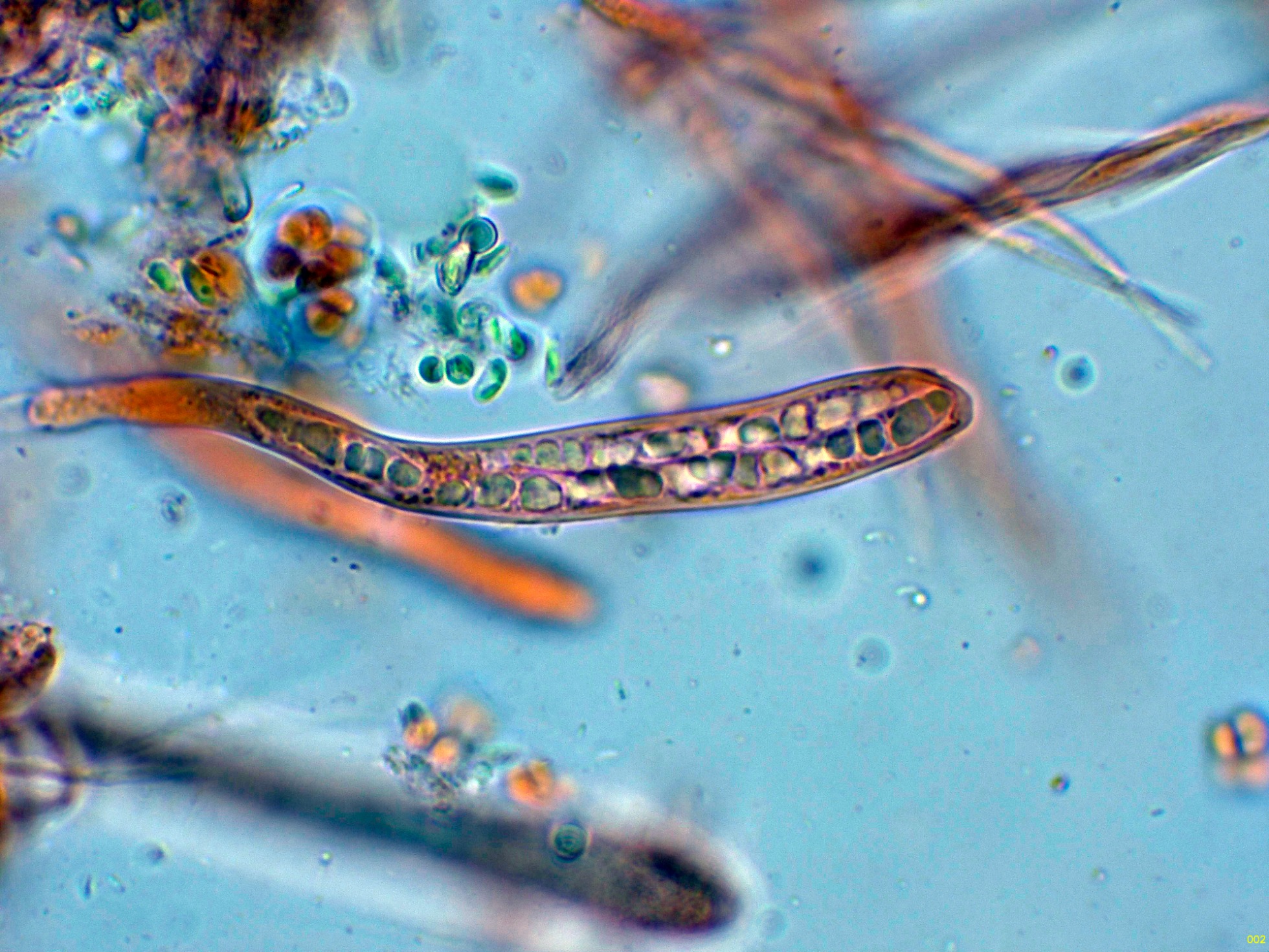 Ascosporas libres en las que se observa a su alrededor una vaina mucilaginosa.