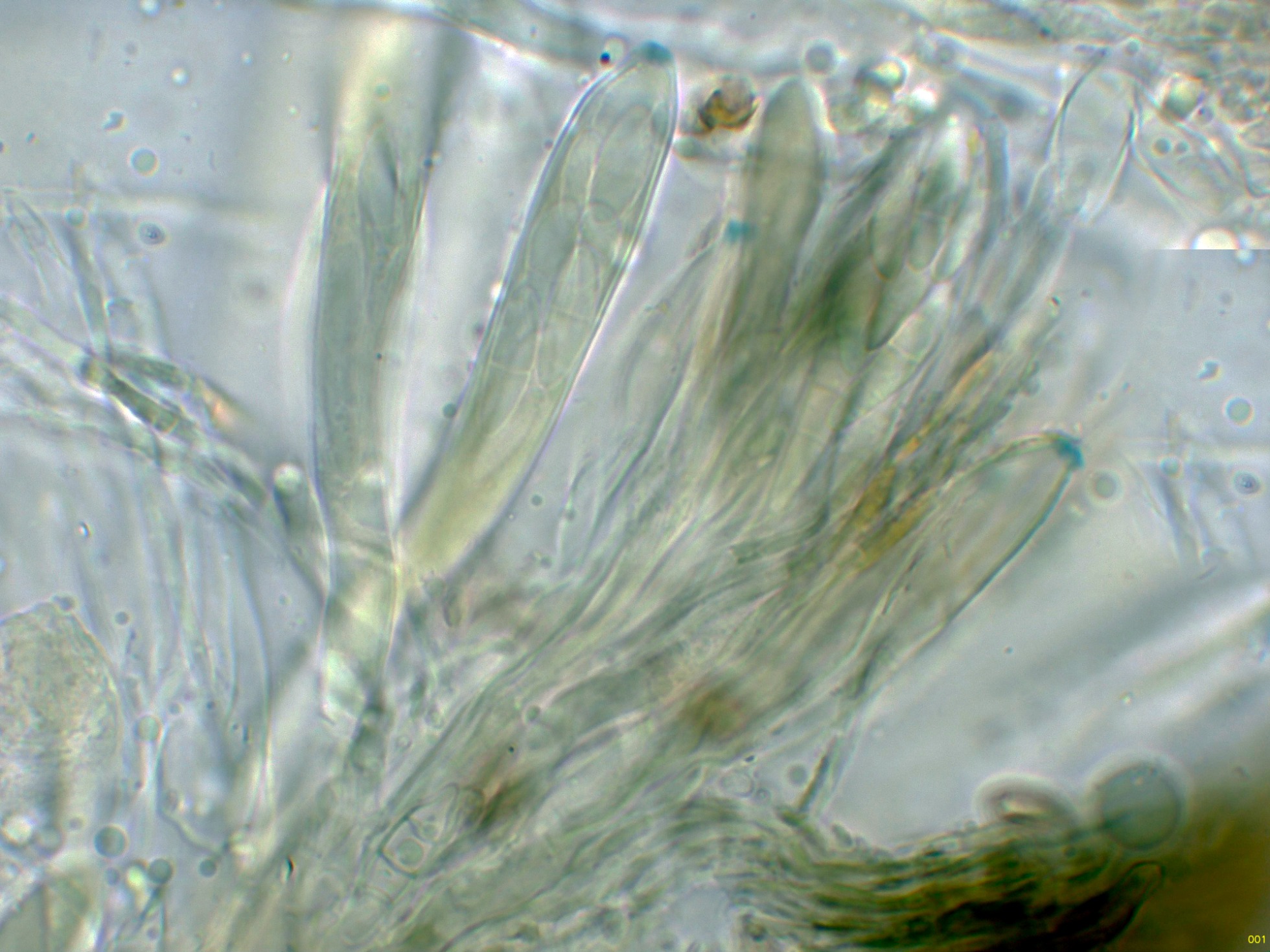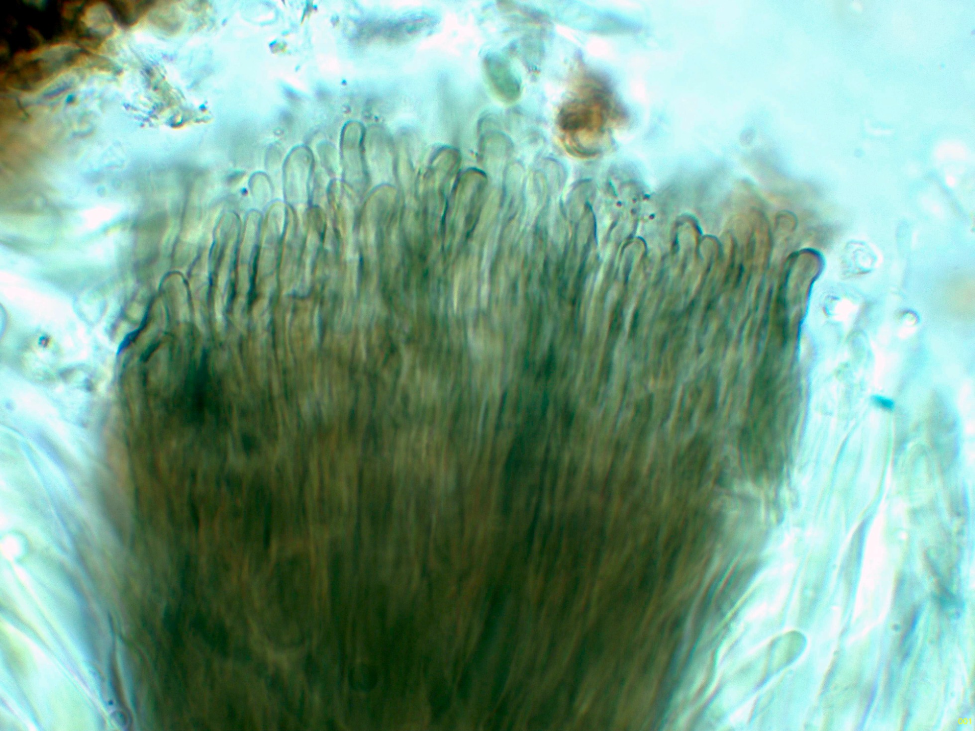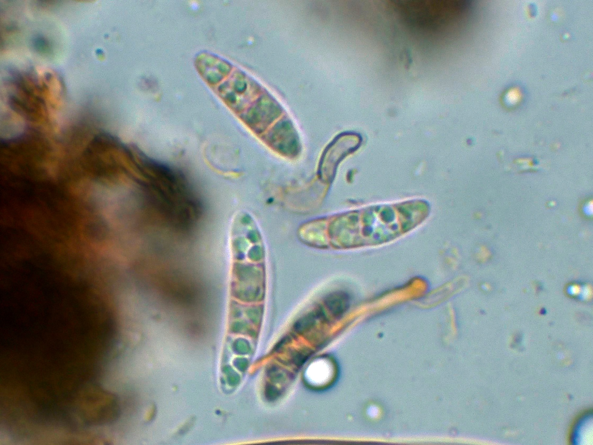 Observaciones: En un primer momento pensábamos que se trataba de la Durella connivens, la que tuvimos que descartar por la reacción IKI (+) de su aparato apical, atendiendo a este dato por unos instantes consideramos a la Durella melanochlora, la que asimismo tuvimos que descartar por las muy reducidas medidas esporales de esta última, según bibliografía de 13-16 x 5-6 µm.,