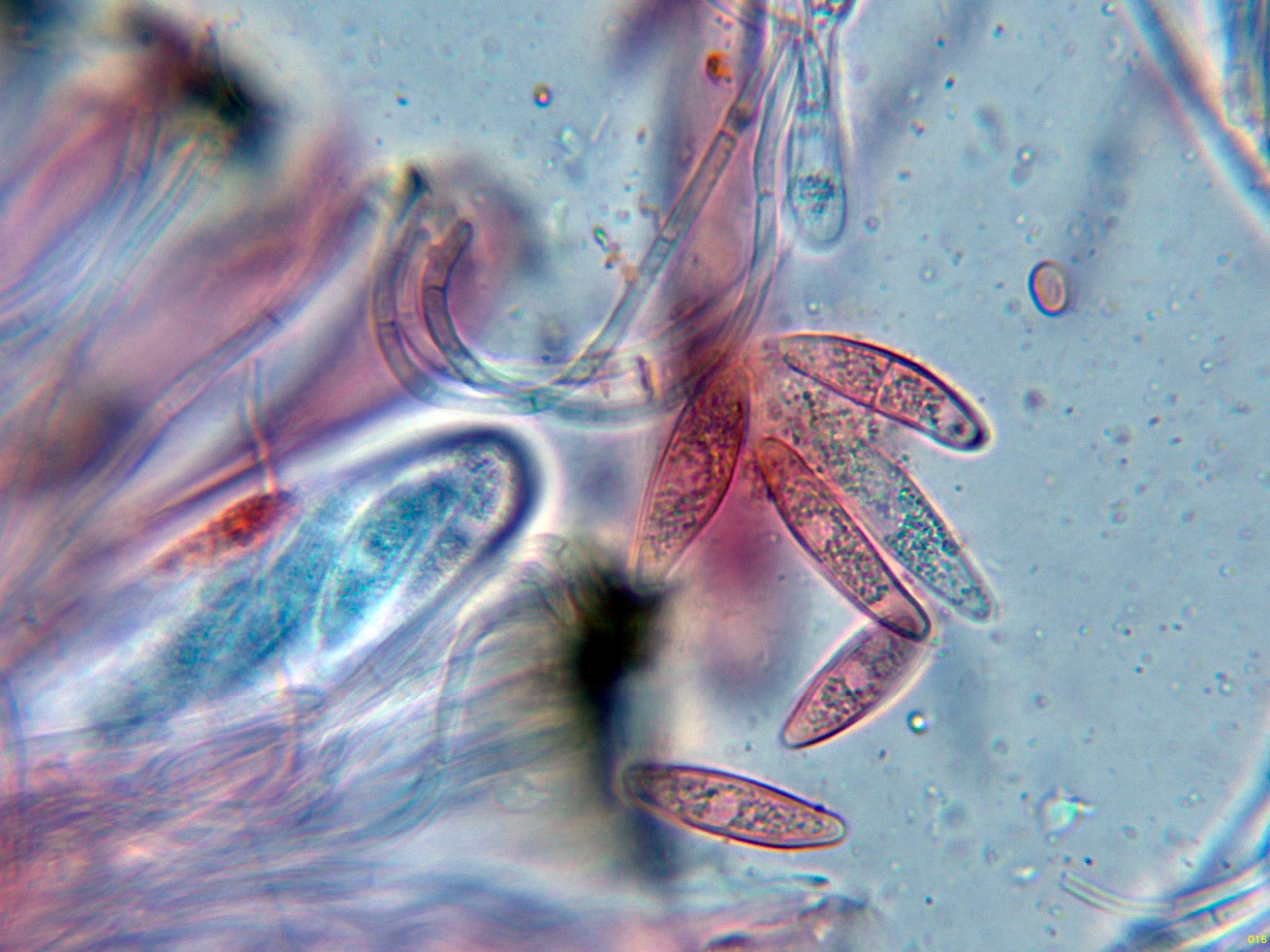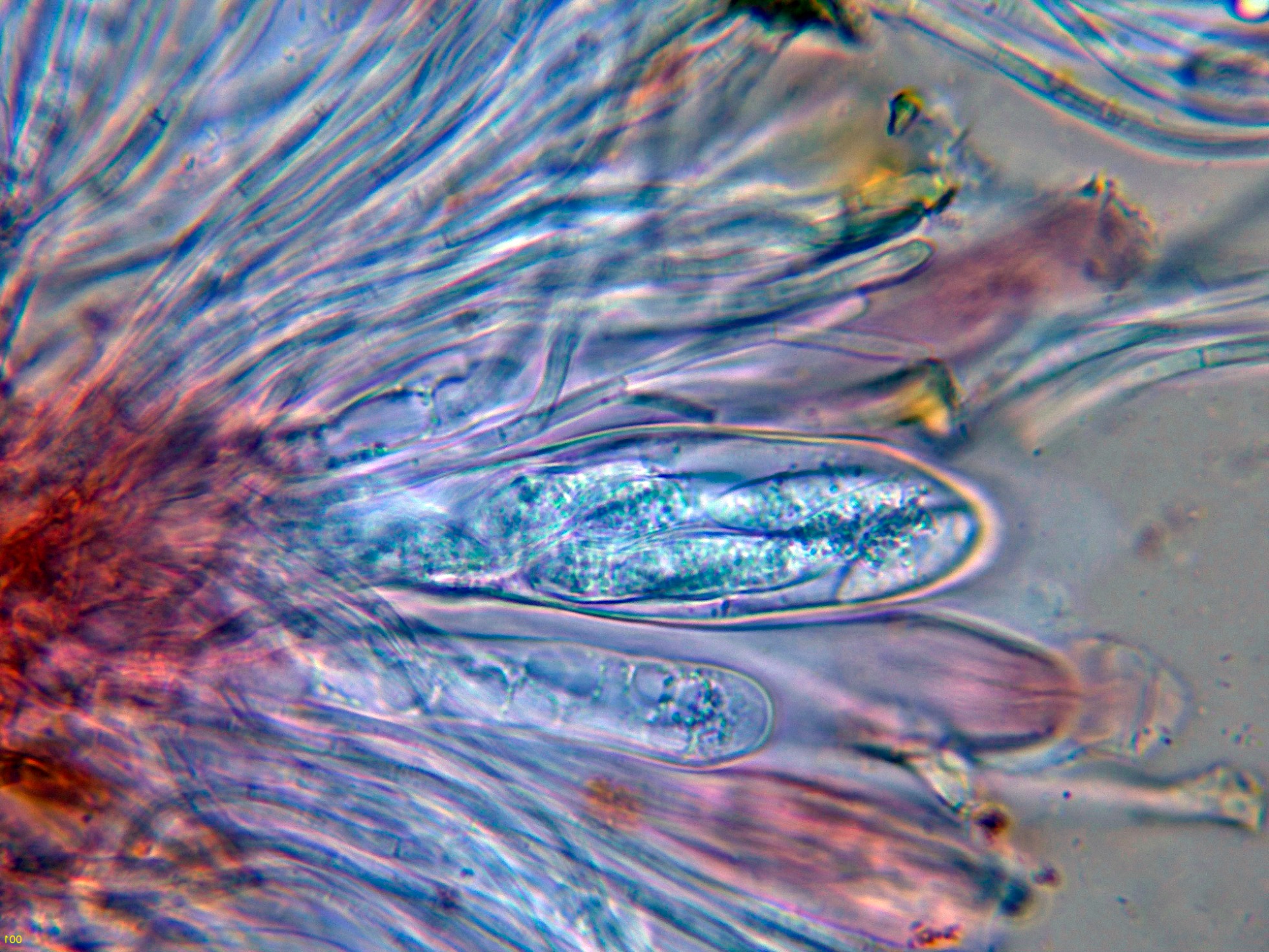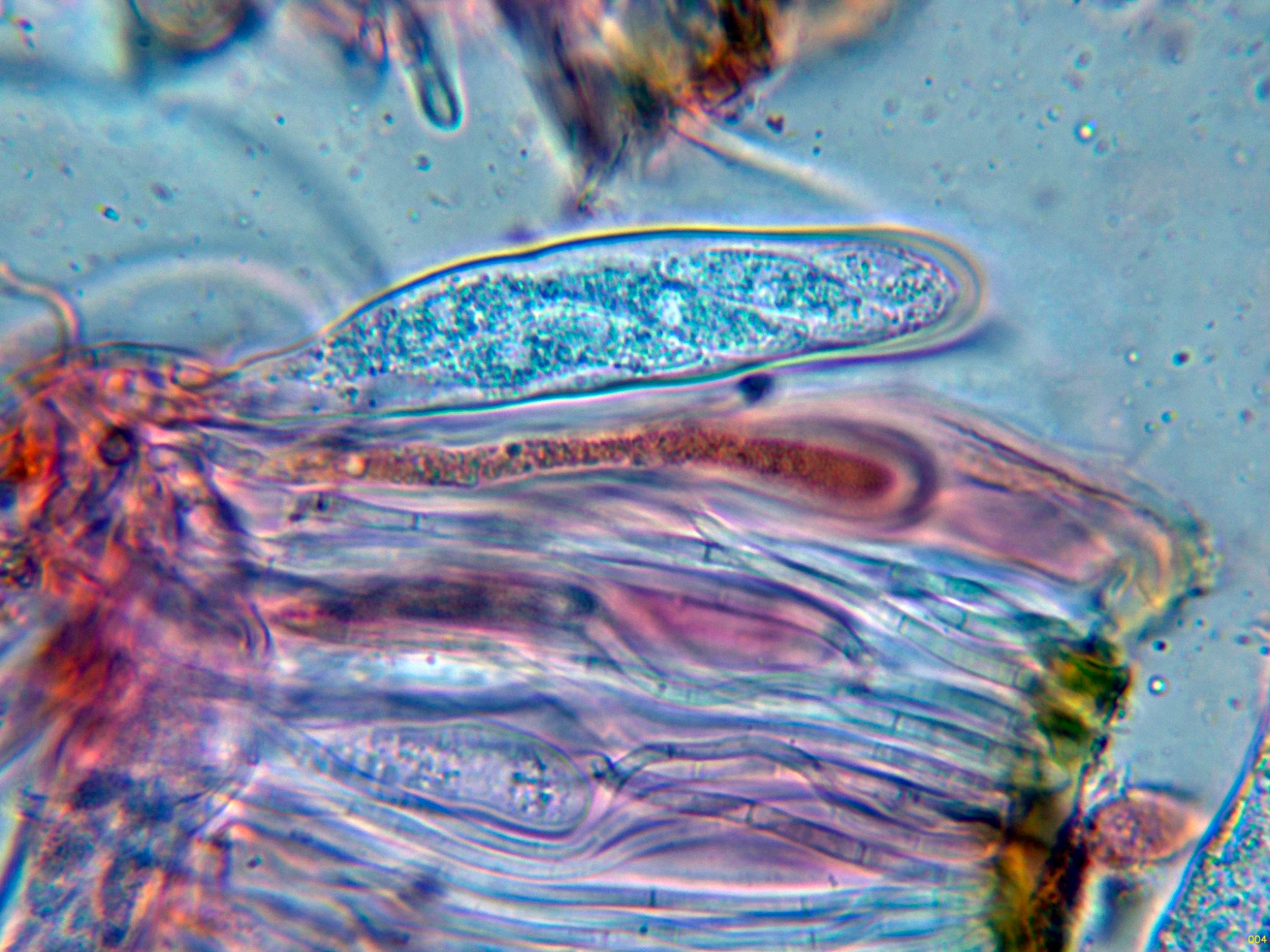 El himenio en KOH, sin ninguna reacción significativa.