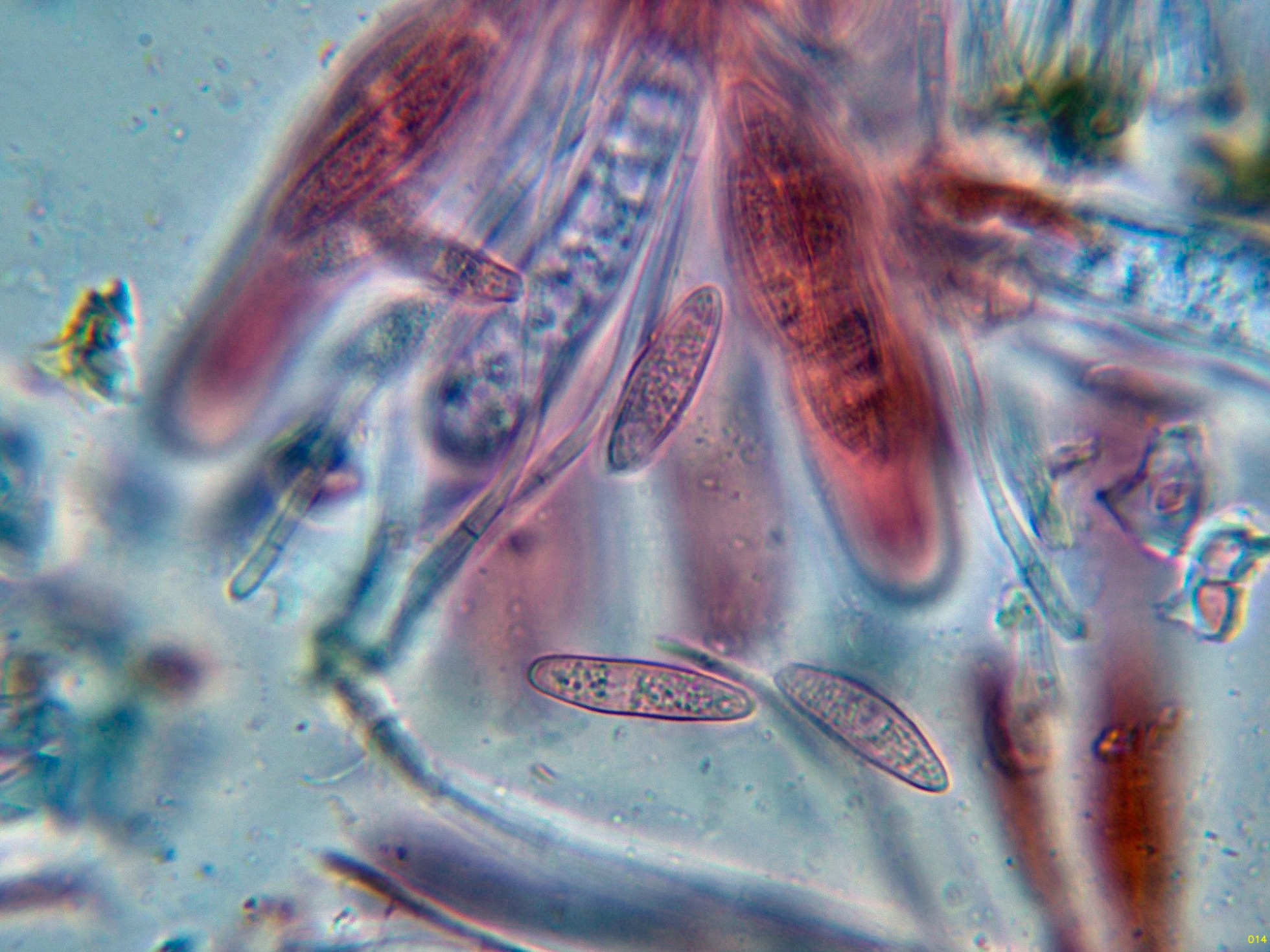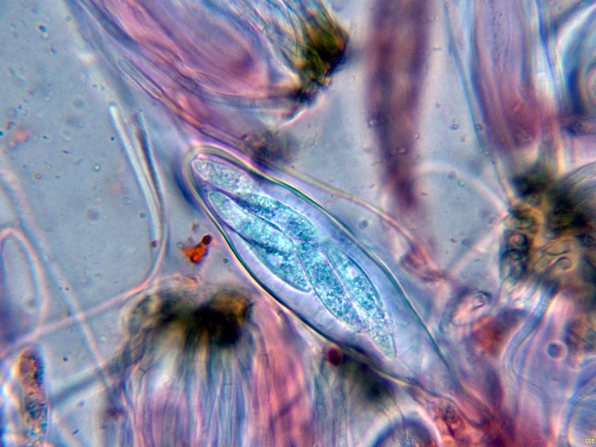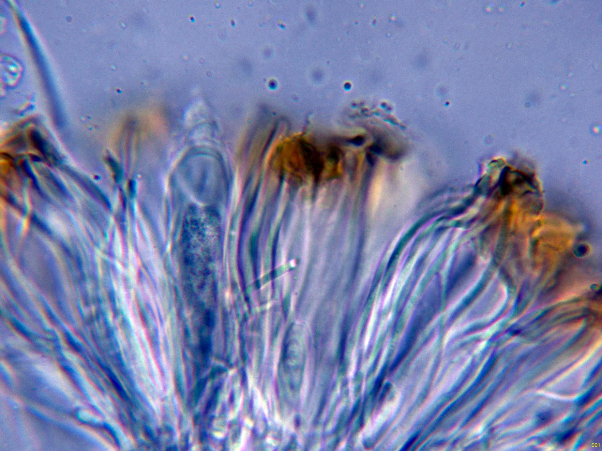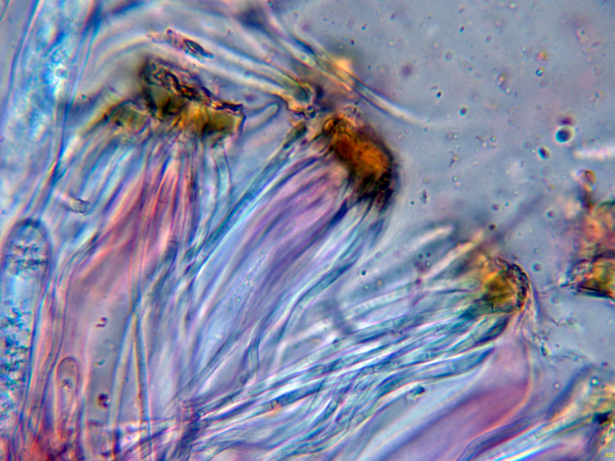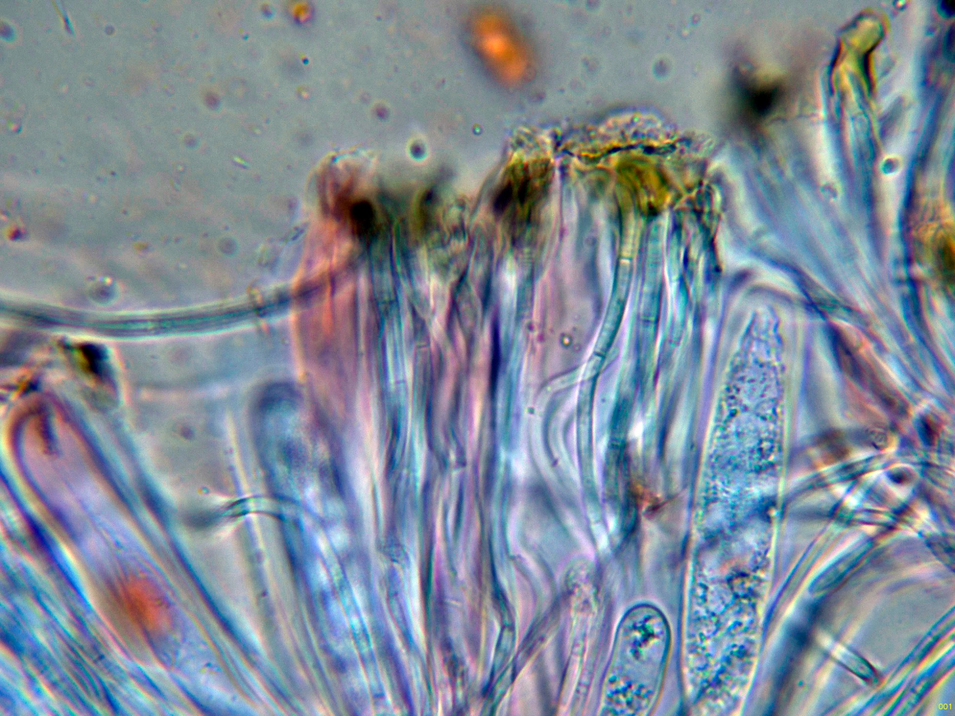 Las paráfisis, con materia amorfa oscura en el ápice.