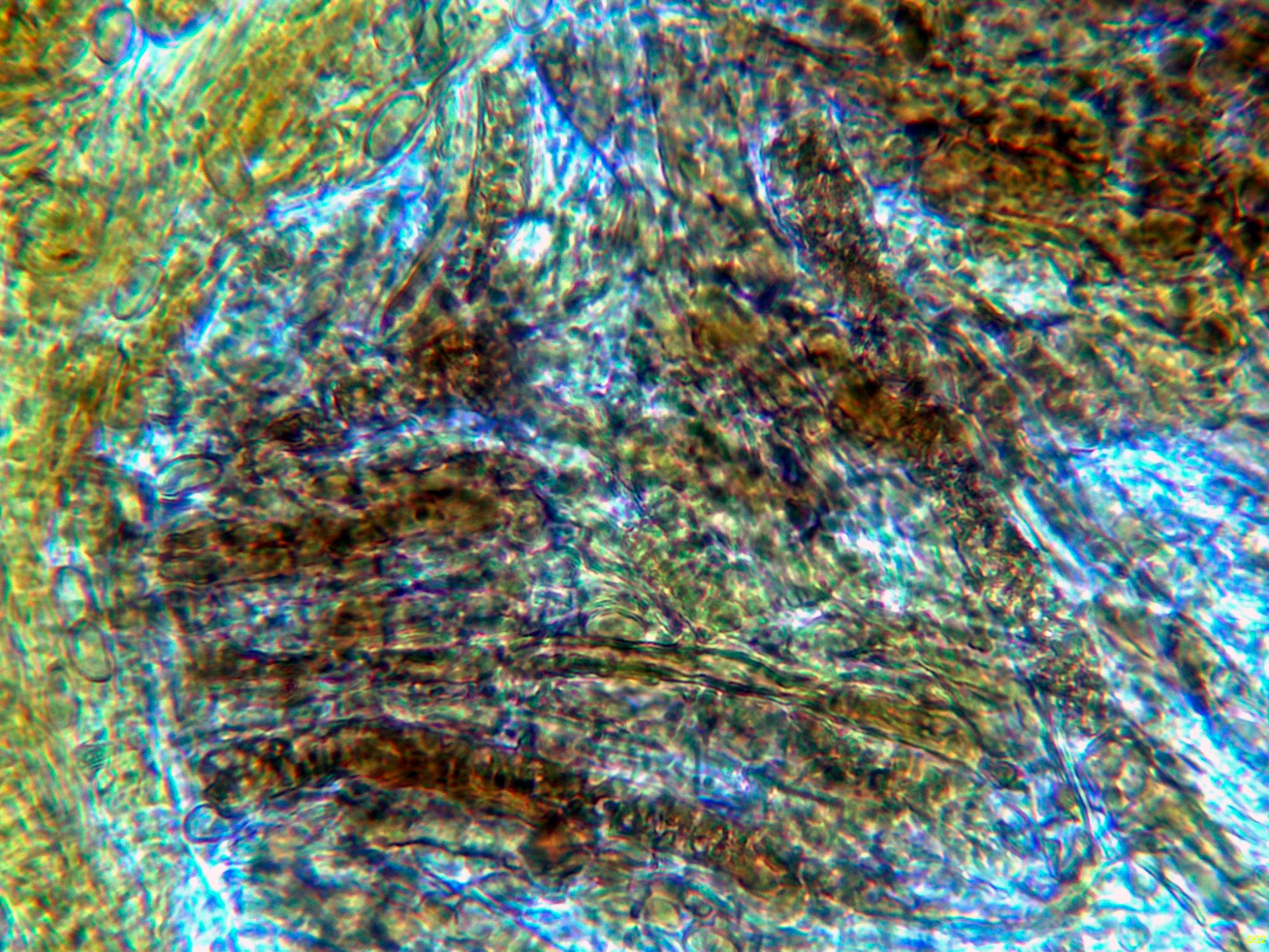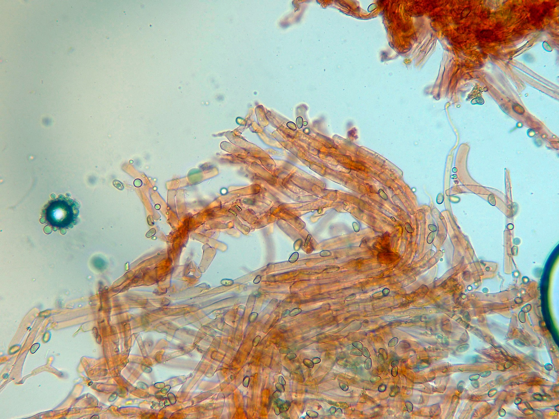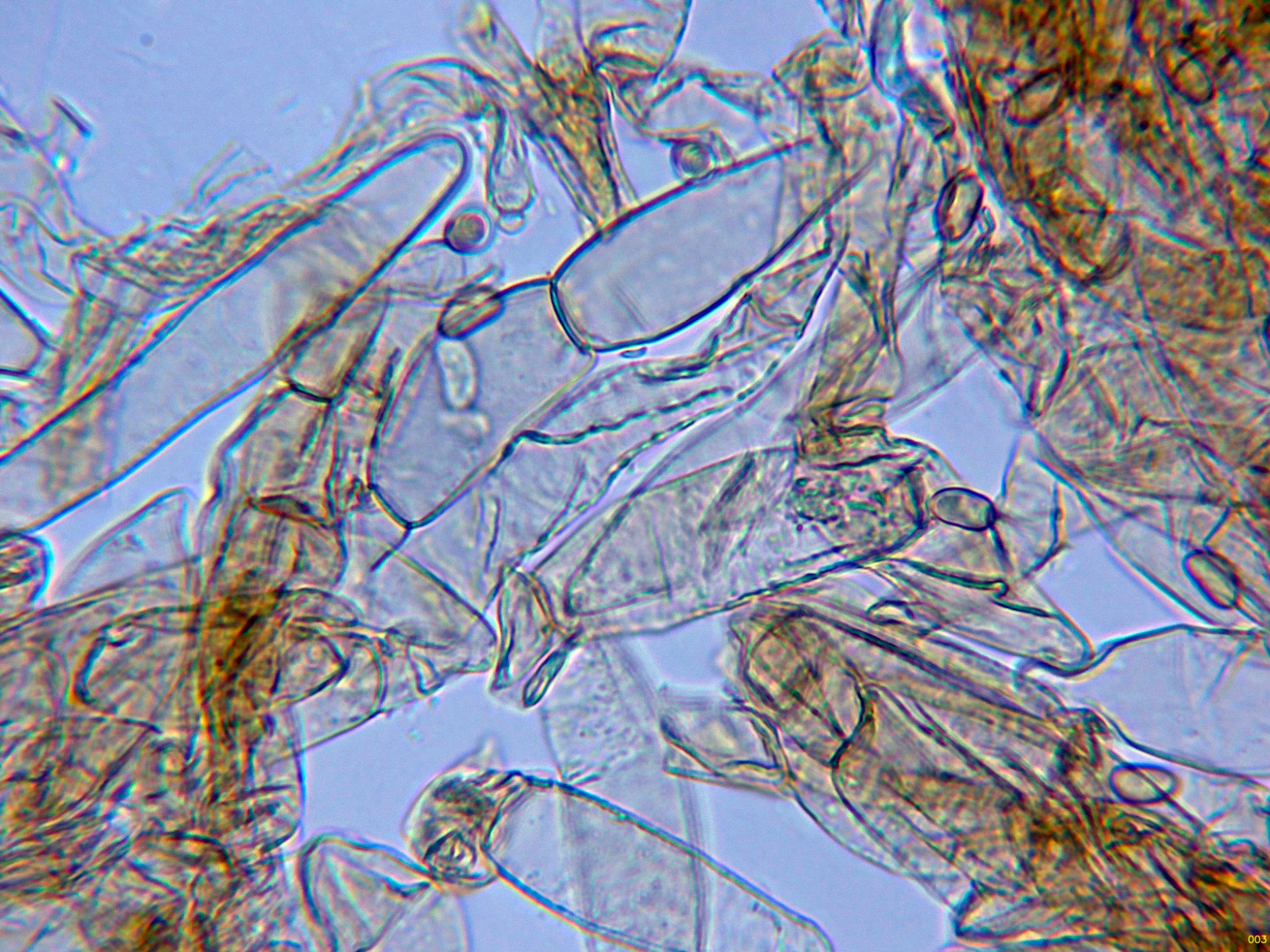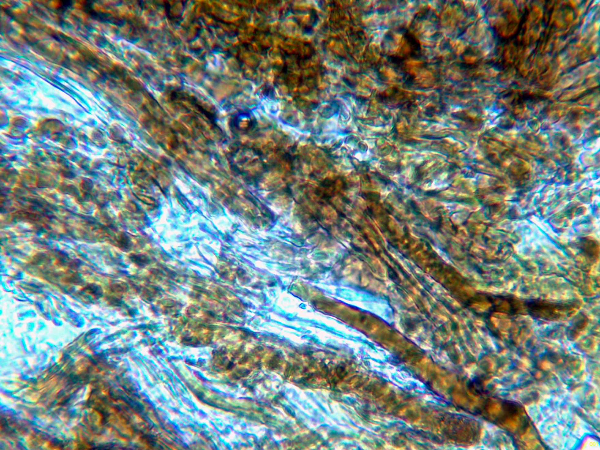 Las hifas de las escamas, algo más estrechas y fuertemente pigmentadas.