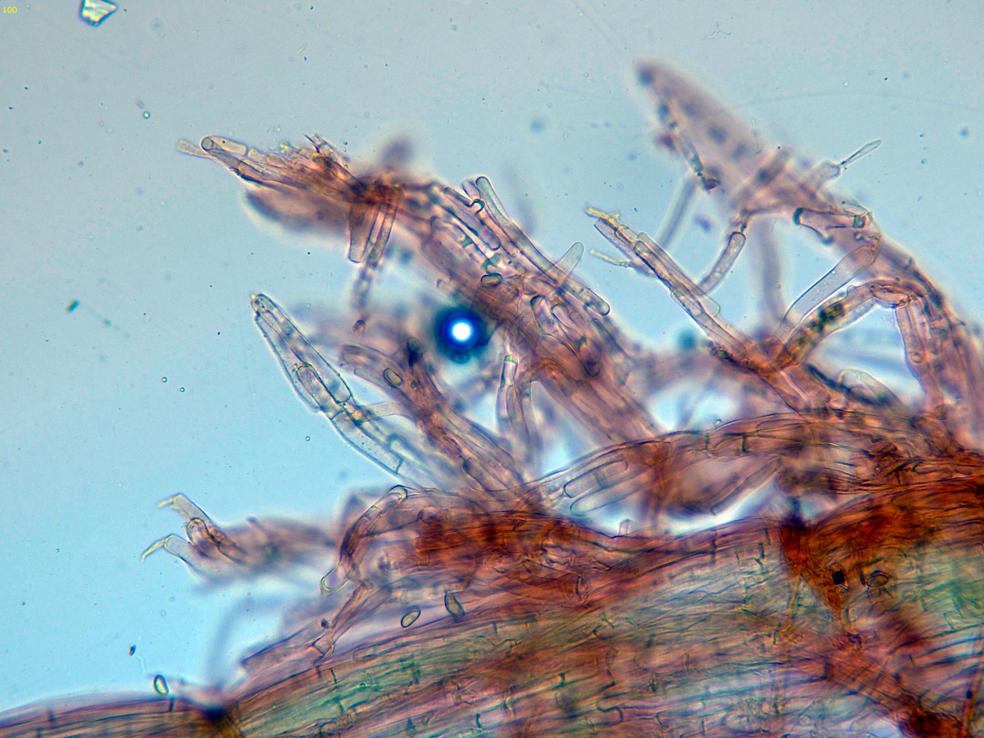 Estas hifas a modo de caulocistidios a 400 aumentos.