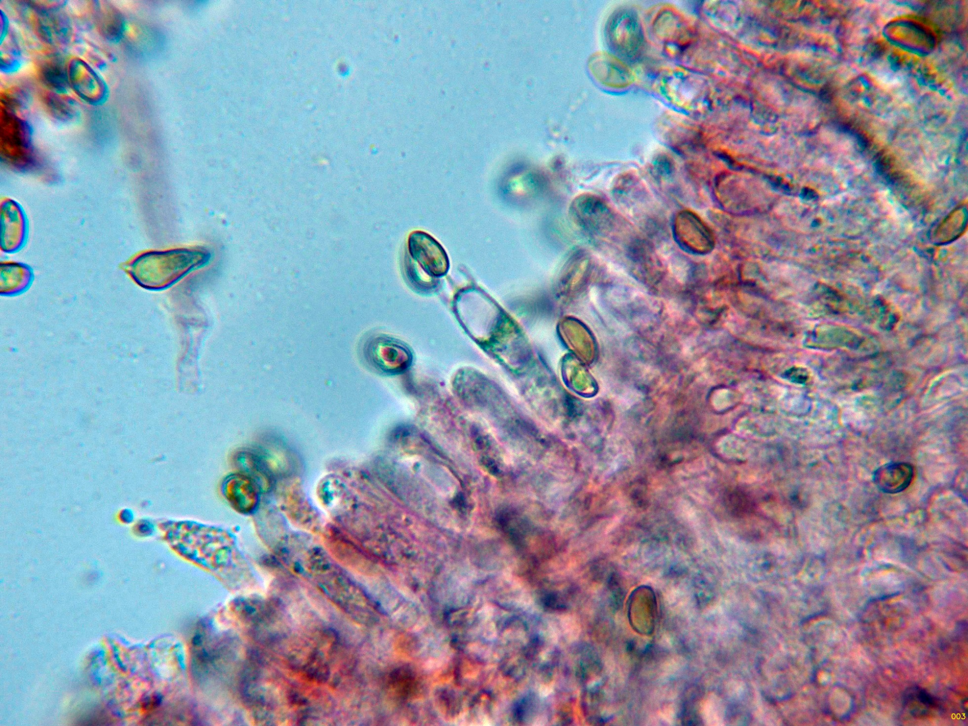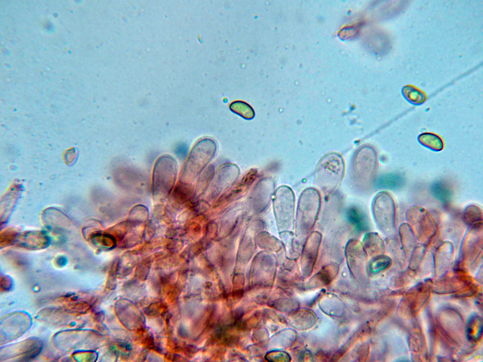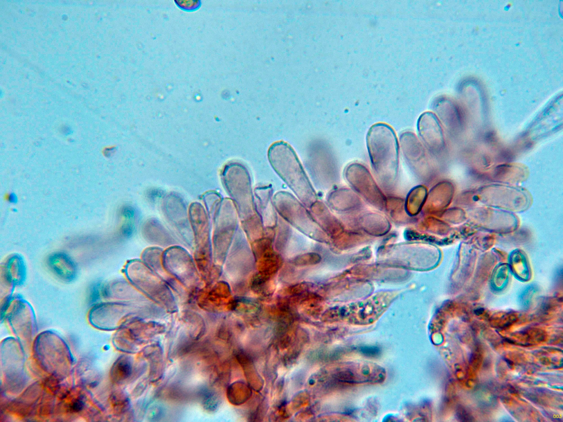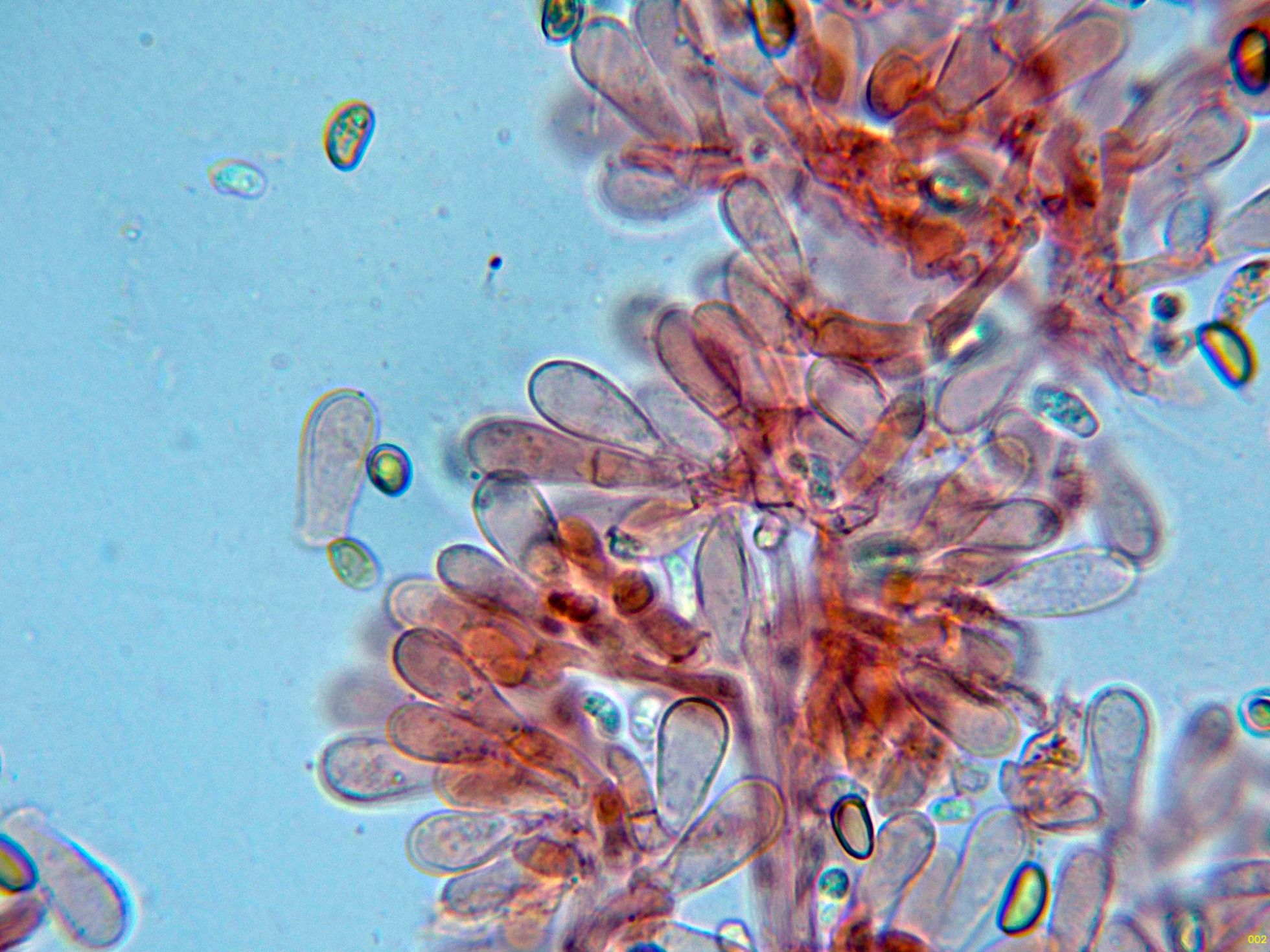 También de manera aislada algunos basidios bispóricos, estos serían los responsables de alguna espora anormalmente grande.