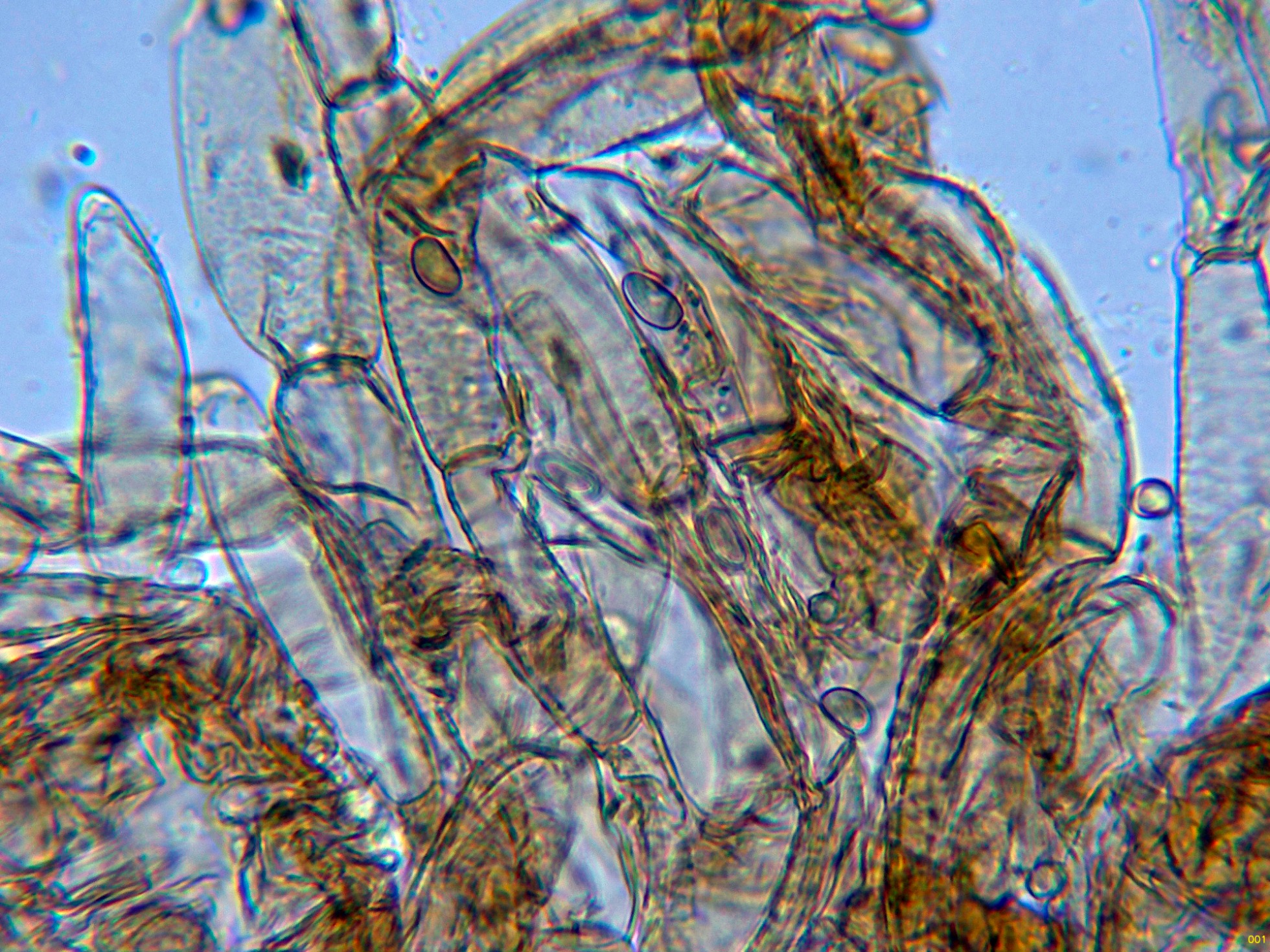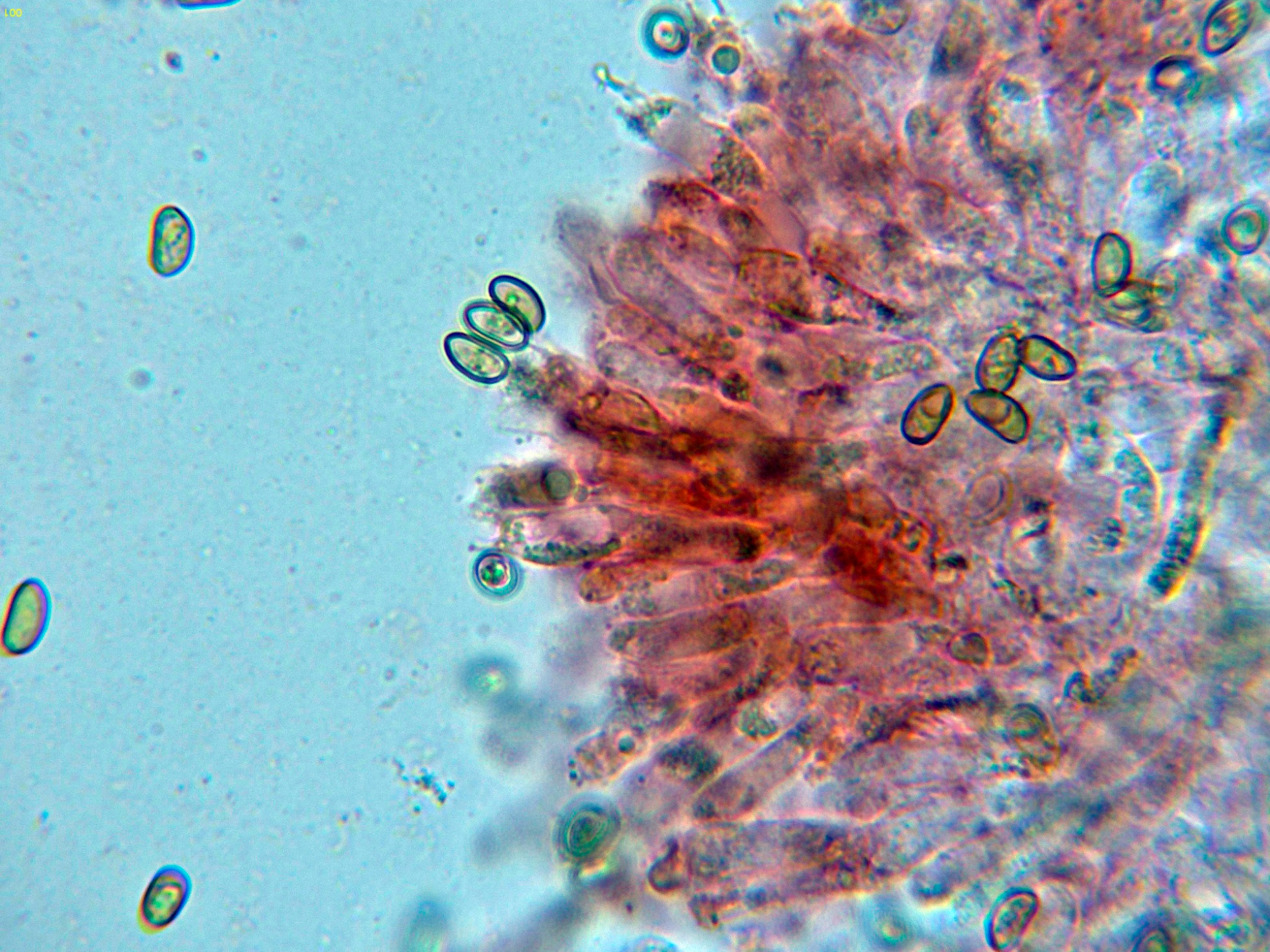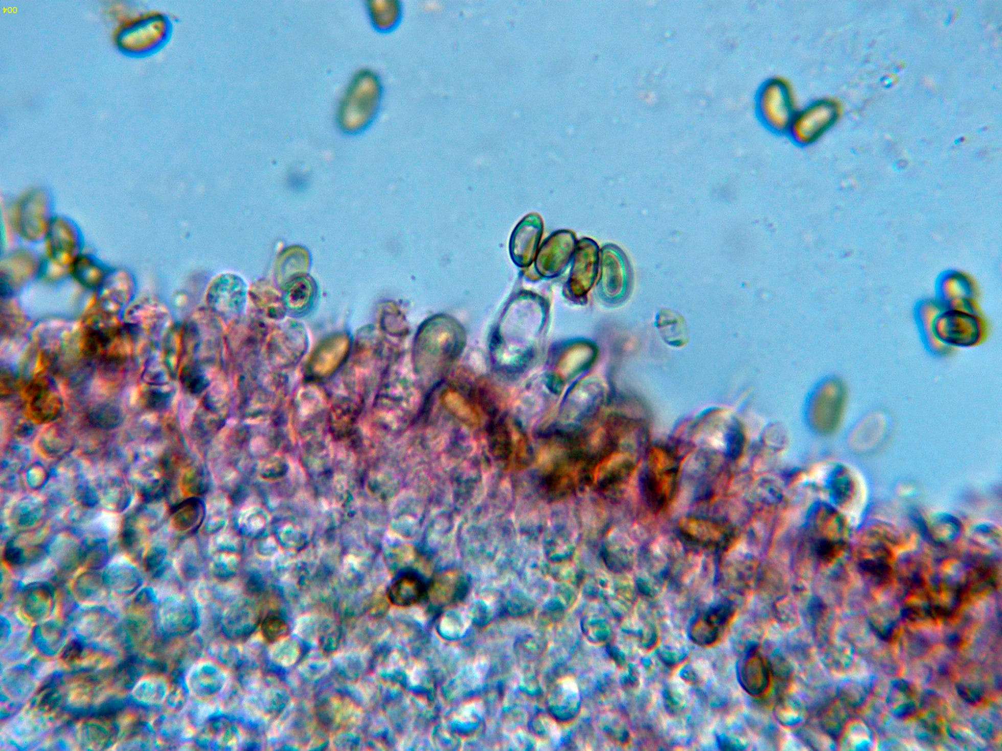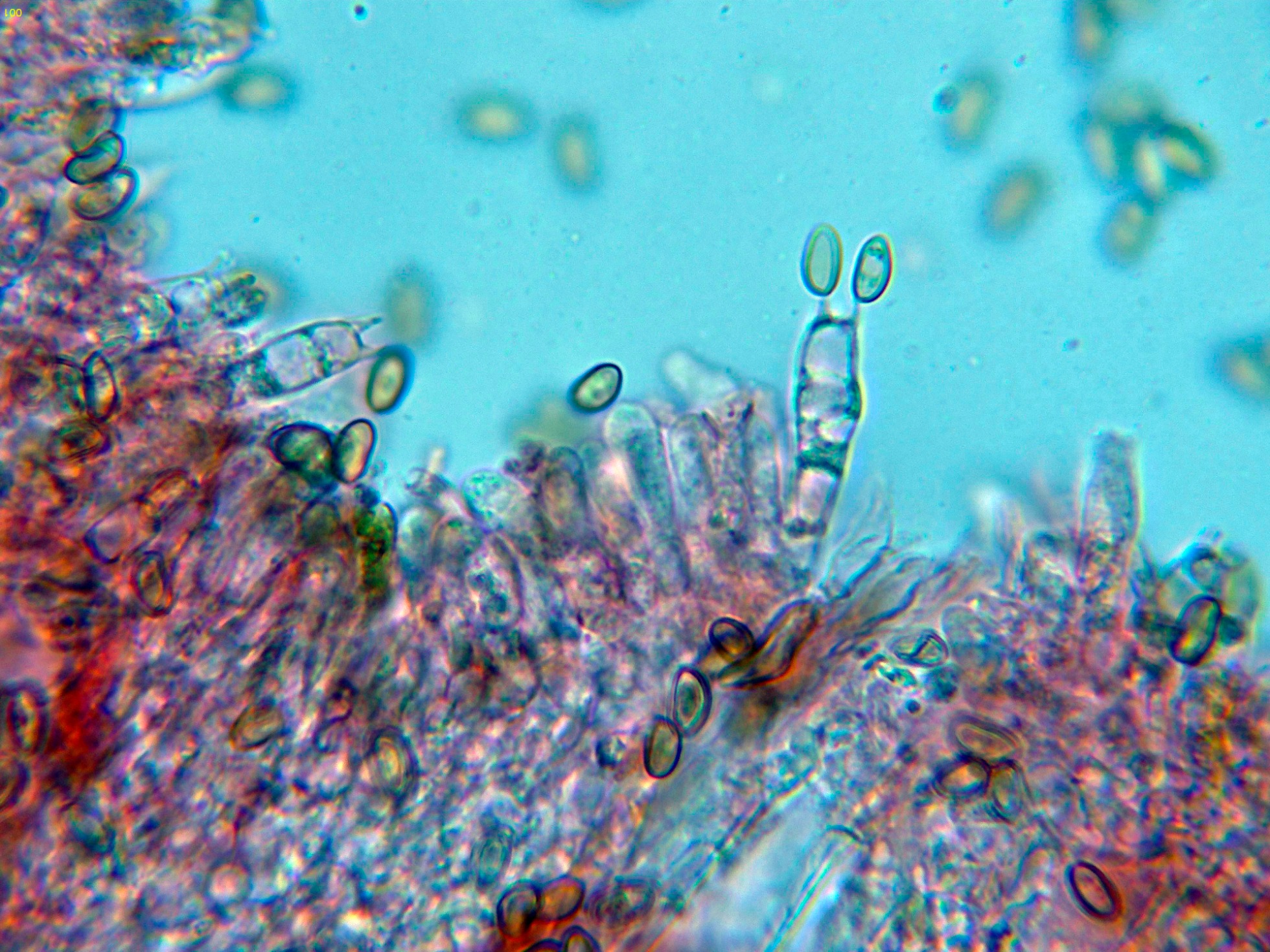 También de manera aislada algunos basidios bispóricos, estos serían los responsables de alguna espora anormalmente grande.