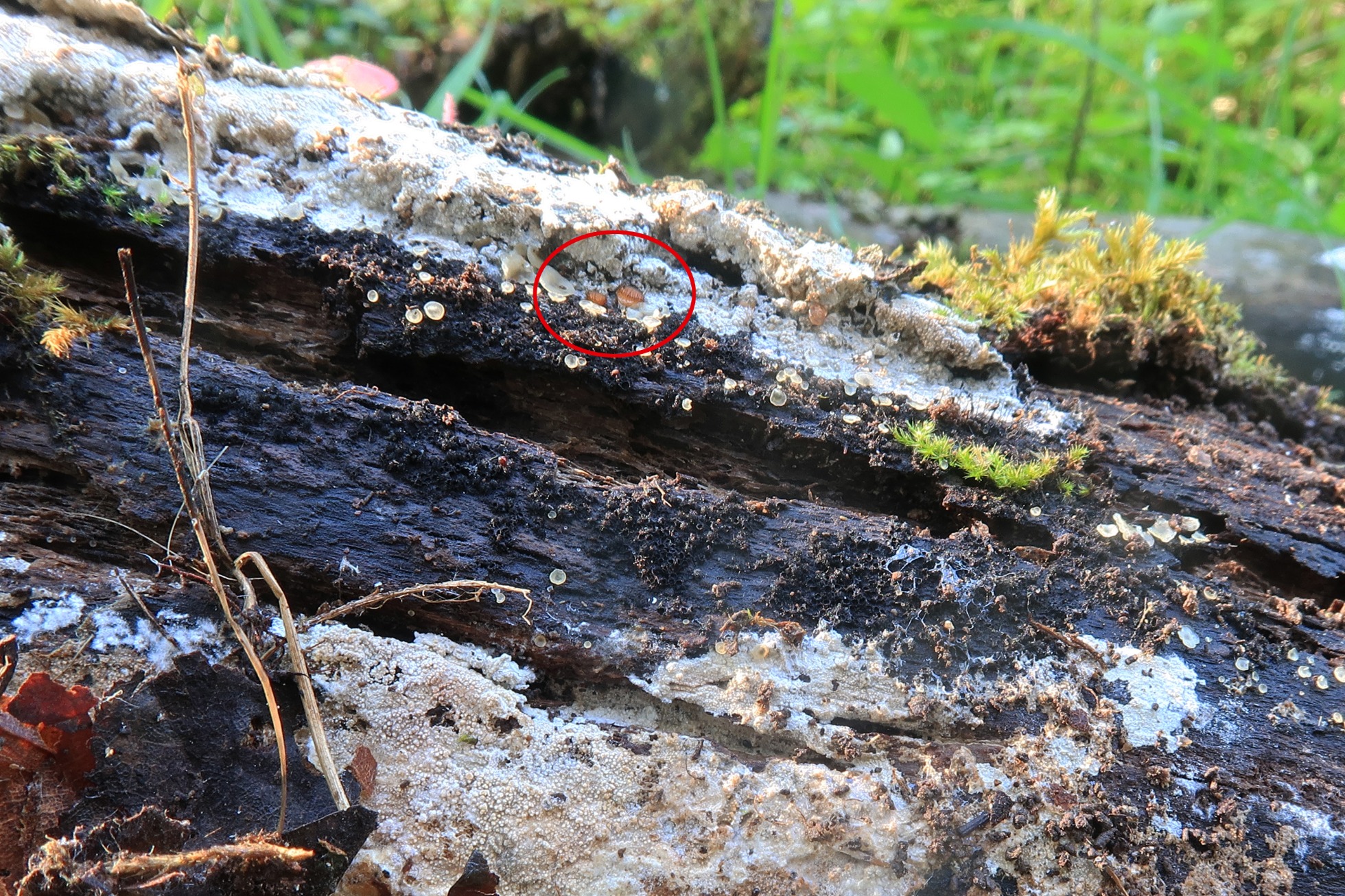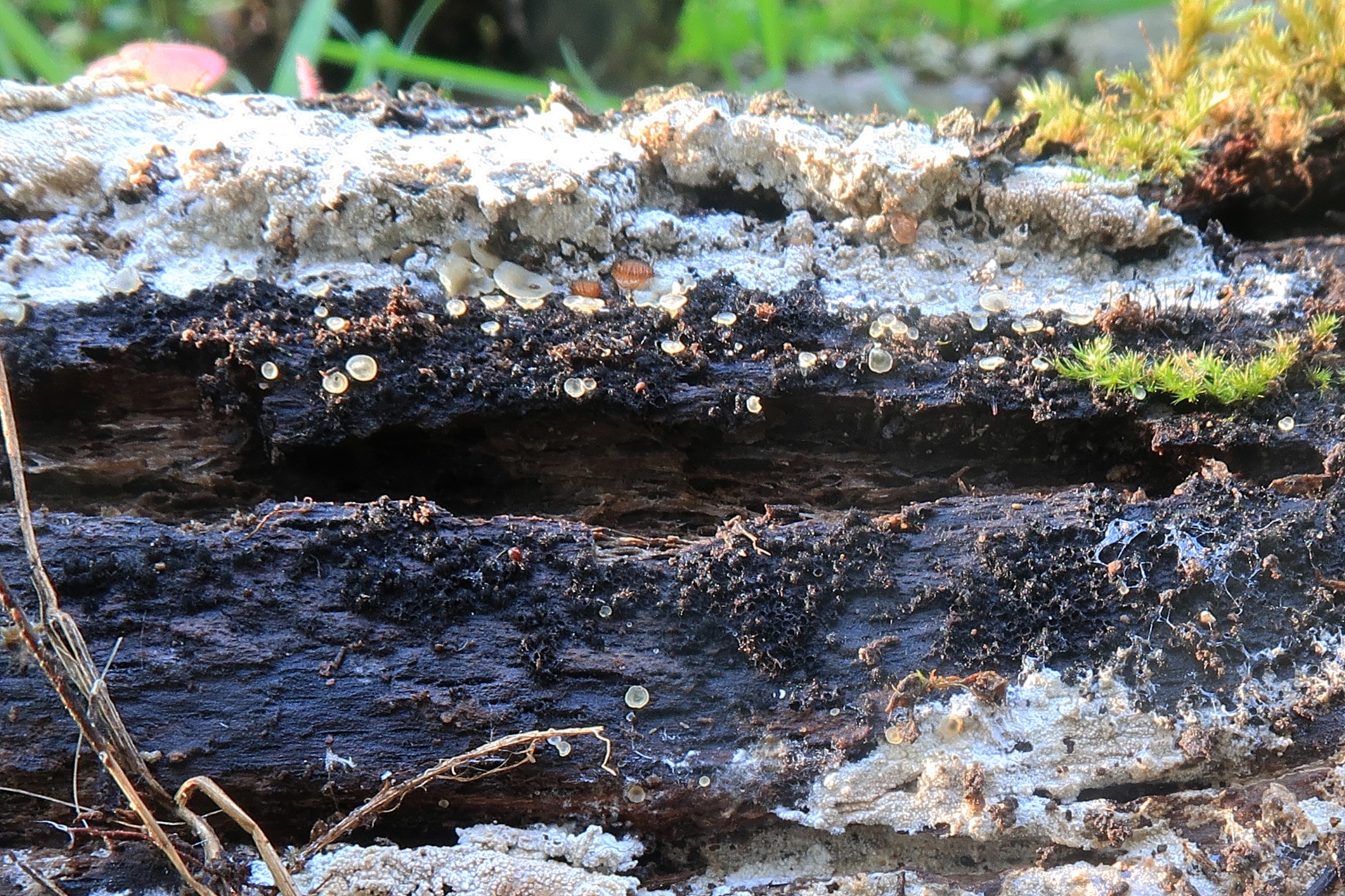 Una diminuta Scutellinia compartiendo espacio con unos ejemplares de Orbilia, sobre un tronco tumbado de haya.