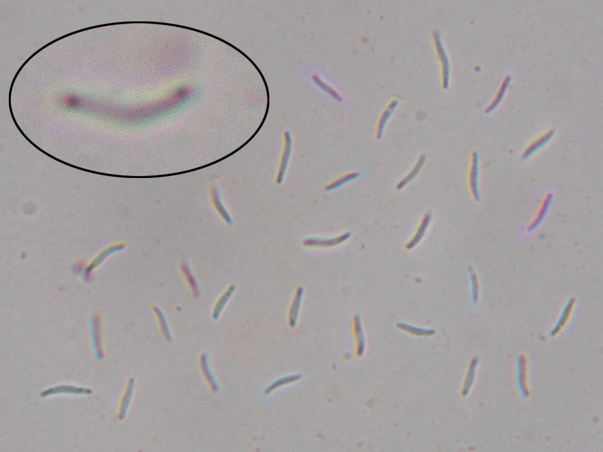 Y las ascosporas libres, entre ligeramente curvadas a helicoidales, con gútulas más oscuras especialmente en los extremos.