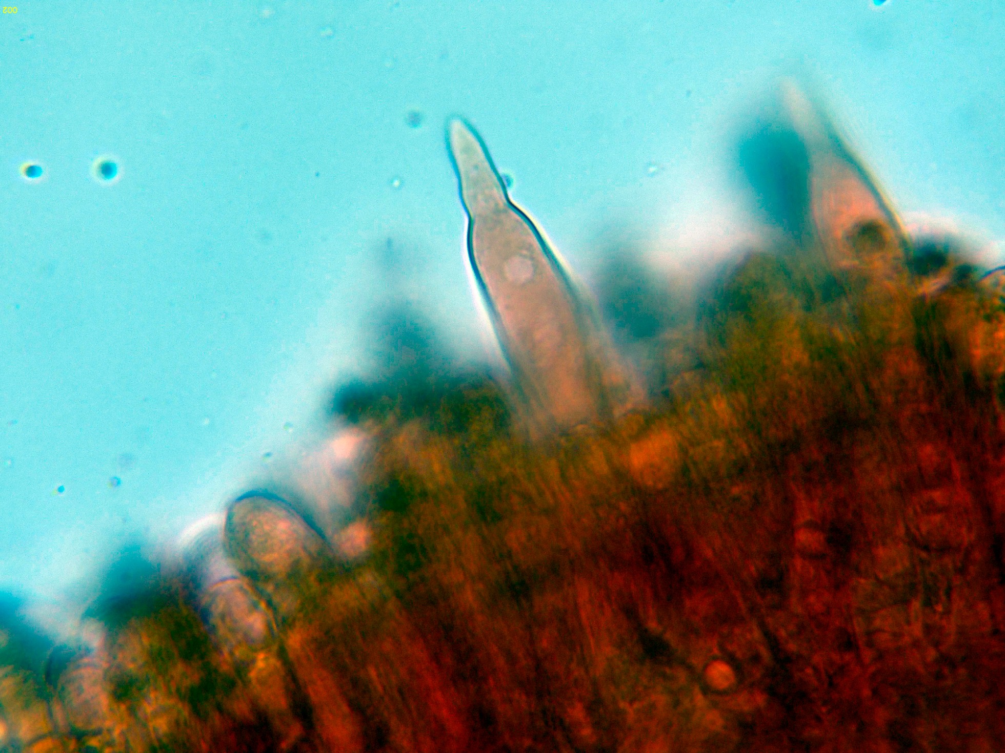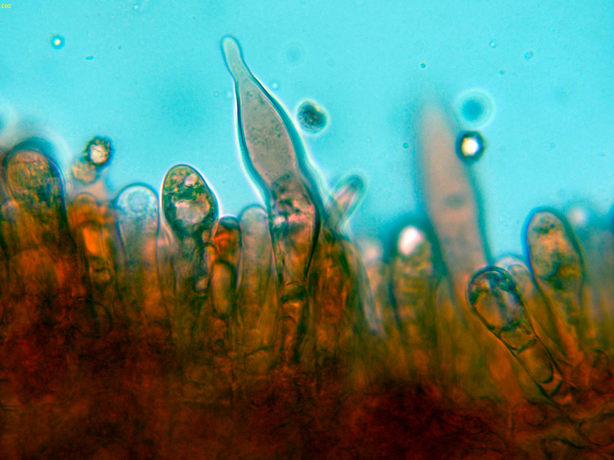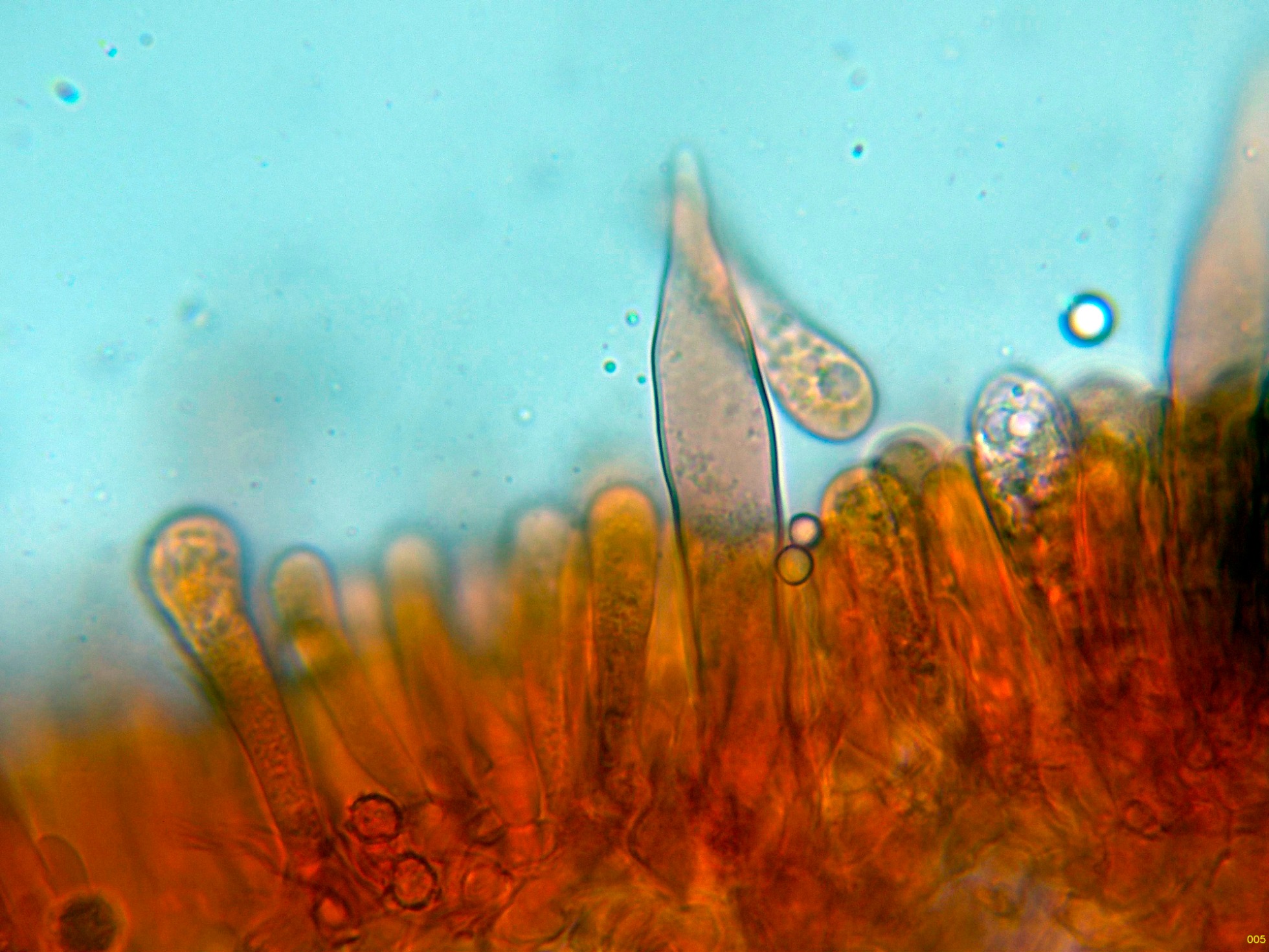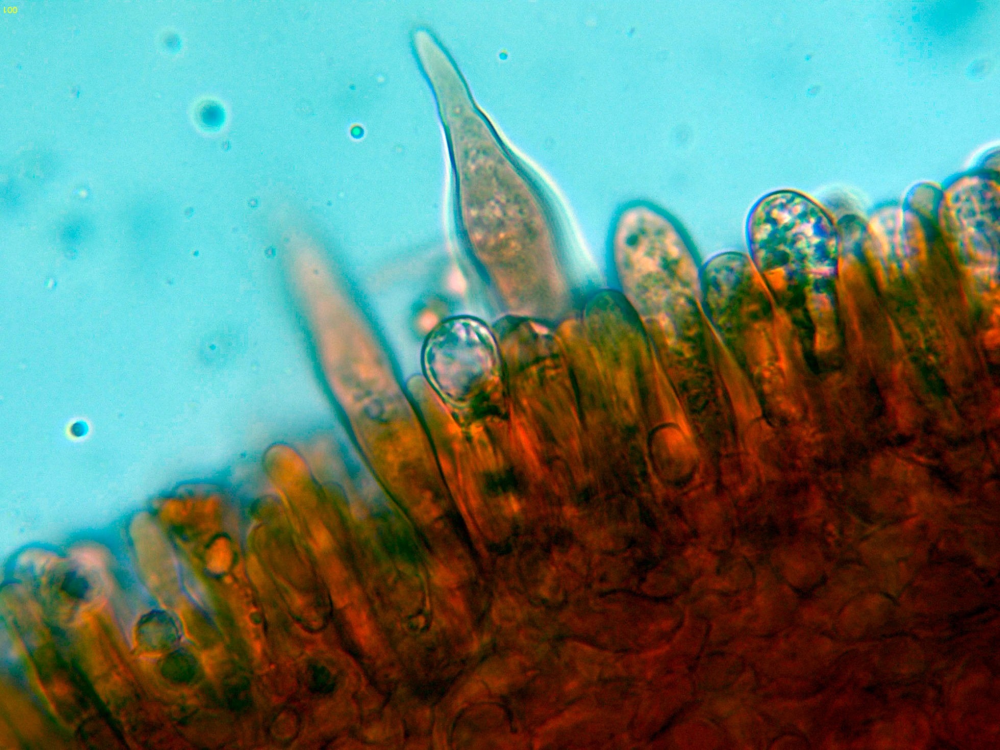 Pleurocistidios también dispersos pero abundantes en la cara laminar.