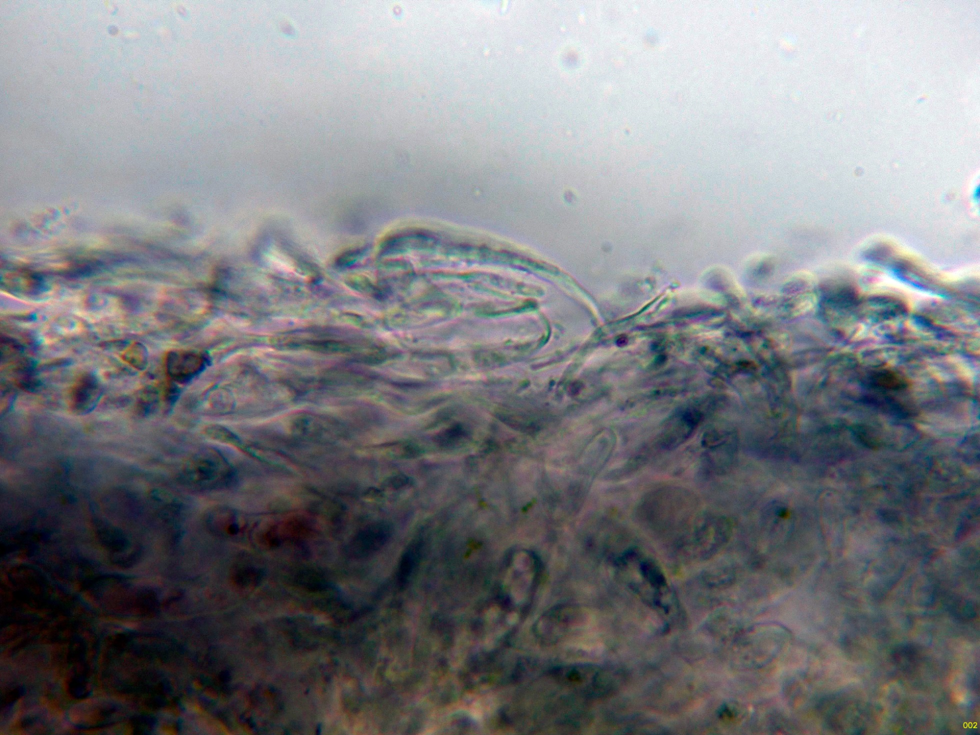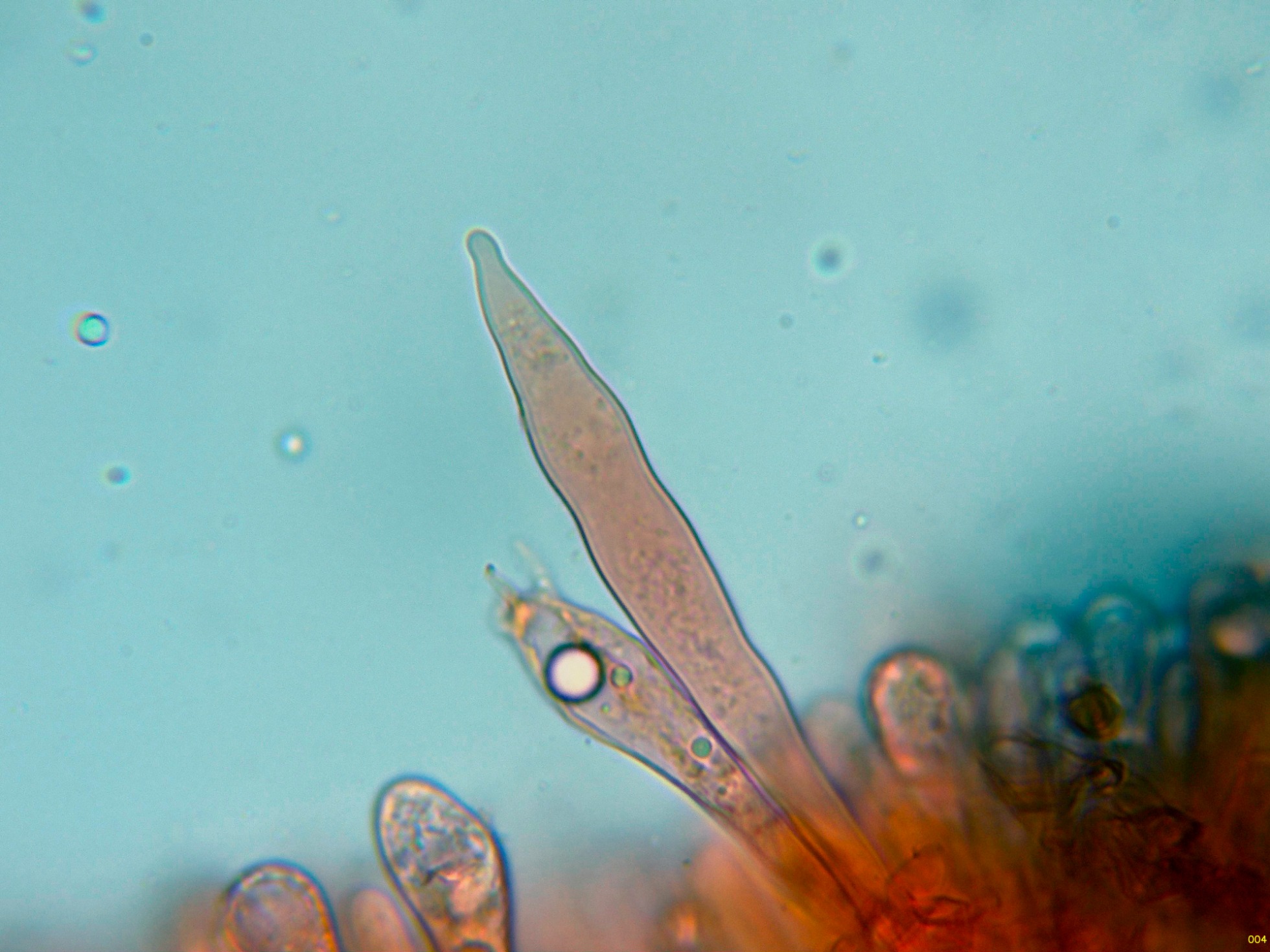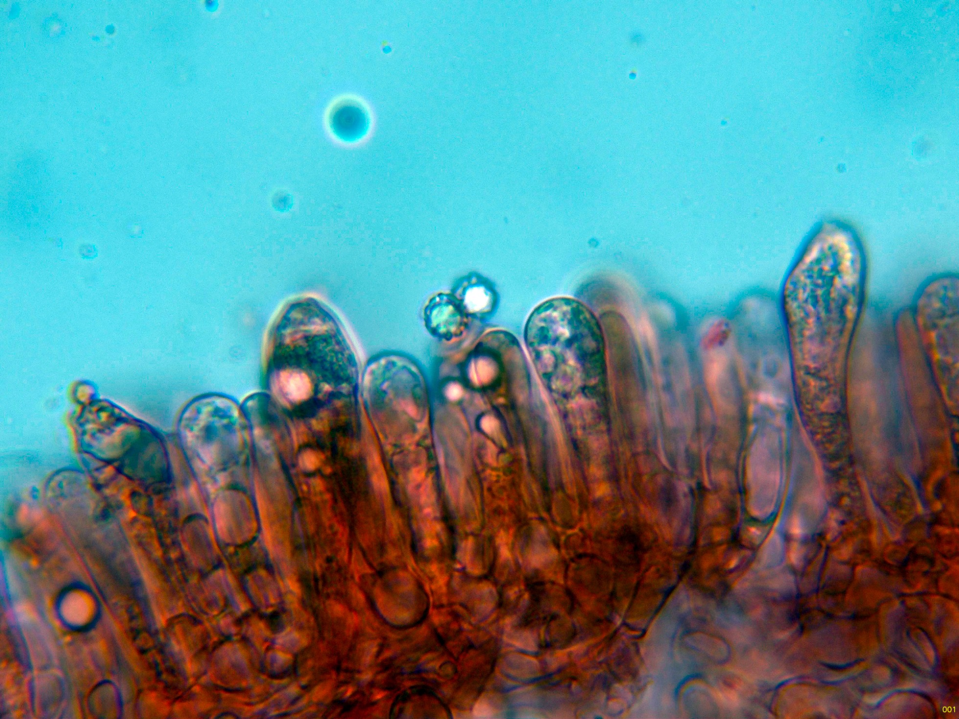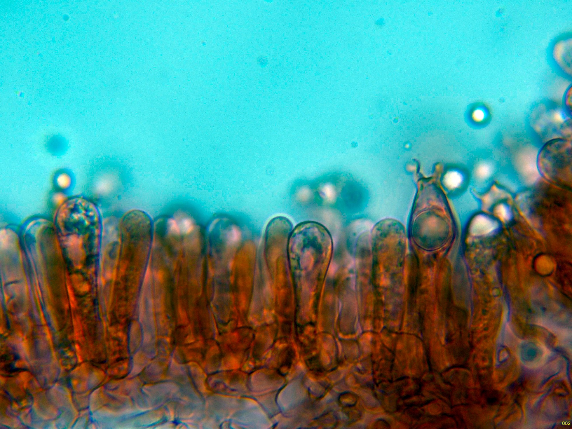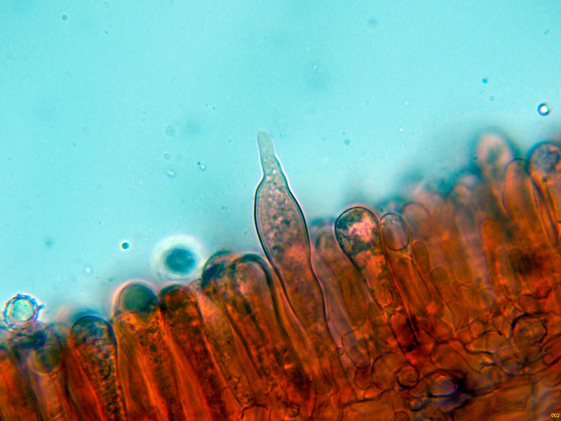 Pleurocistidios también dispersos pero abundantes en la cara laminar.