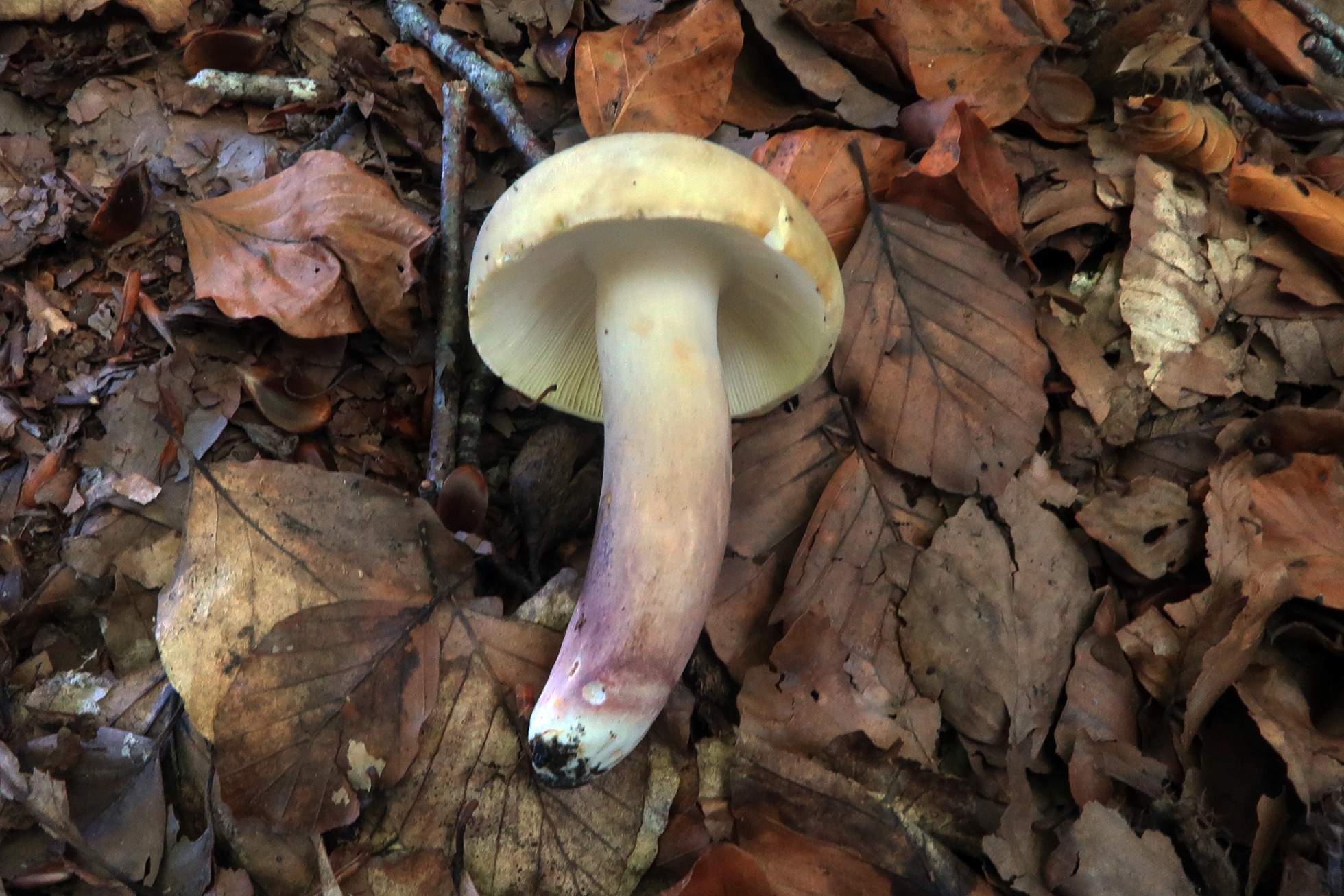 Una Russula típica de hayedos con la base del pie de color violáceo que da origen a su nombre.