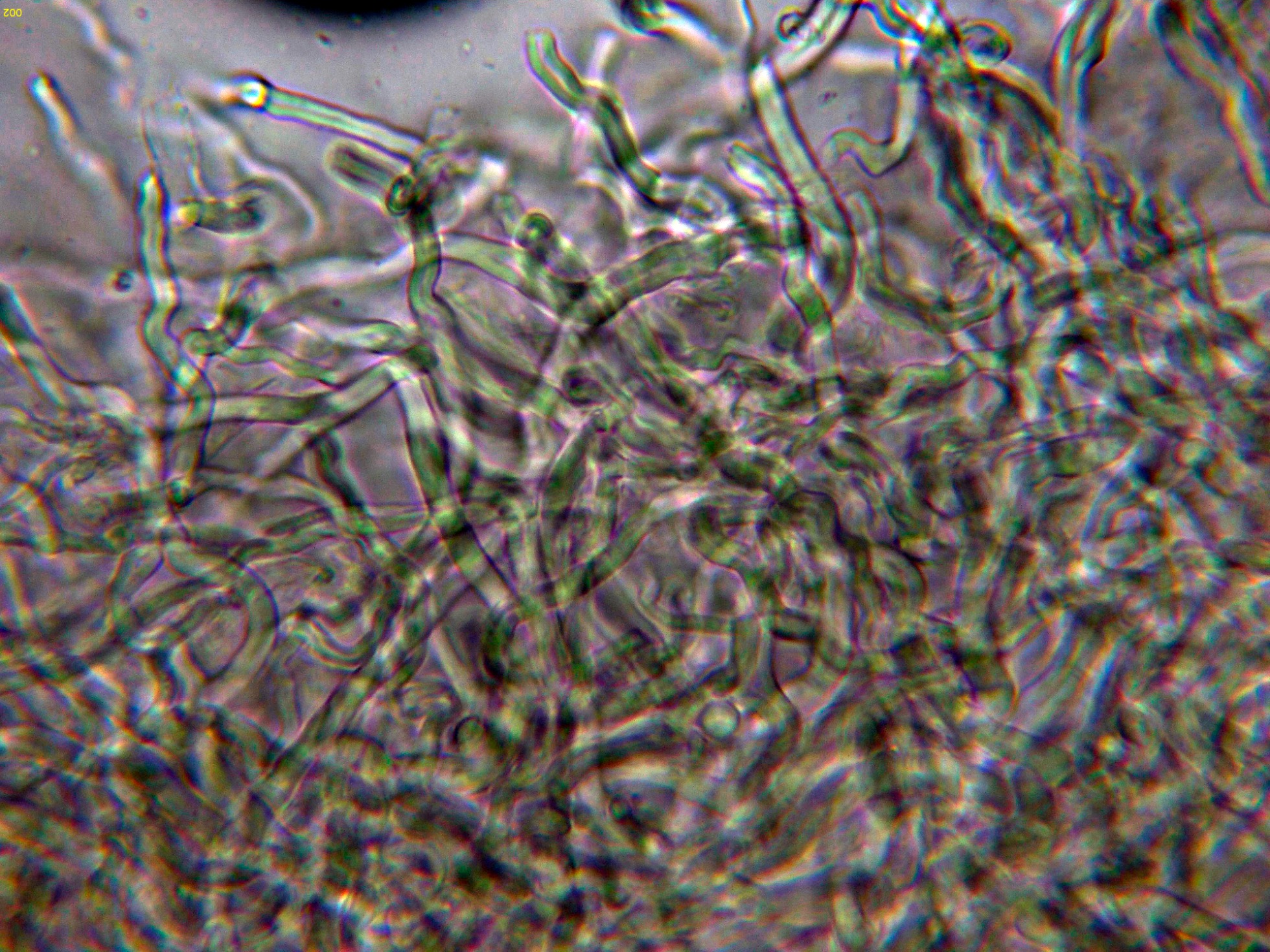 Hifas del contexto dimítico en agua, con hifas esqueléticas de pared gruesa muy ramificadas.