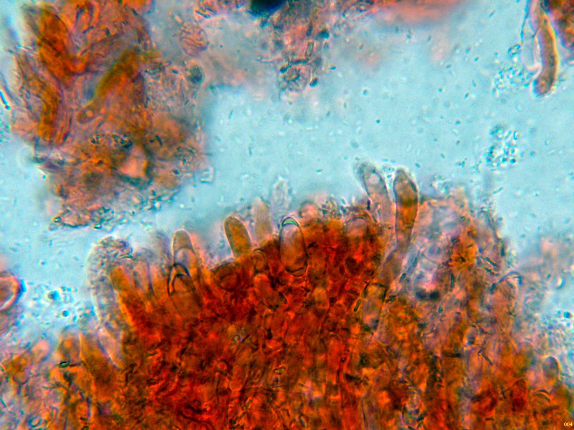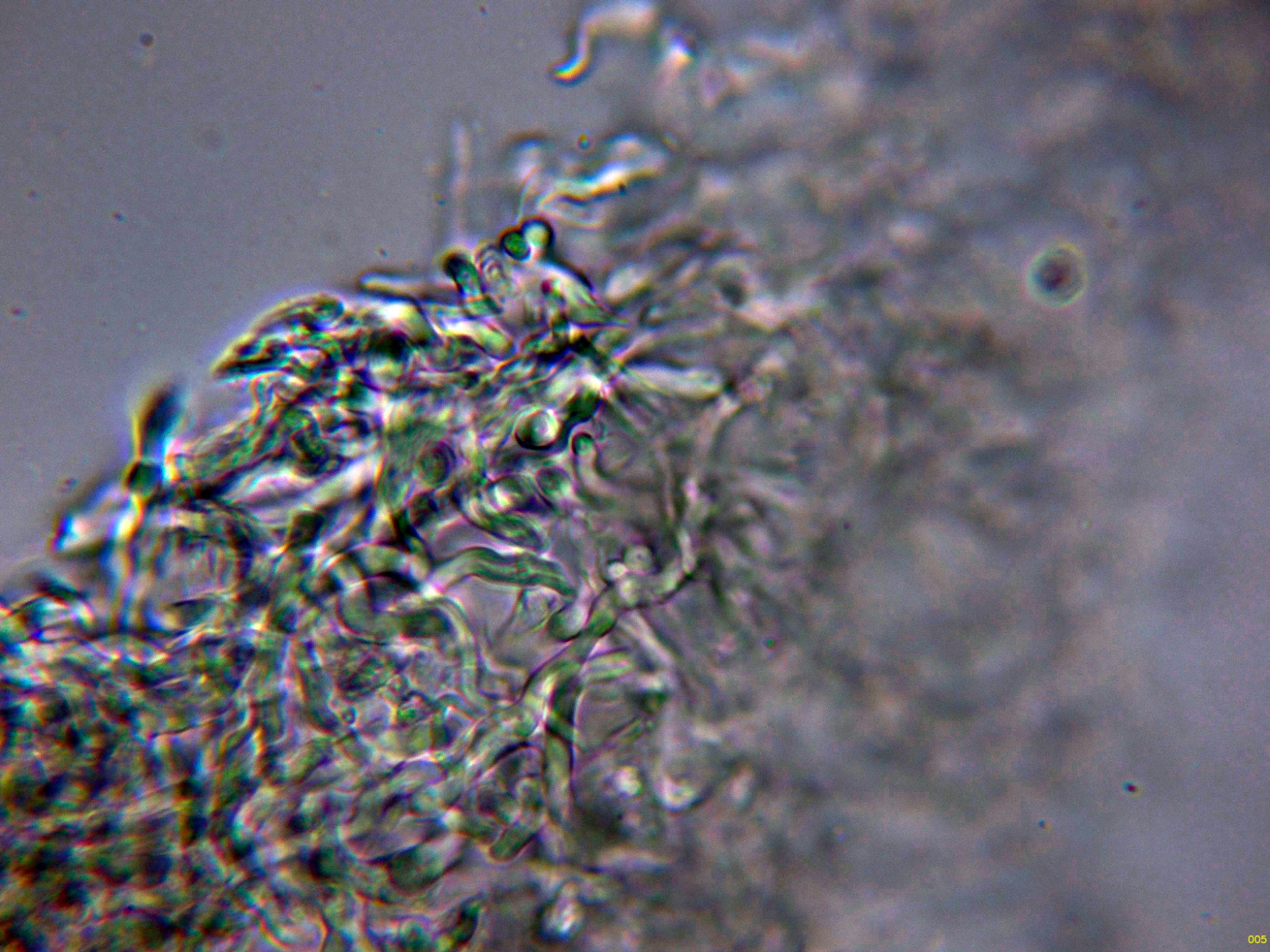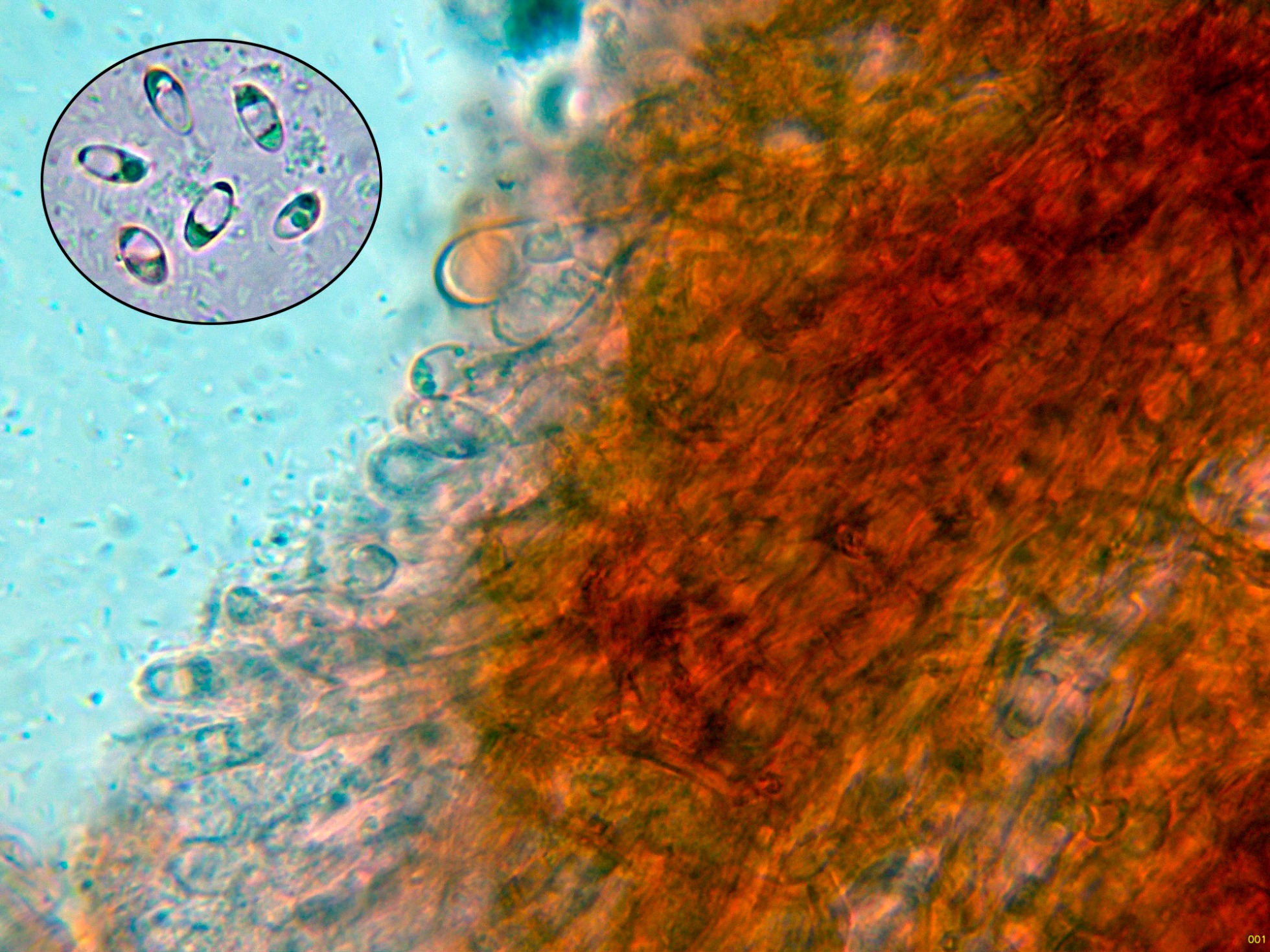 Detalle de la trama y las pocas esporas observadas (los ejemplares ya no pasaban por su mejor momento).