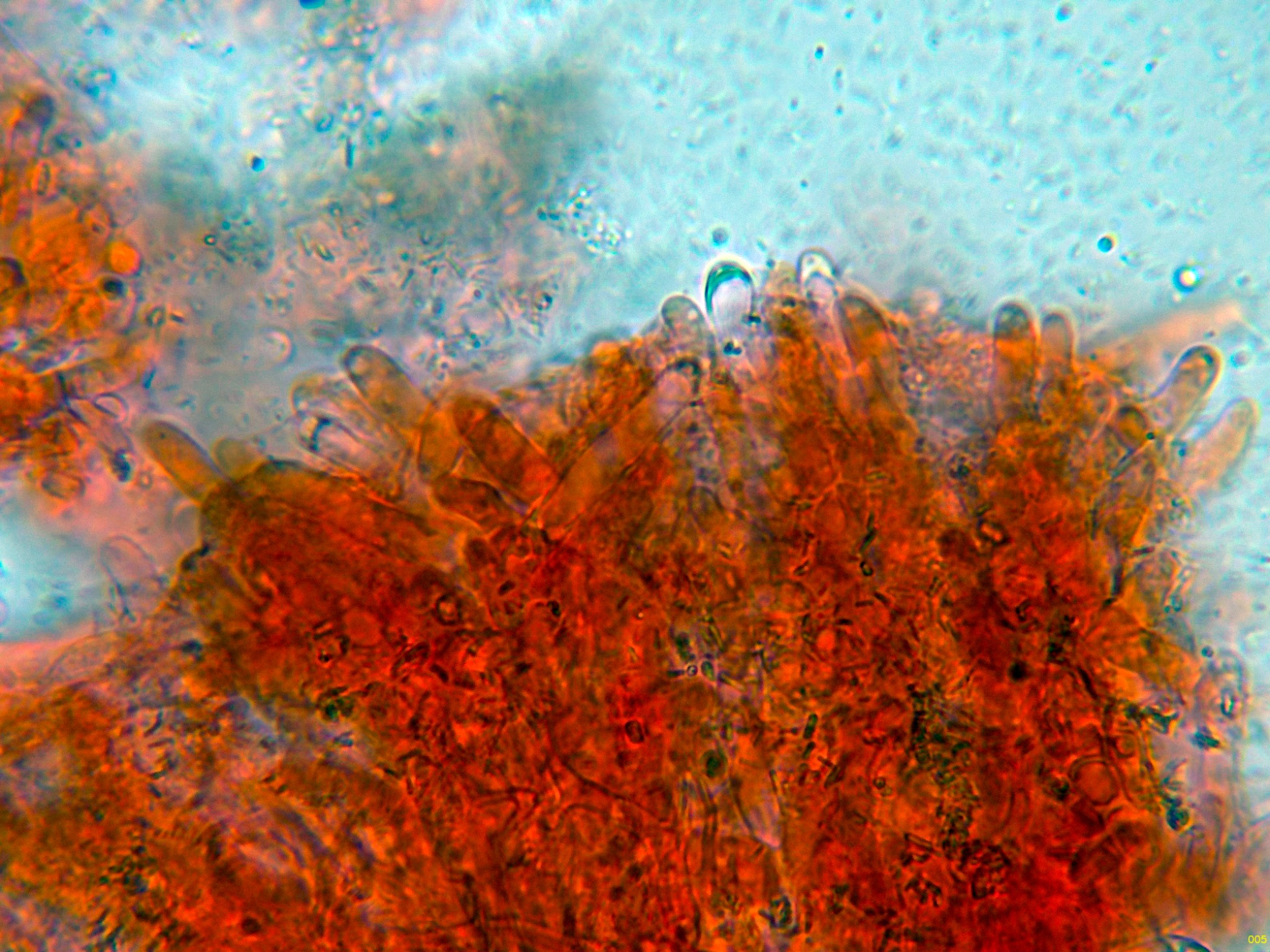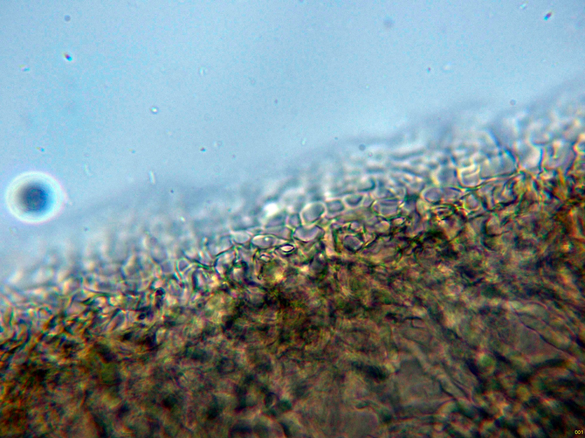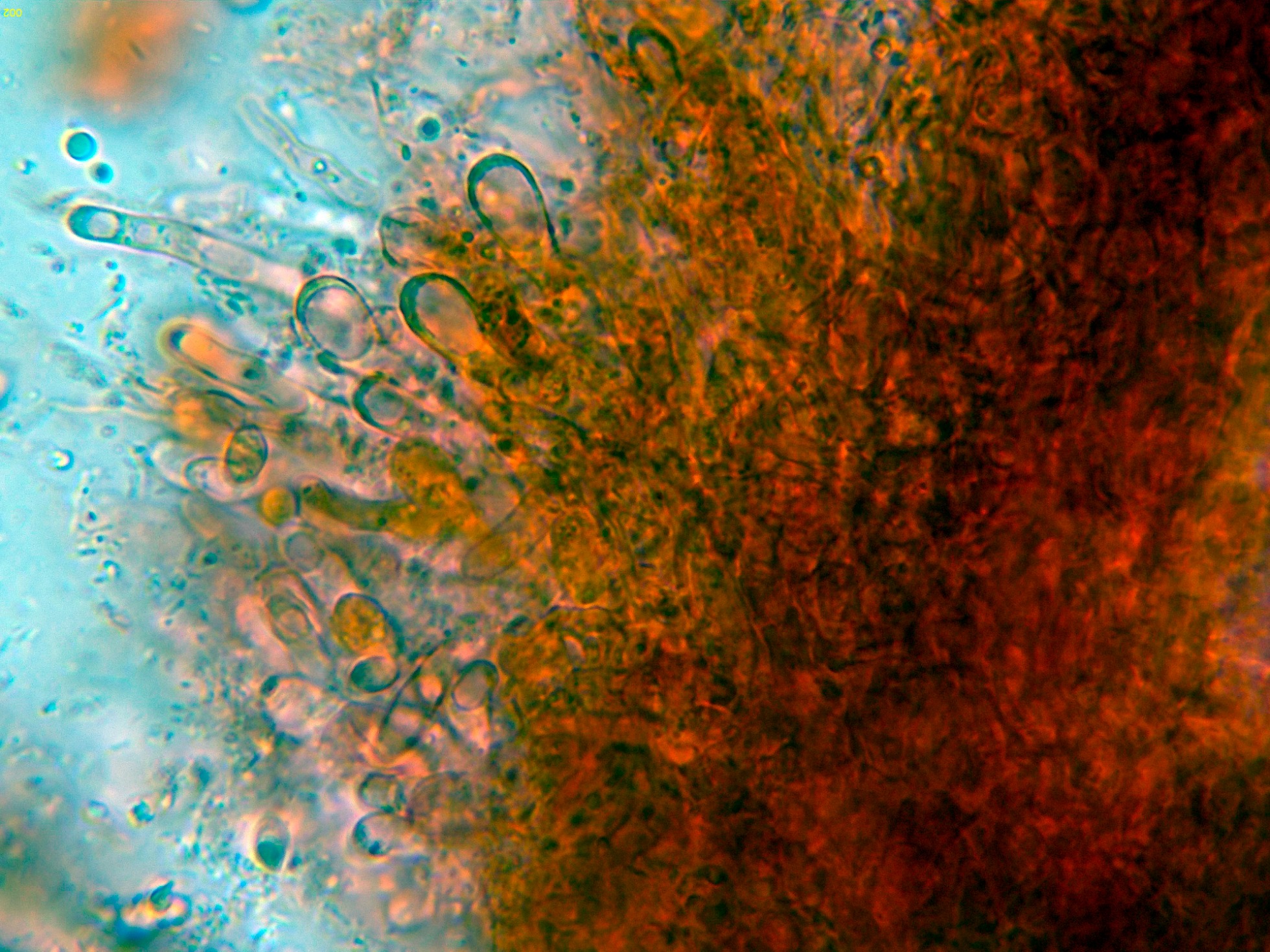Detalle de la trama y las pocas esporas observadas (los ejemplares ya no pasaban por su mejor momento).