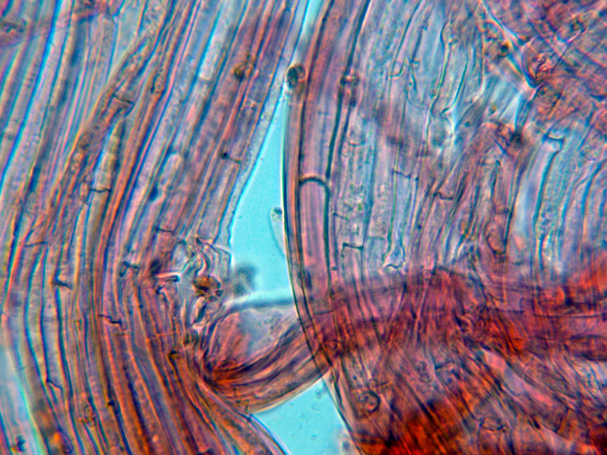 Hifas de la capa corticial del estípite, fuertemente pigmentadas, que son las causantes del color oscuro del pie.