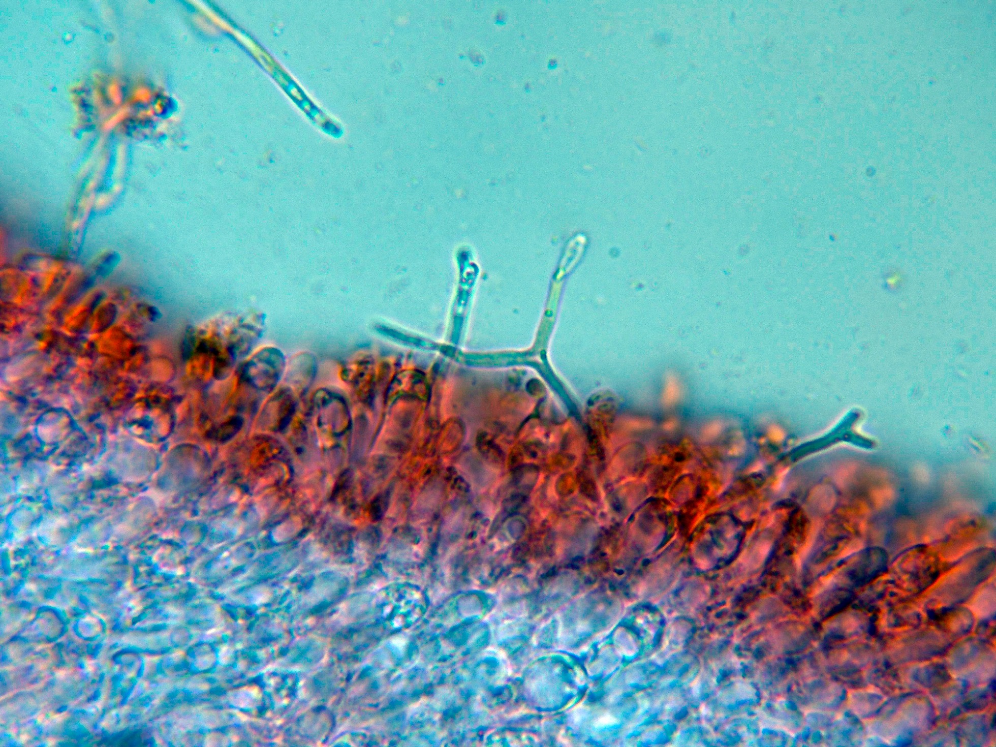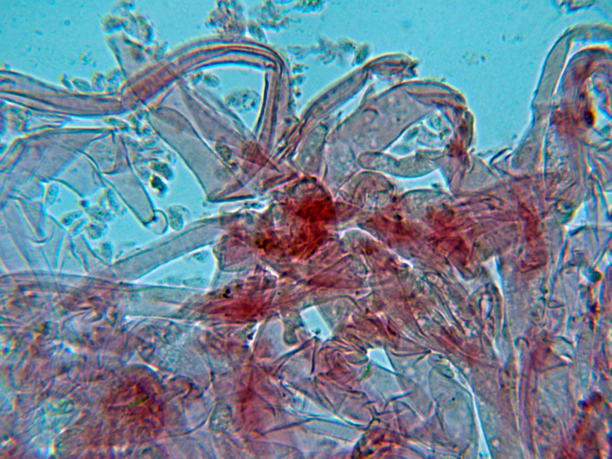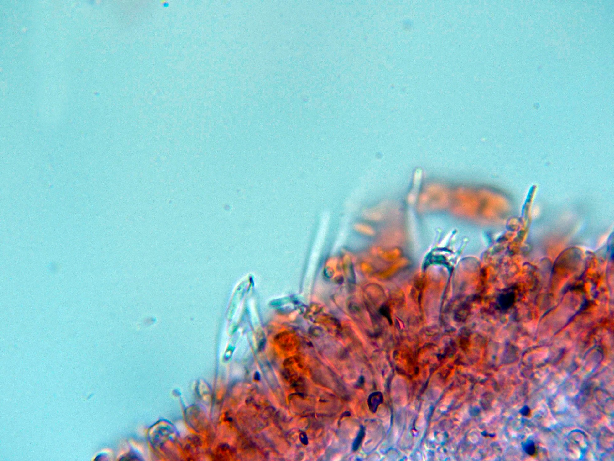 Arista laminar sin cistidios claramente diferenciados, aunque si que se pueden observar numerosas hifas terminales a modo de pelos, algunas de ellas hasta bifurcadas.