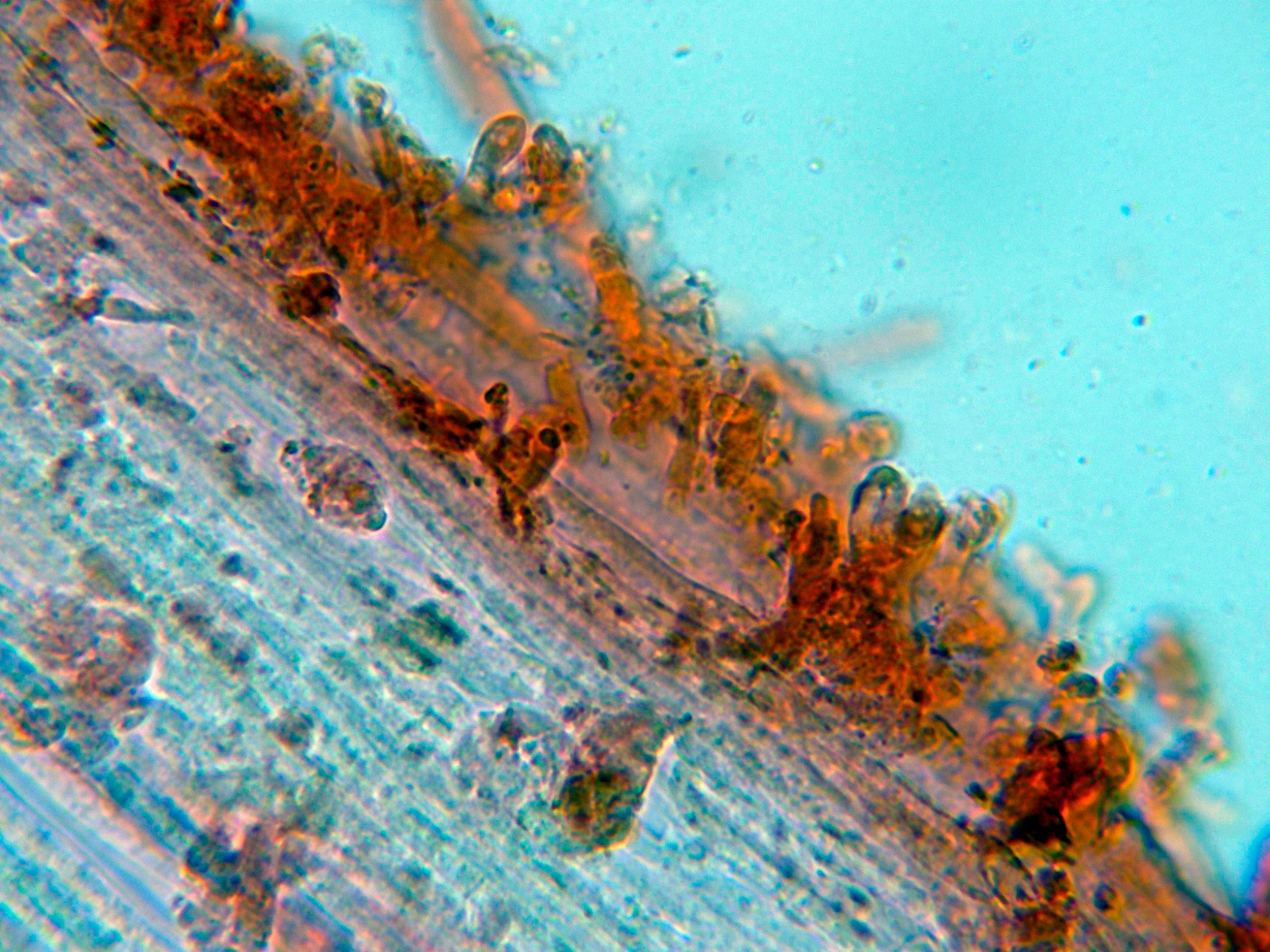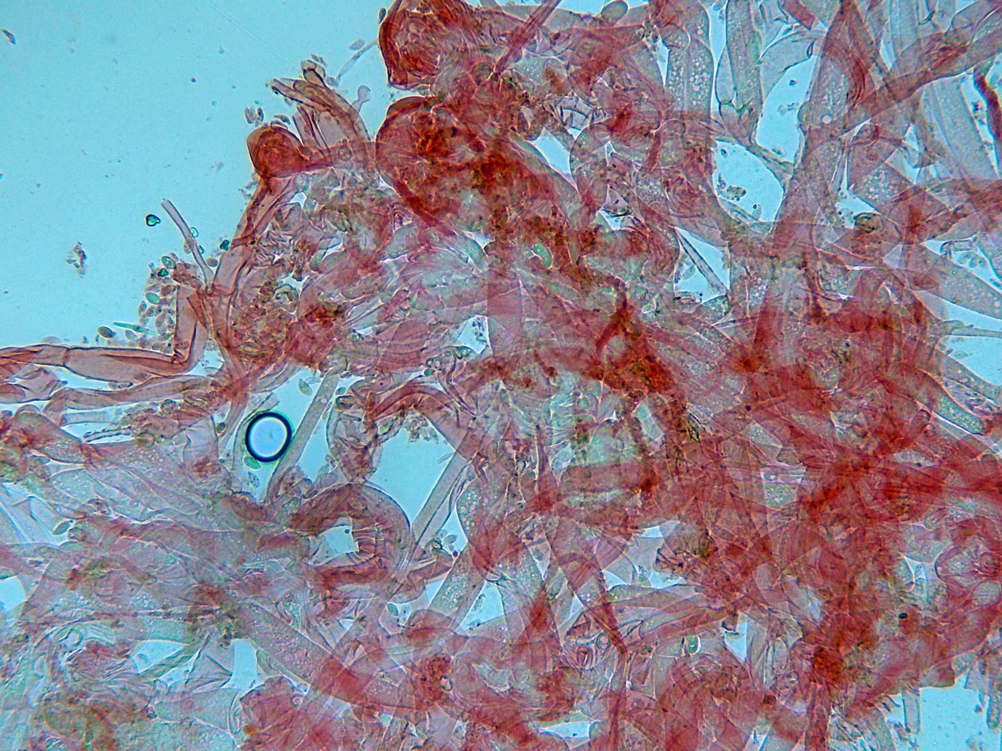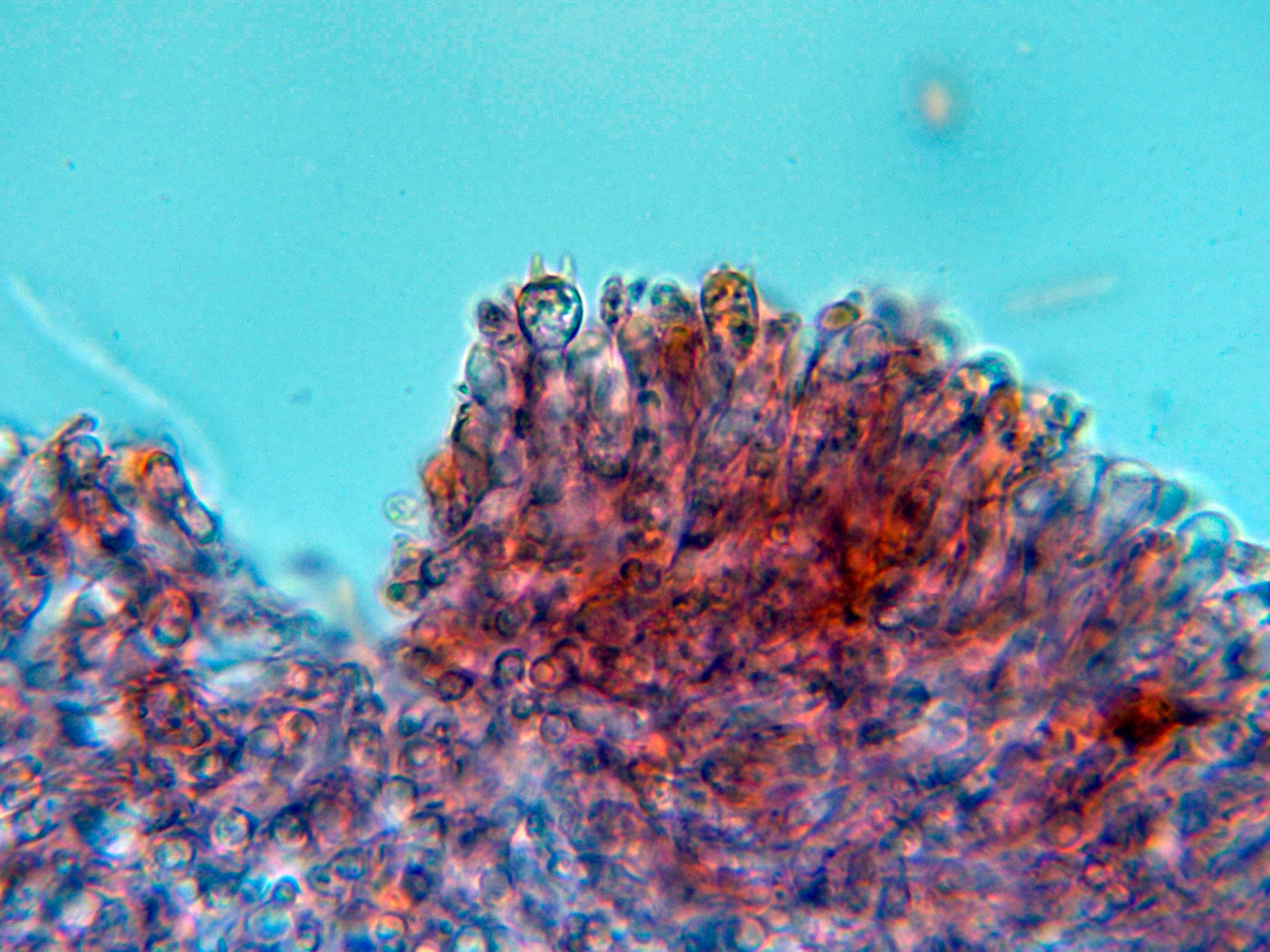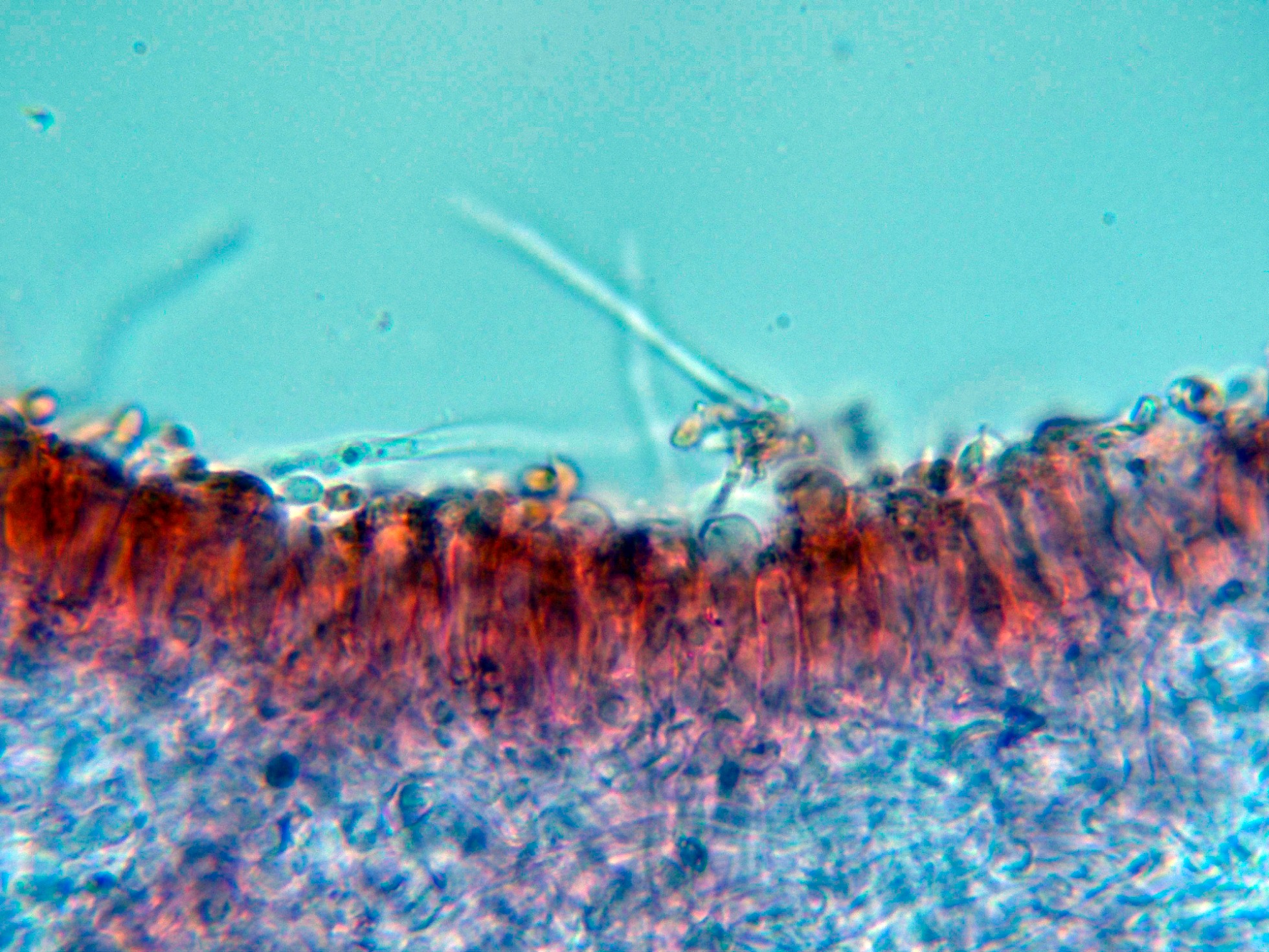 Arista laminar sin cistidios claramente diferenciados, aunque si que se pueden observar numerosas hifas terminales a modo de pelos, algunas de ellas hasta bifurcadas.