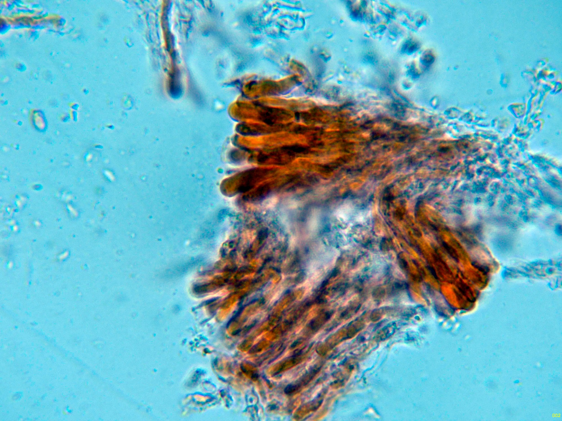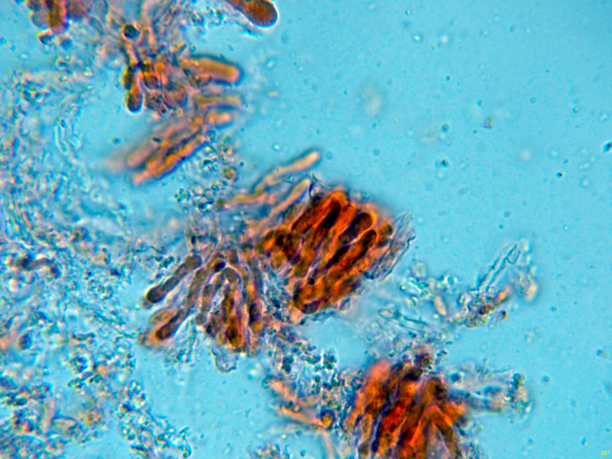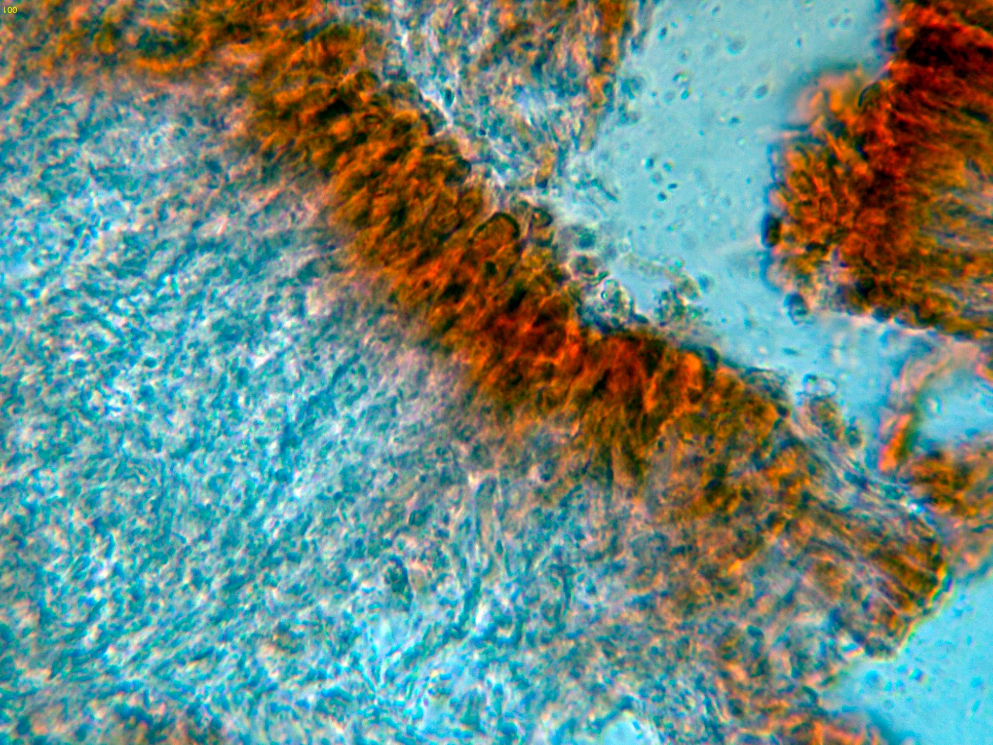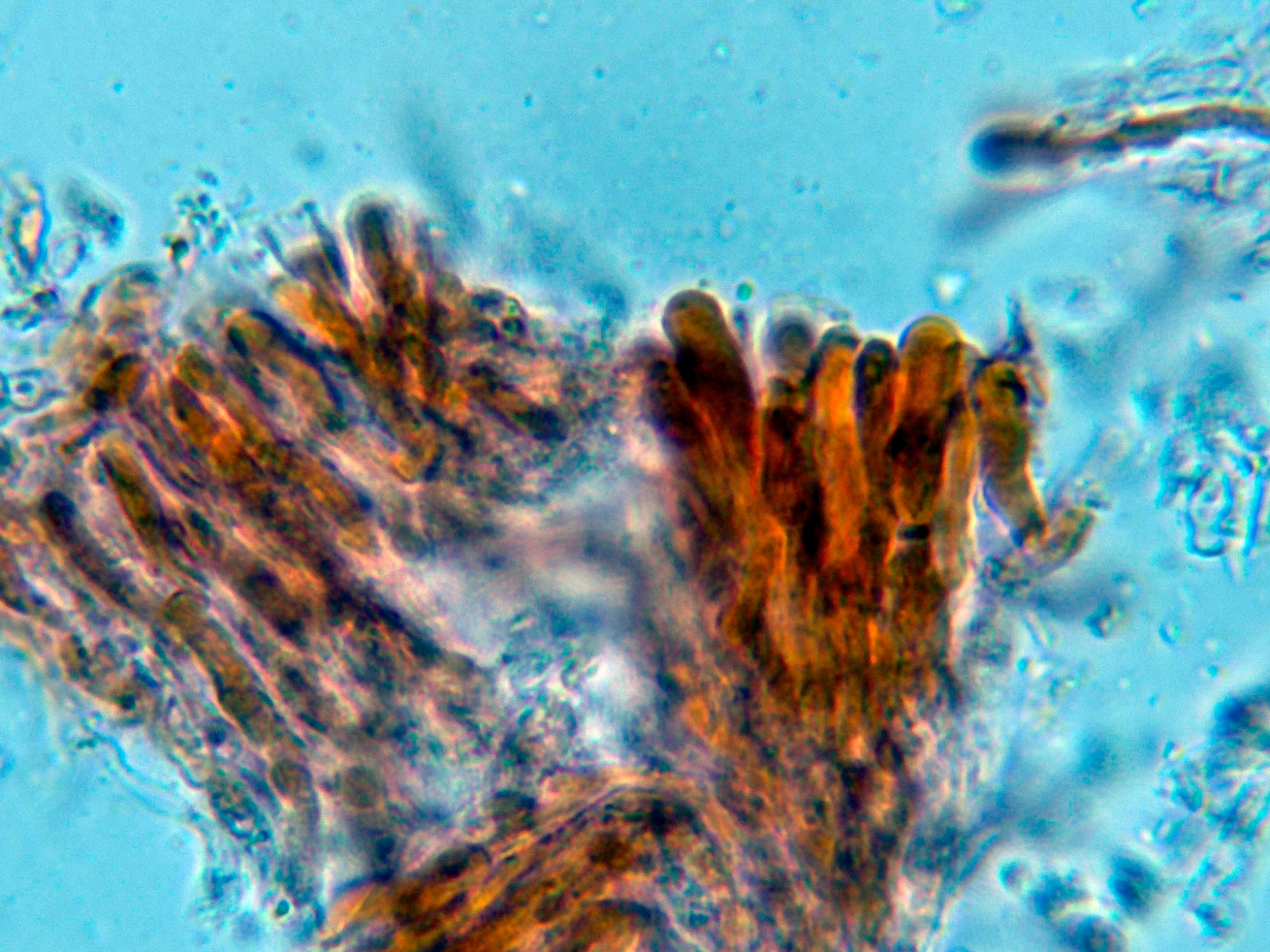 Detalle del himenio, sin aparentemente cistidios claramente diferenciados de los basidios o basidiolos.
