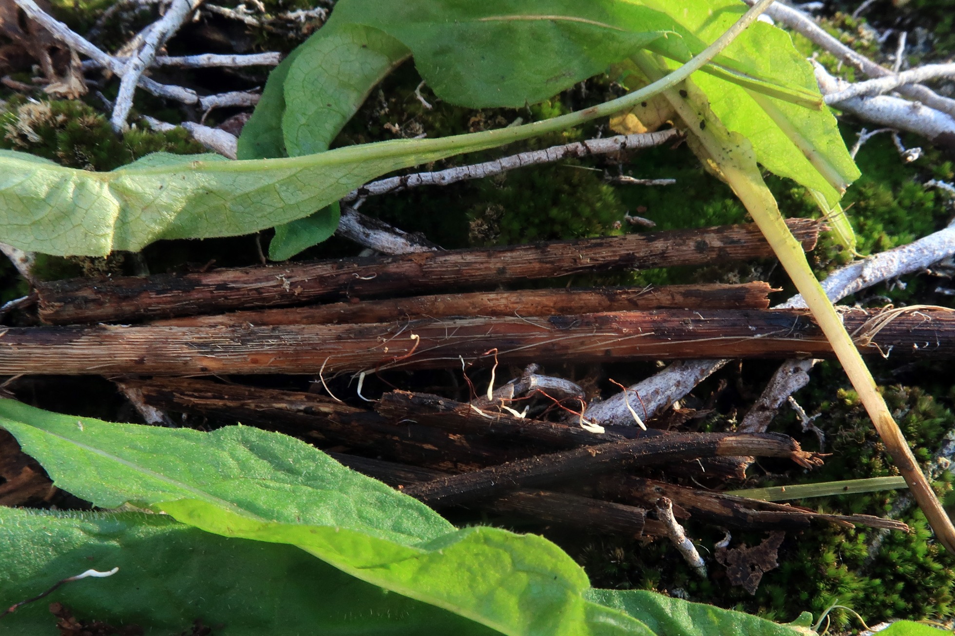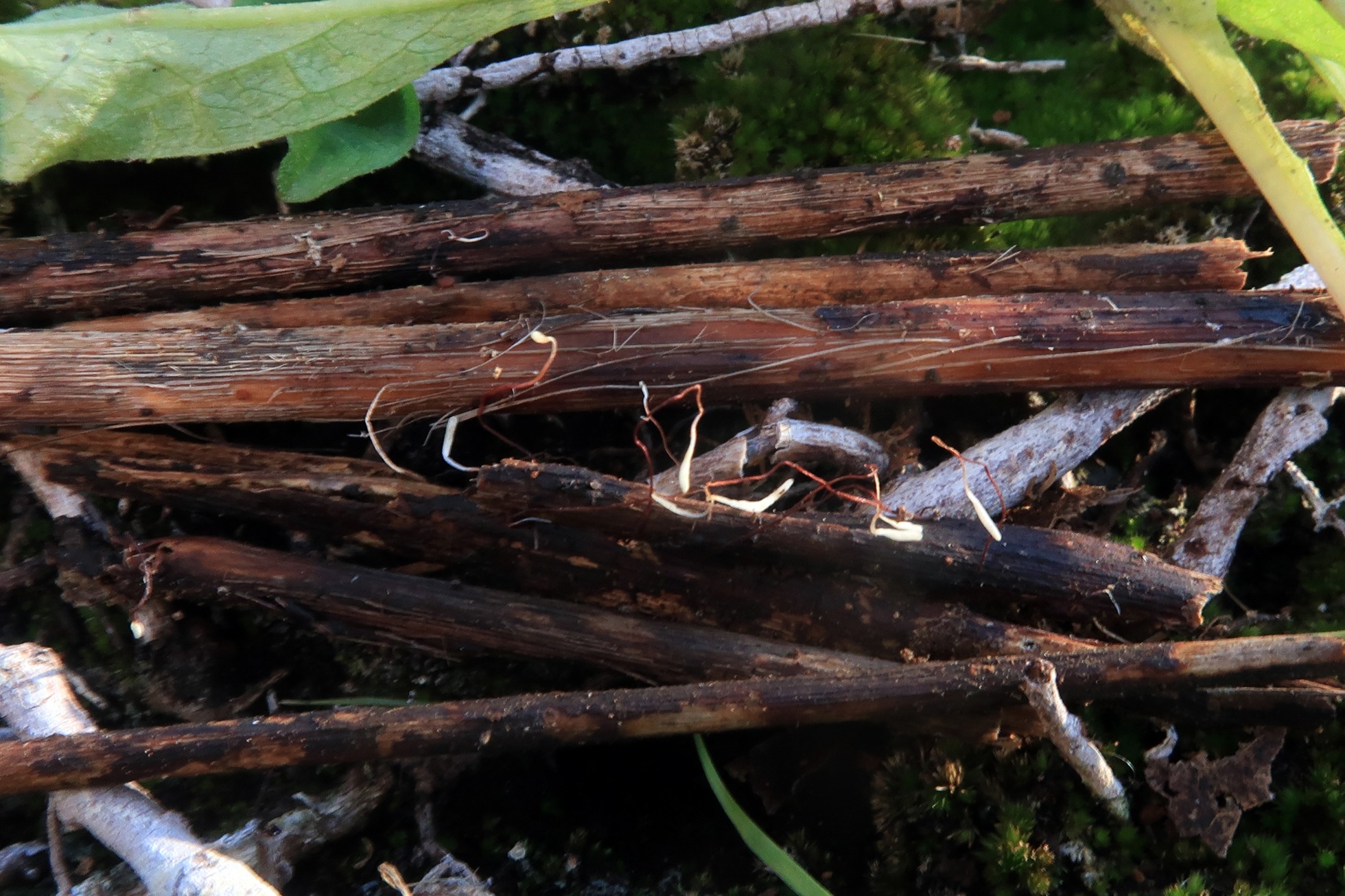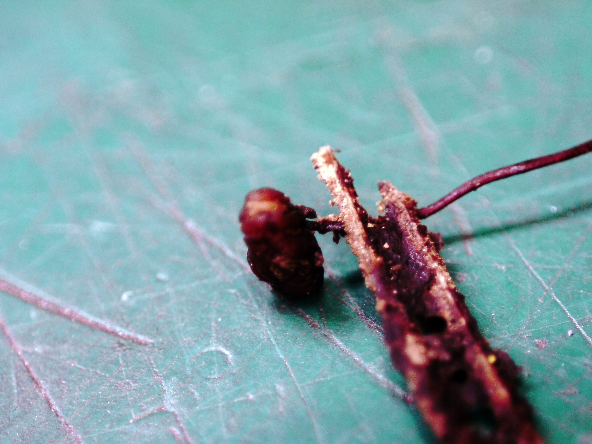 En las Claves del género de Alain Gerault de mayo de 2005, indica que la Typhula erythropus brota de un esclerocio ovalado marrón rojizo, muy difícil de encontrar, no paré hasta dar con el esclerocio, la razón de ser difícil su localización es porqué este esclerocio está por debajo de la superficie del sustrato.