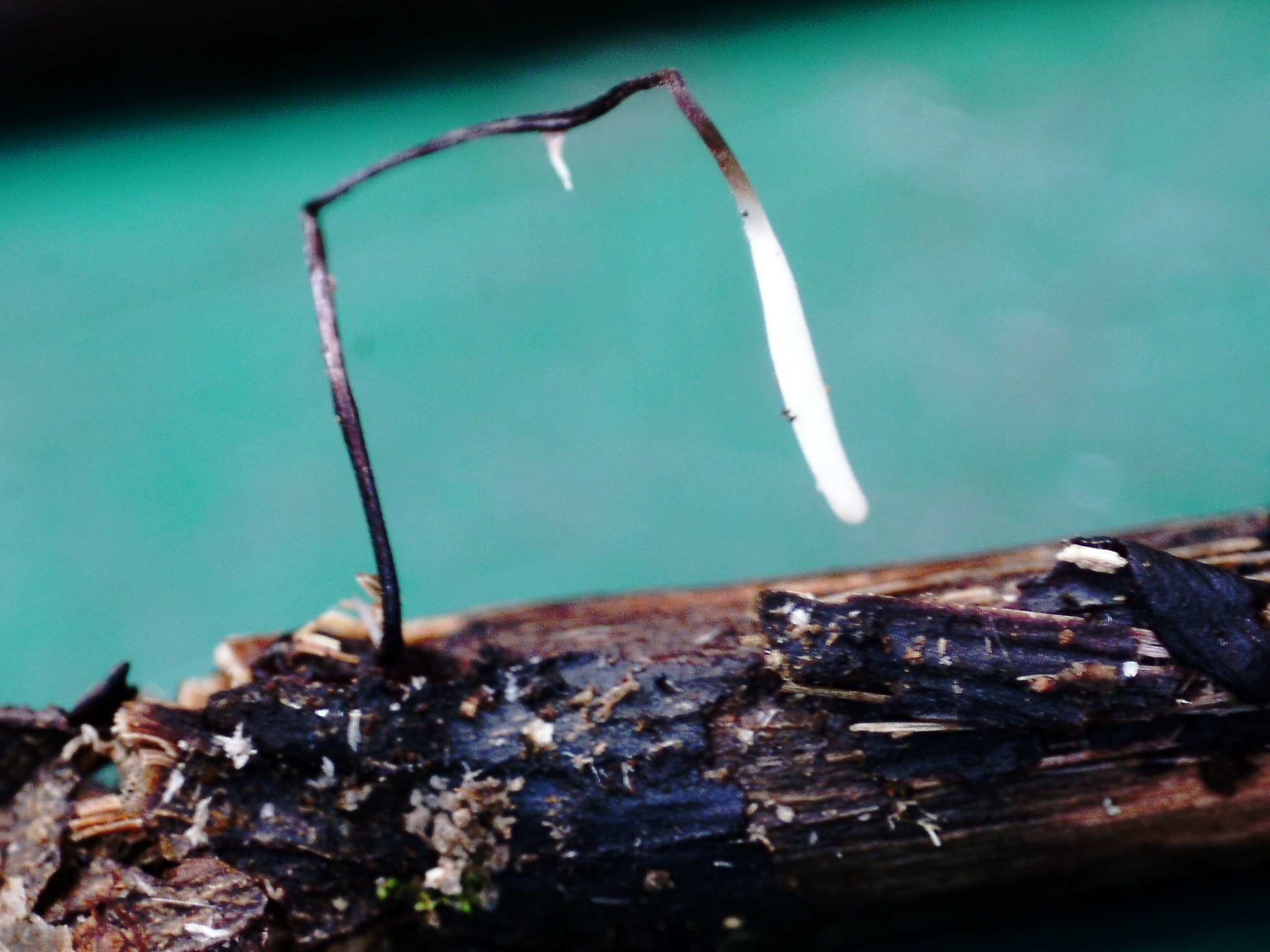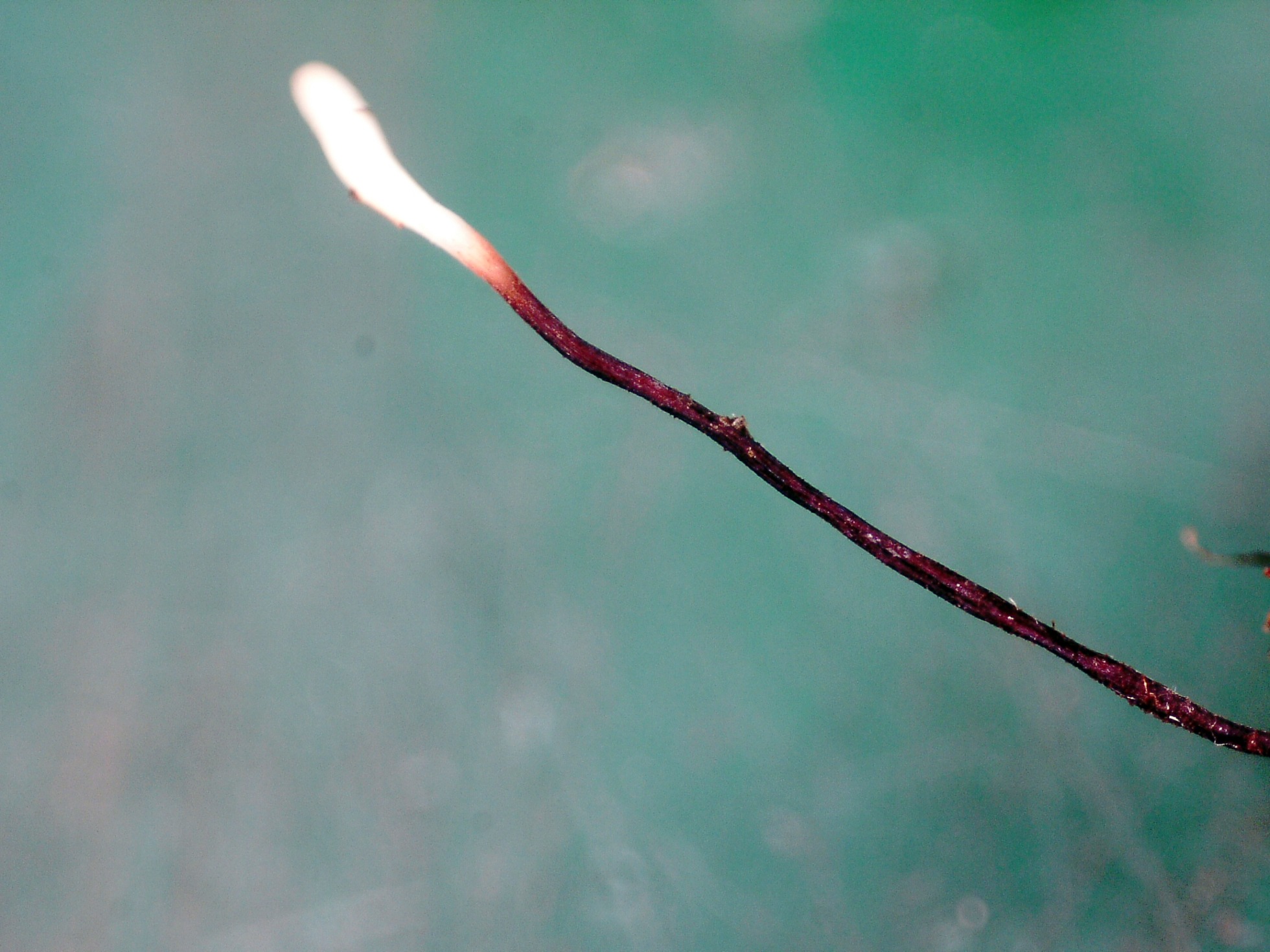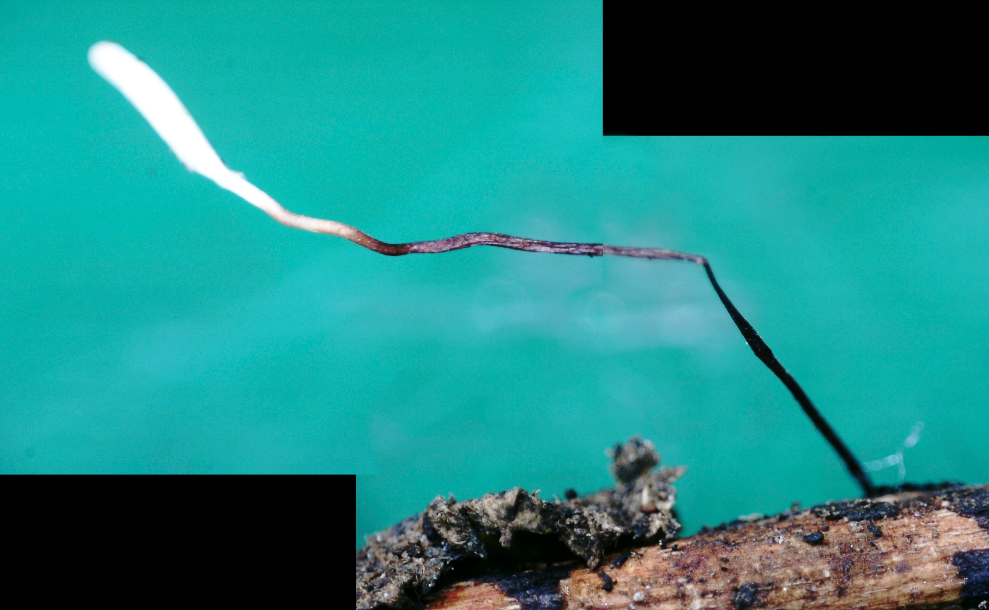 Un nuevo cromo gentileza de Antonio Couceiro, una Typhula de hasta 3 cm. creciendo sobre pequeños troncos, con un pie marrón rojizo muy oscuro que da lugar a su nombre.