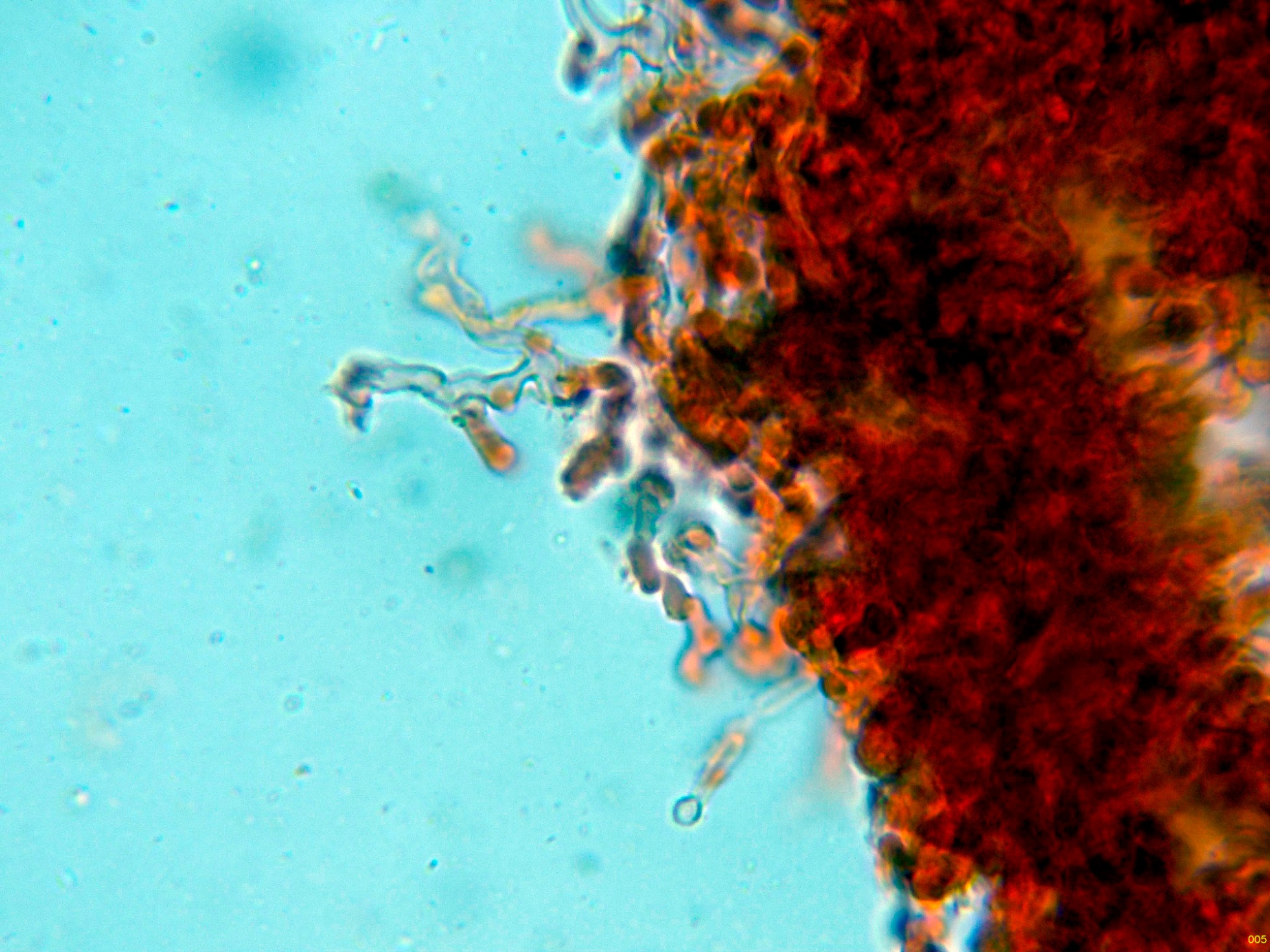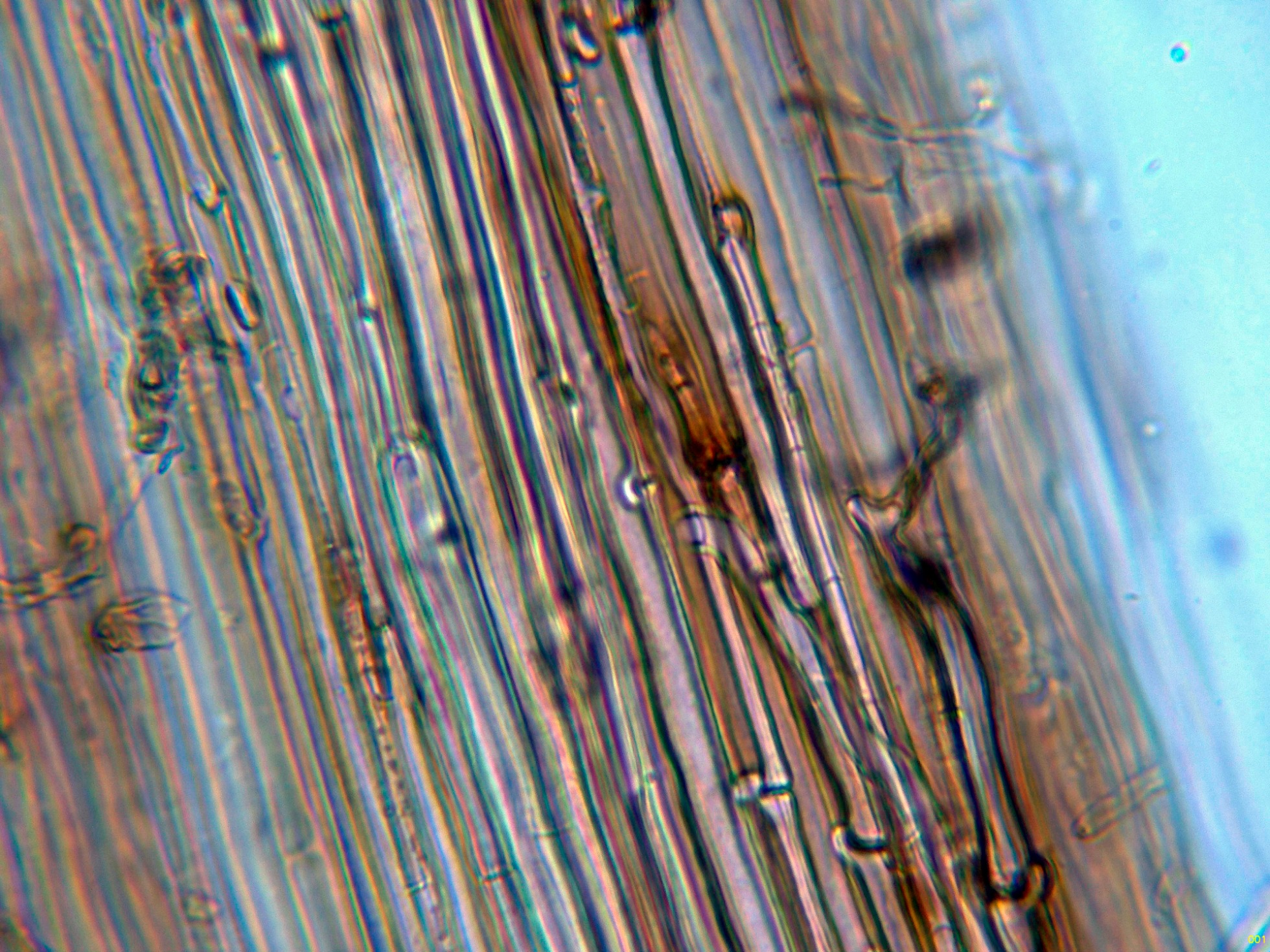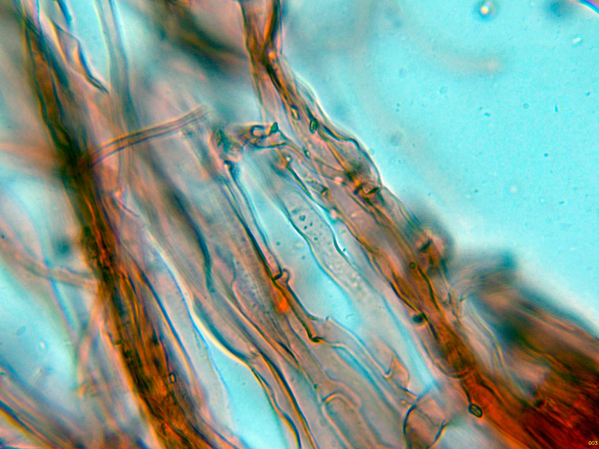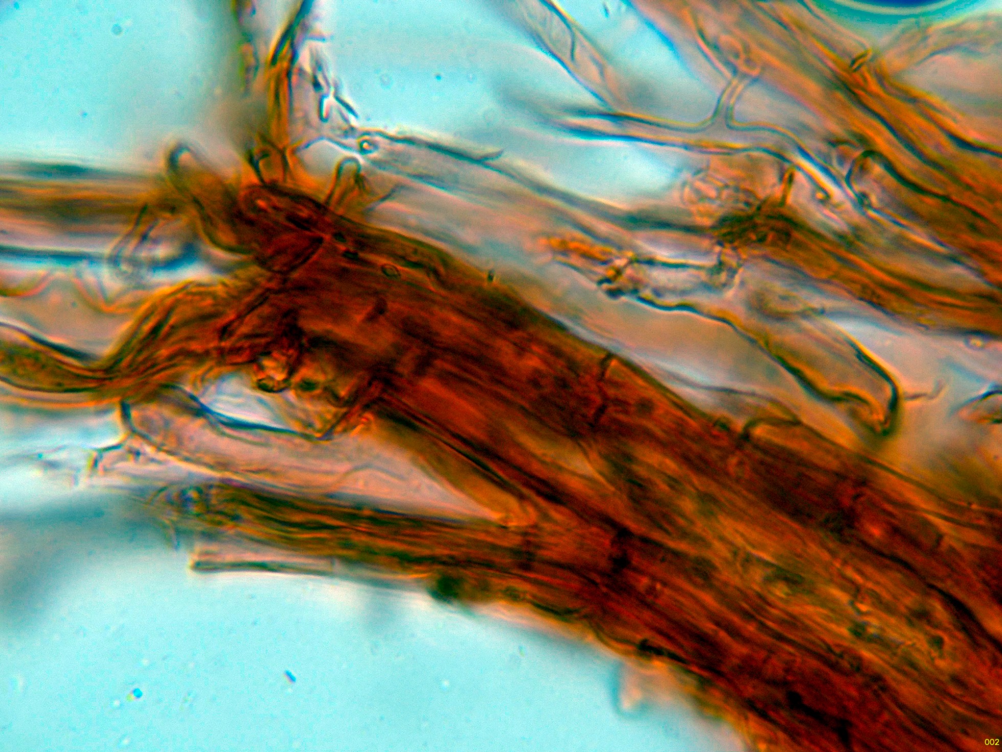 Por debajo de estas otras hifas ya más hialinas, dispuestas paralelamente, de pared gruesa y con gruesas fíbulas.