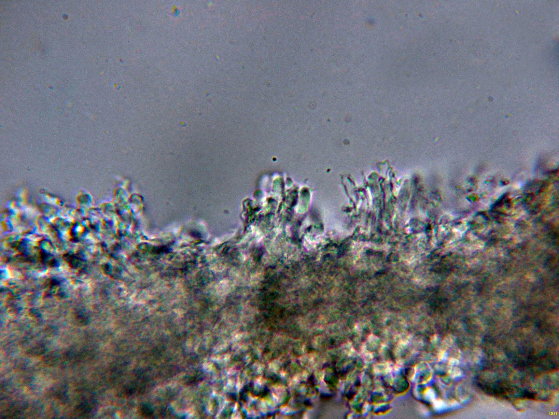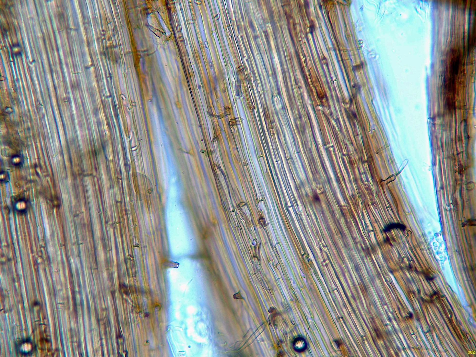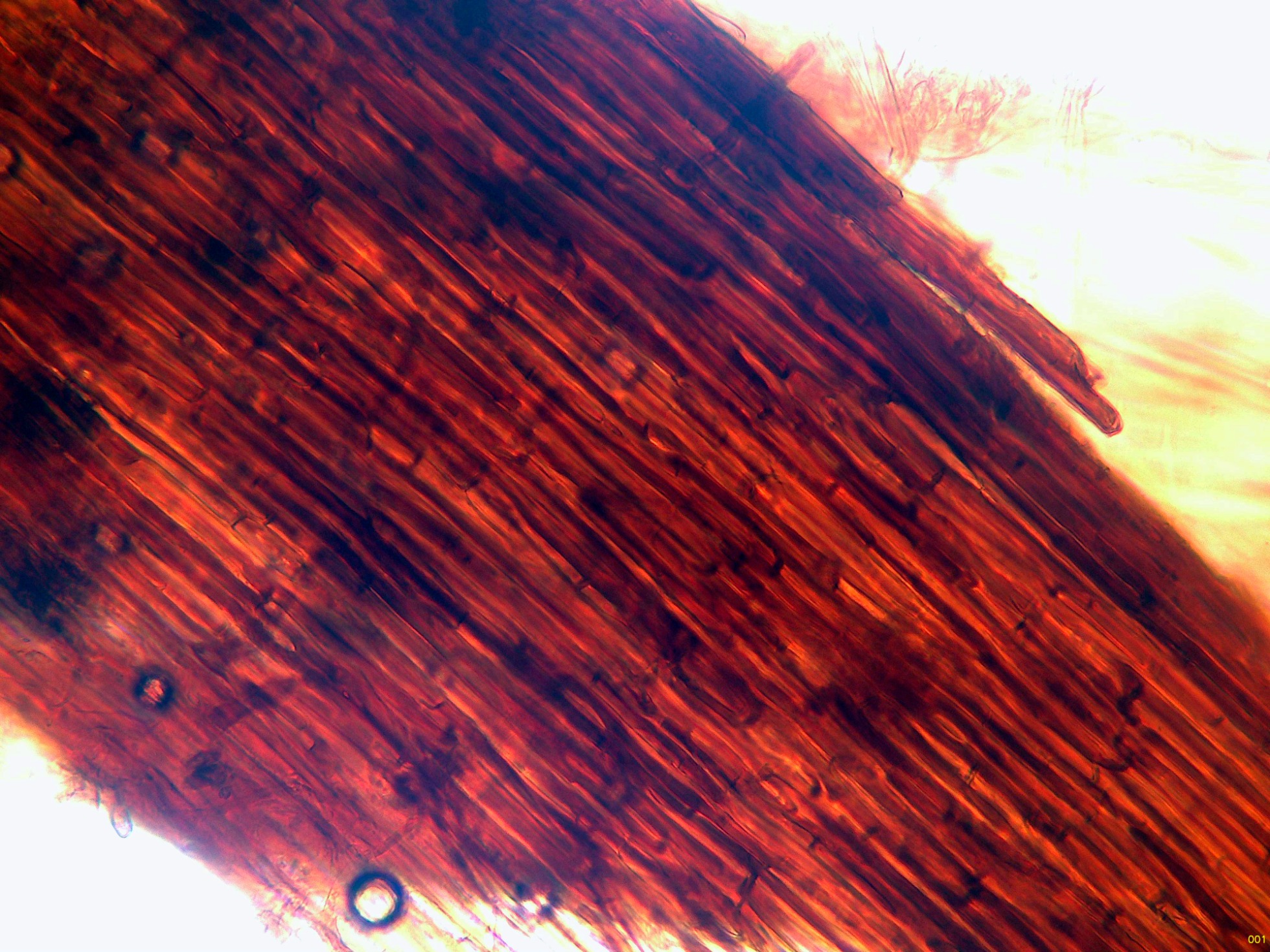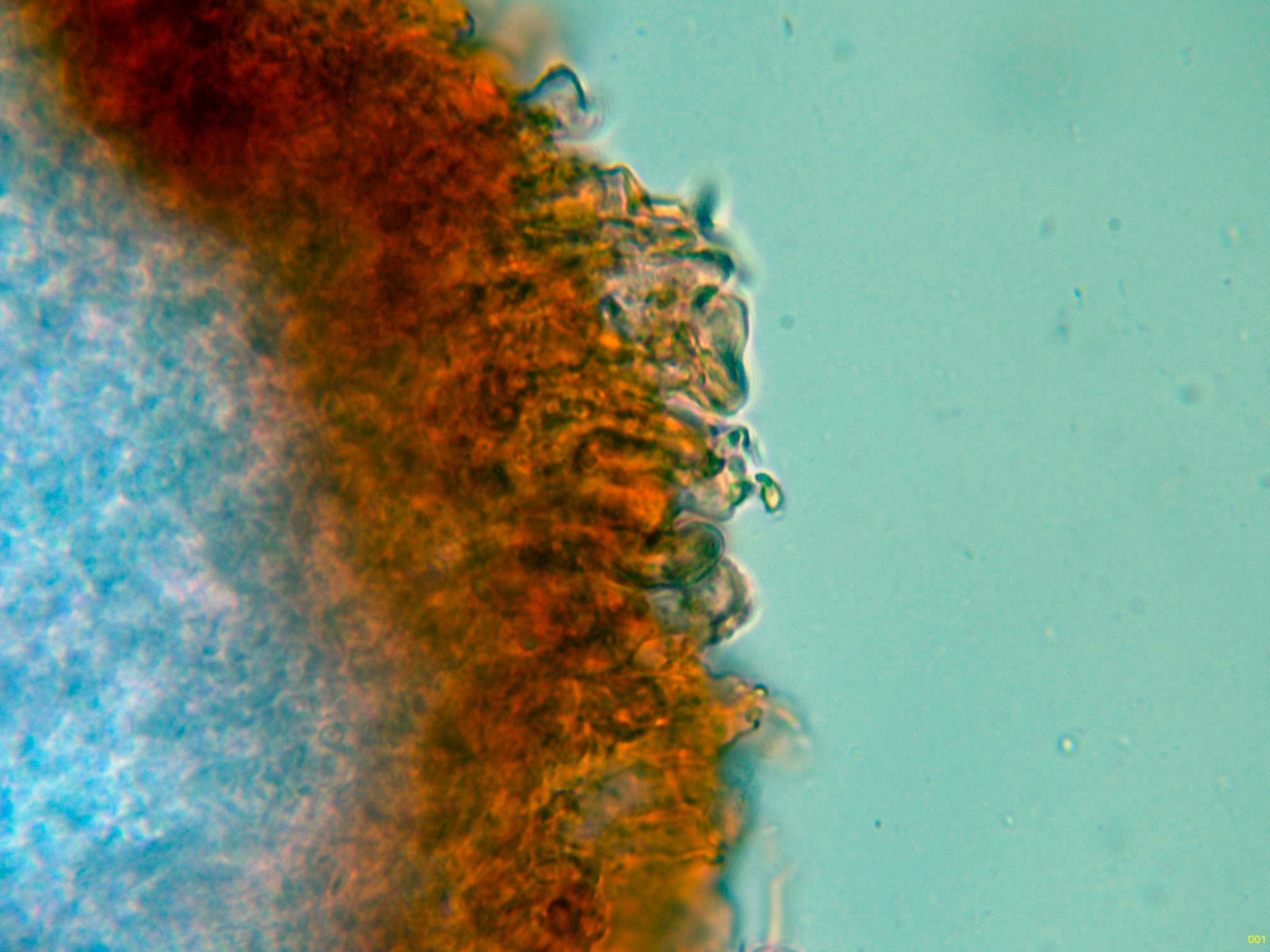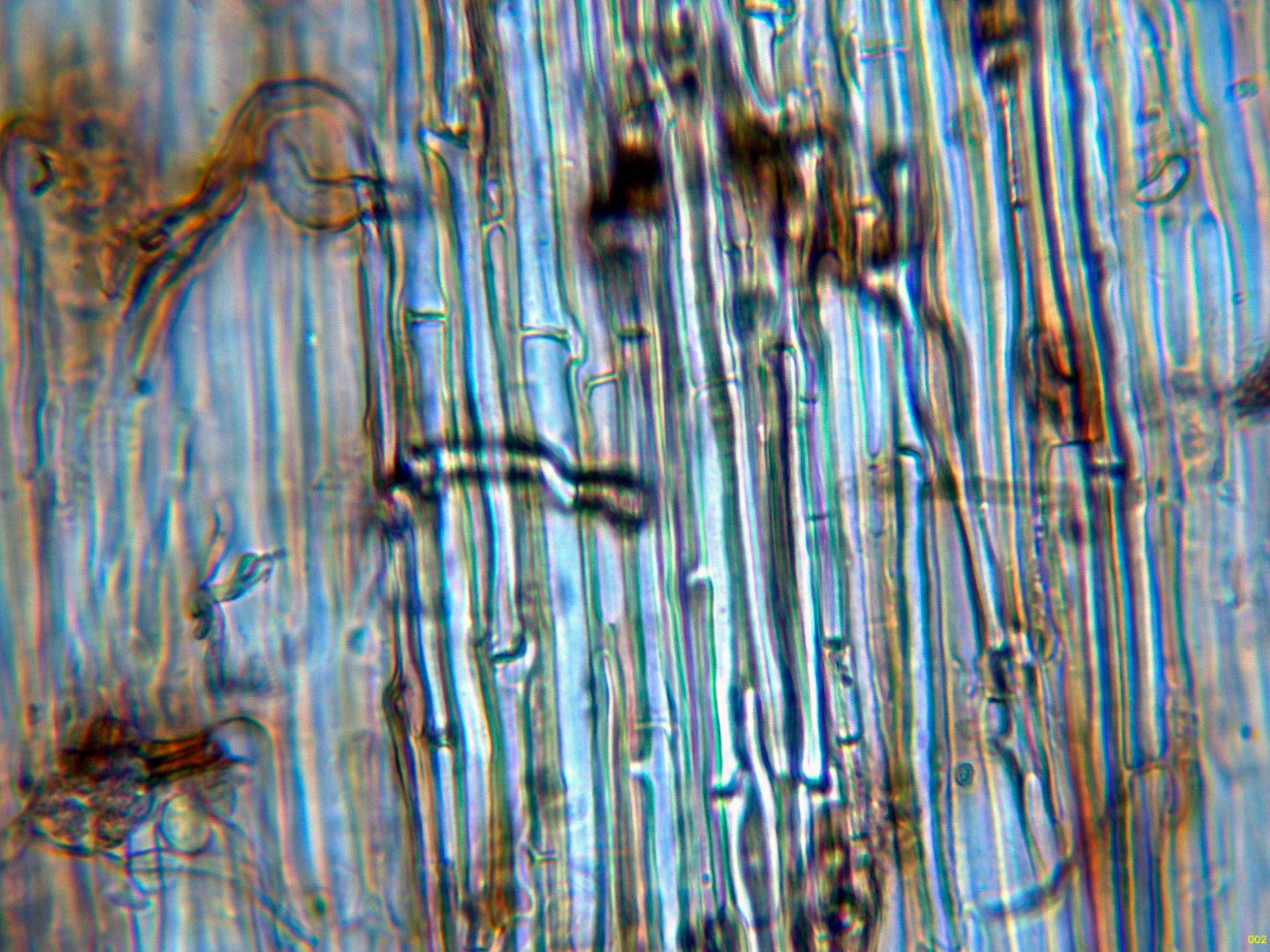 Por debajo de estas otras hifas ya más hialinas, dispuestas paralelamente, de pared gruesa y con gruesas fíbulas.