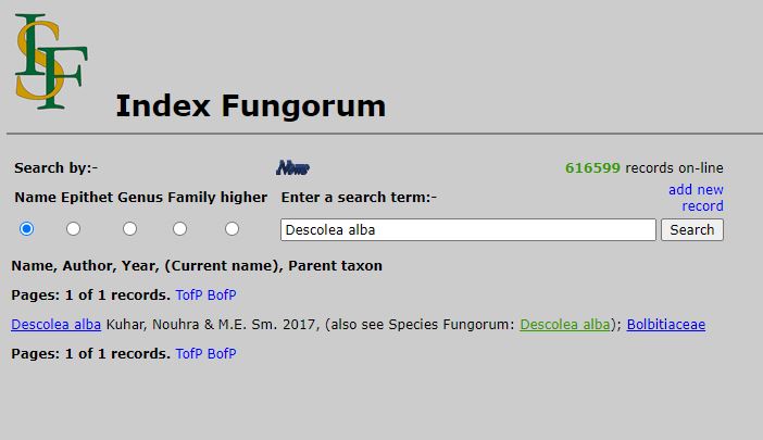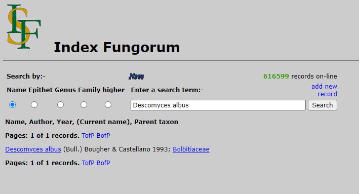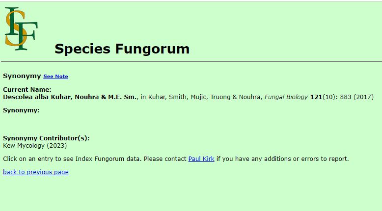 Gracias Juan Andrés por tu puntualización, en cuanto a su nombre correcto actual, sucede que cuanta más información encuentro más dudas me surgen, por supuesto que en cuanto a su epíteto no incurrí en ningún error por mi parte, ya que acabo de consultar en Index Fungorum y tanto el Descomyces albus como la Descolea alba, ambos se encuentran por separado sin ninguna sinonimia entre ellos, dejo una captura de cada uno de ellos, por un lado el Descomyces albus.