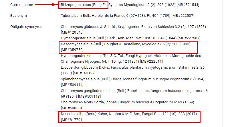 Para complicar aún más la cosa si me atiendo al criterio de Mycobank, allí si que se dan por sinónimos el Descomyces albus con la Descolea alba, pero lo desconcertante es que según Mycobank su nombre actual sería el de Rhizopogon albus, dejo una captura.