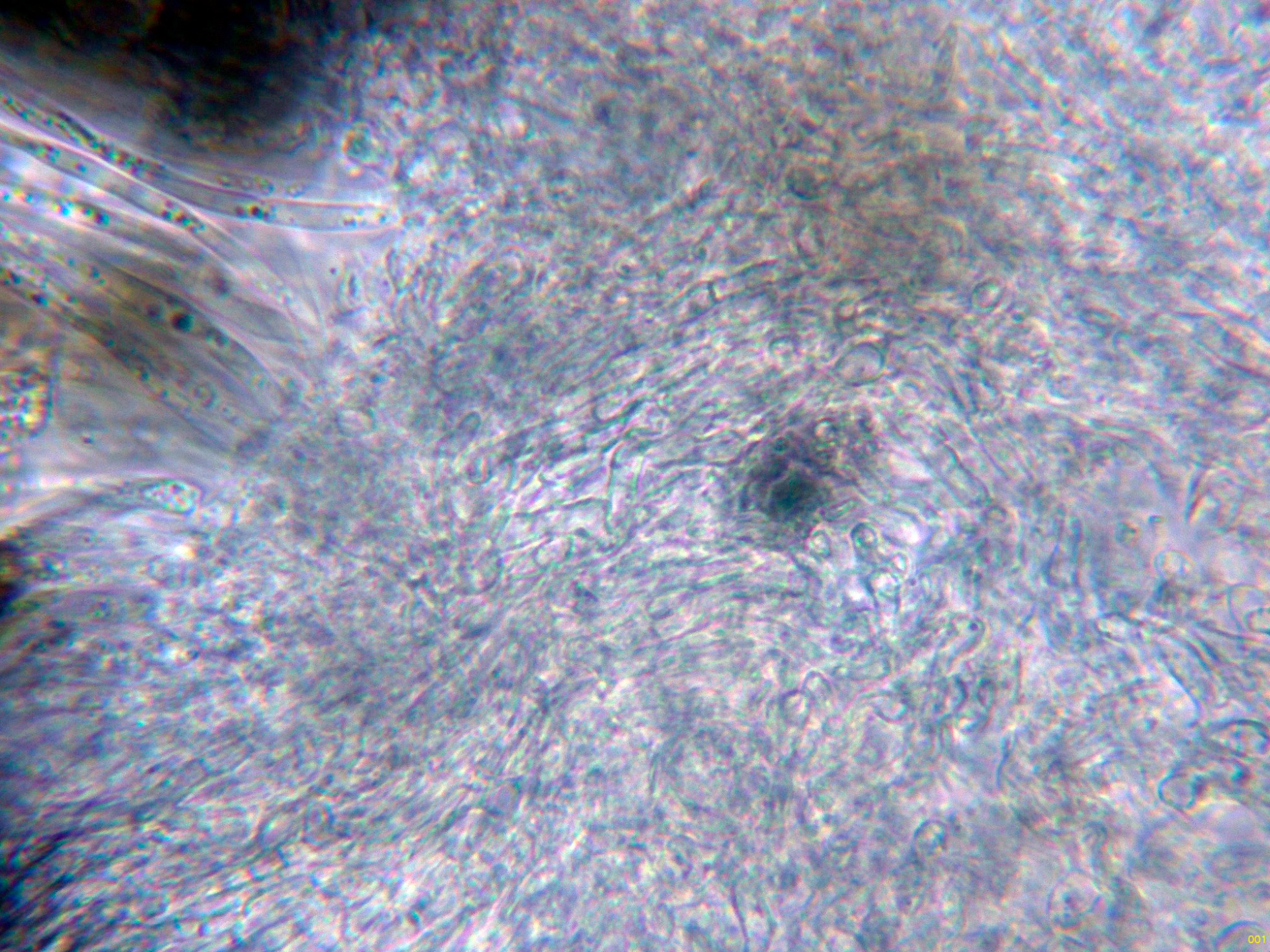 Ampliación a 40 aumentos, con la parte exterior del hongo a modo de cresta.