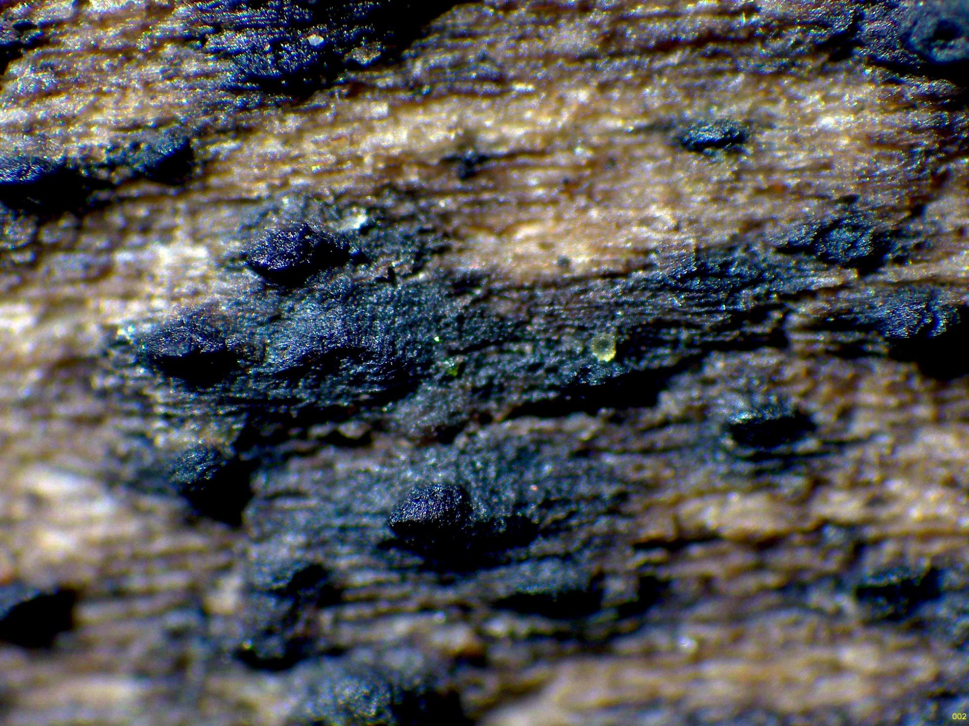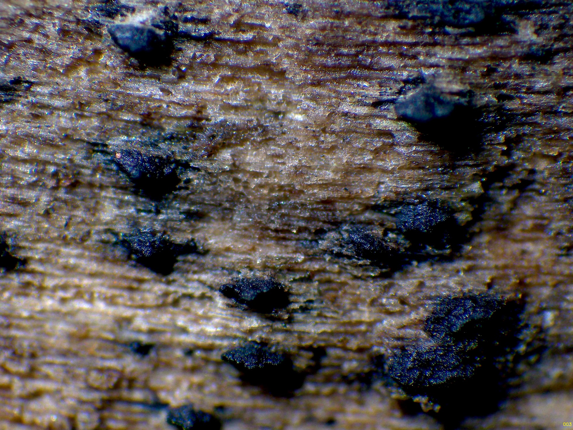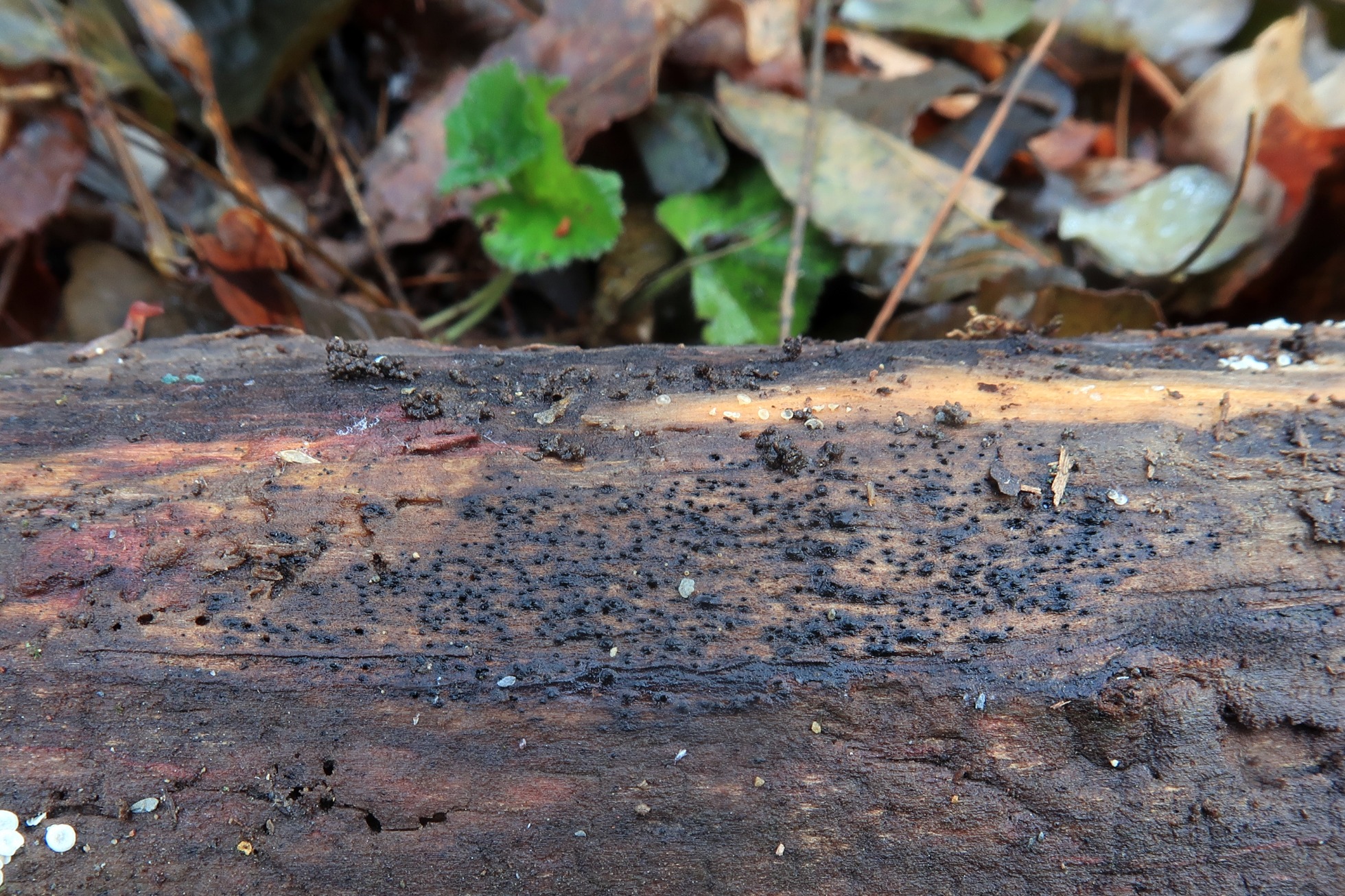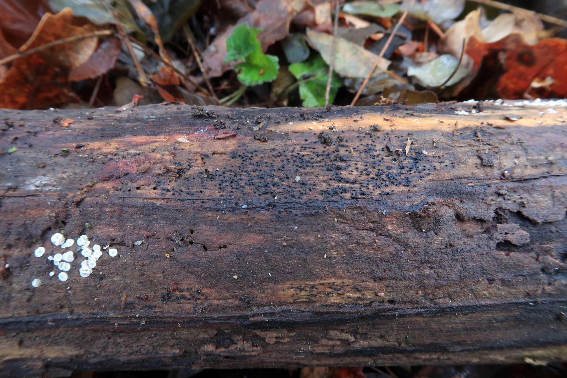 Un muy diminuto pirenomiceto, compartiendo espacio con unos discomicetos blancos aún por determinar, sobre un tronco tumbado del suelo en soto fluvial.