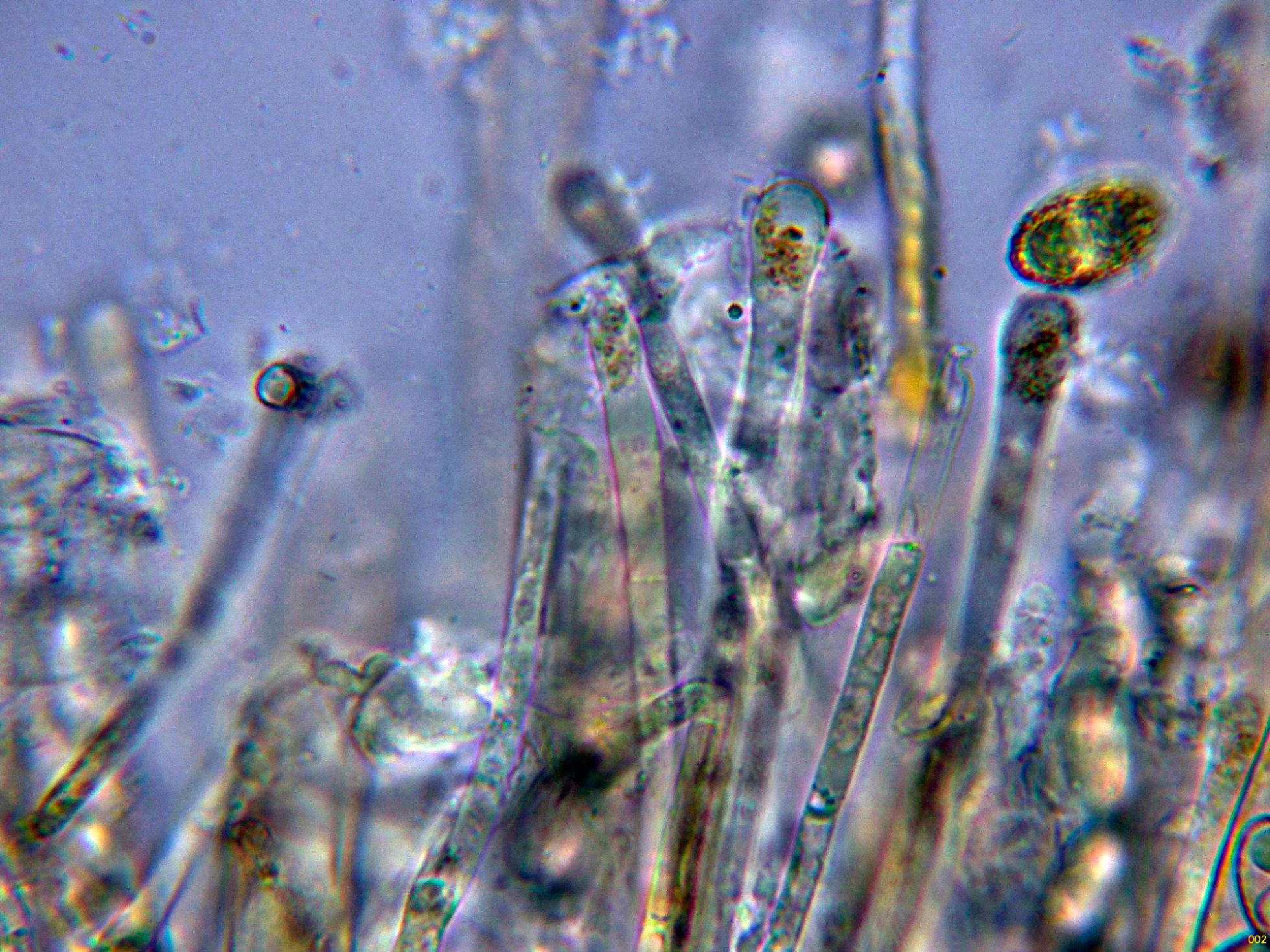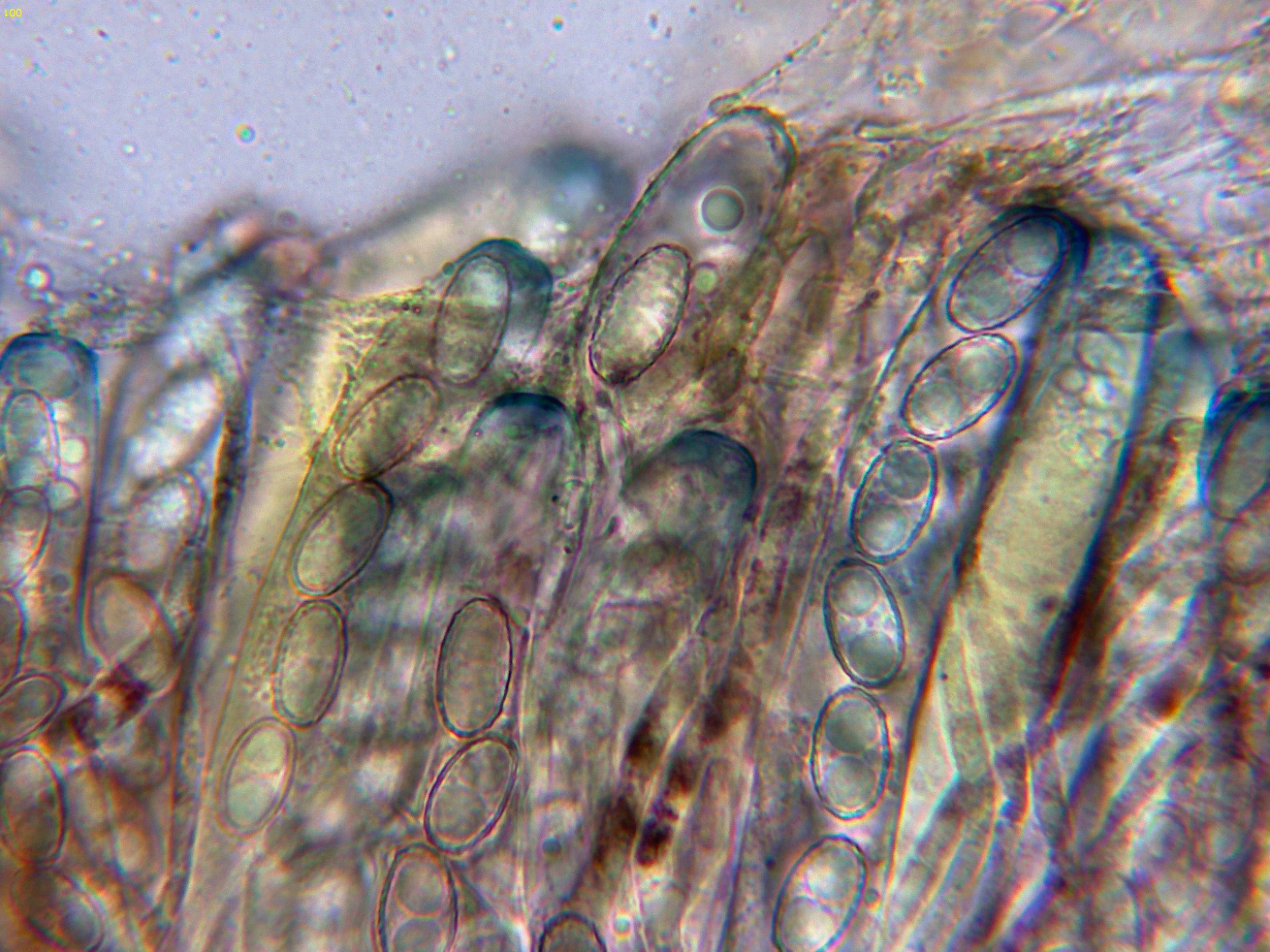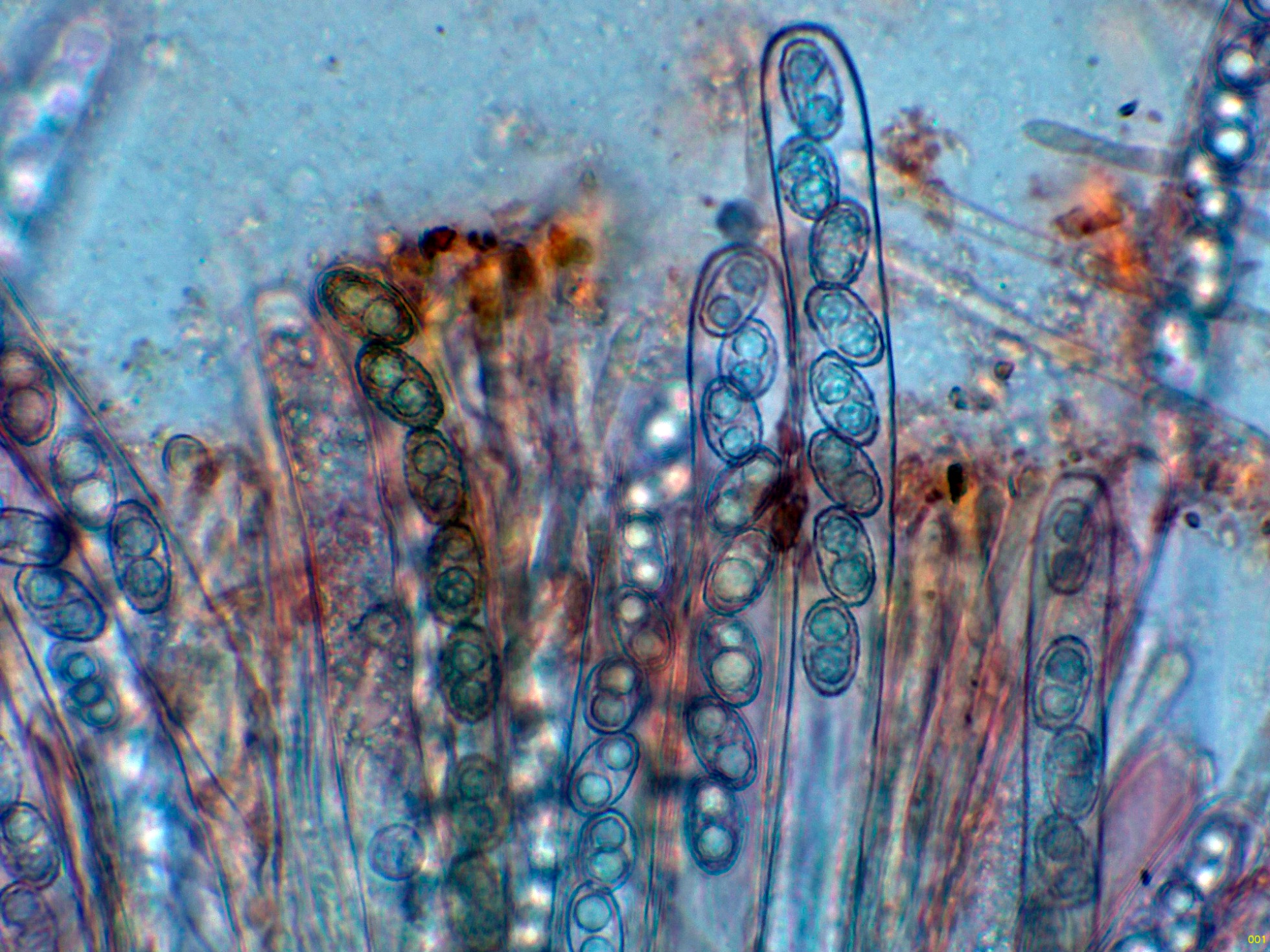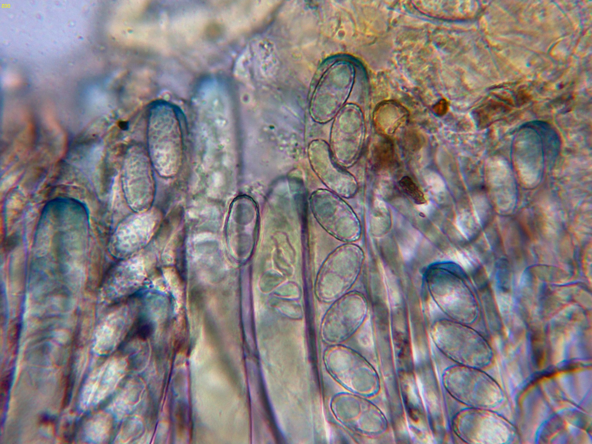 Ascos en Reactivo de Melzer a 400 aumentos, con reacción amiloide.