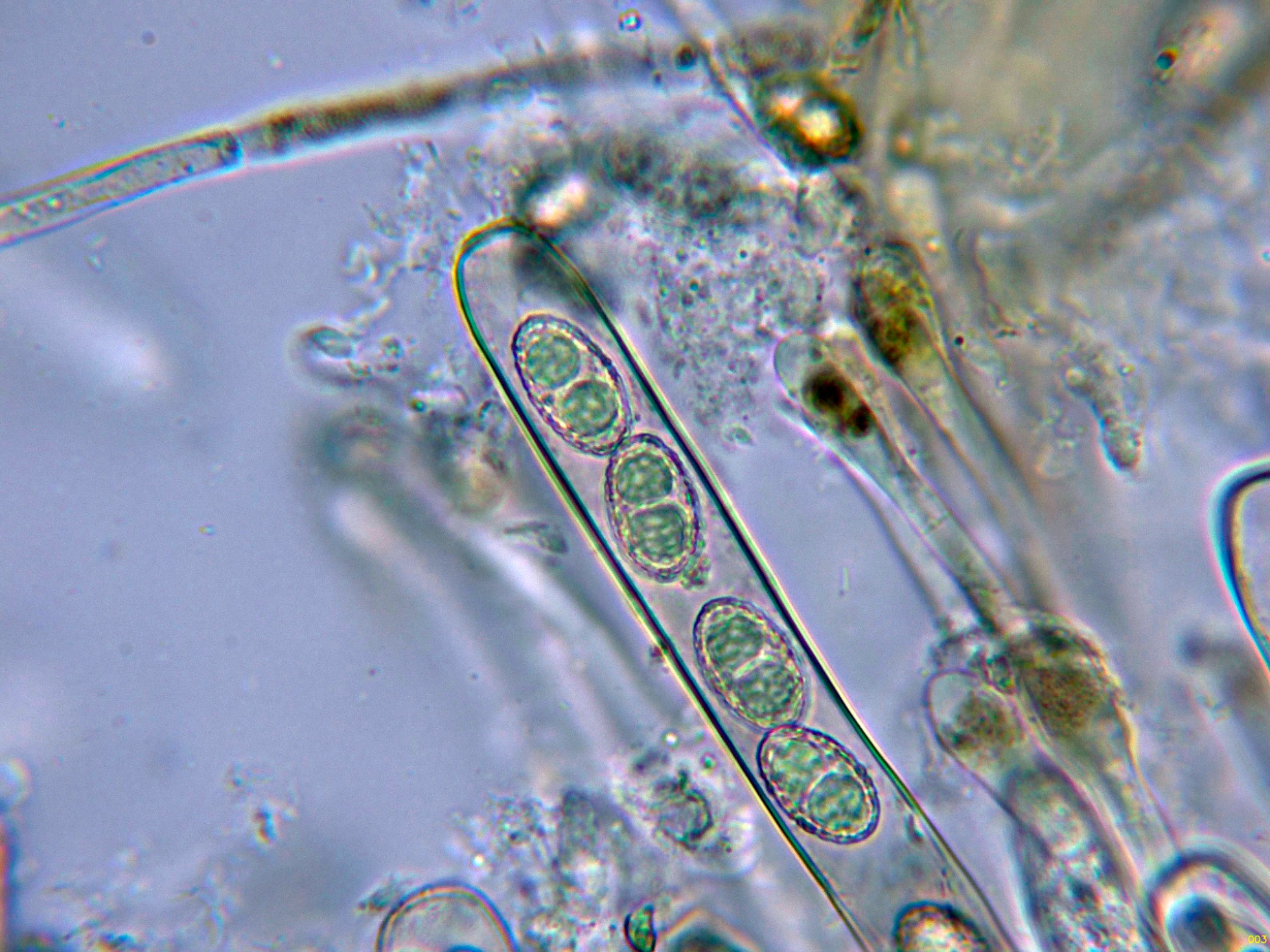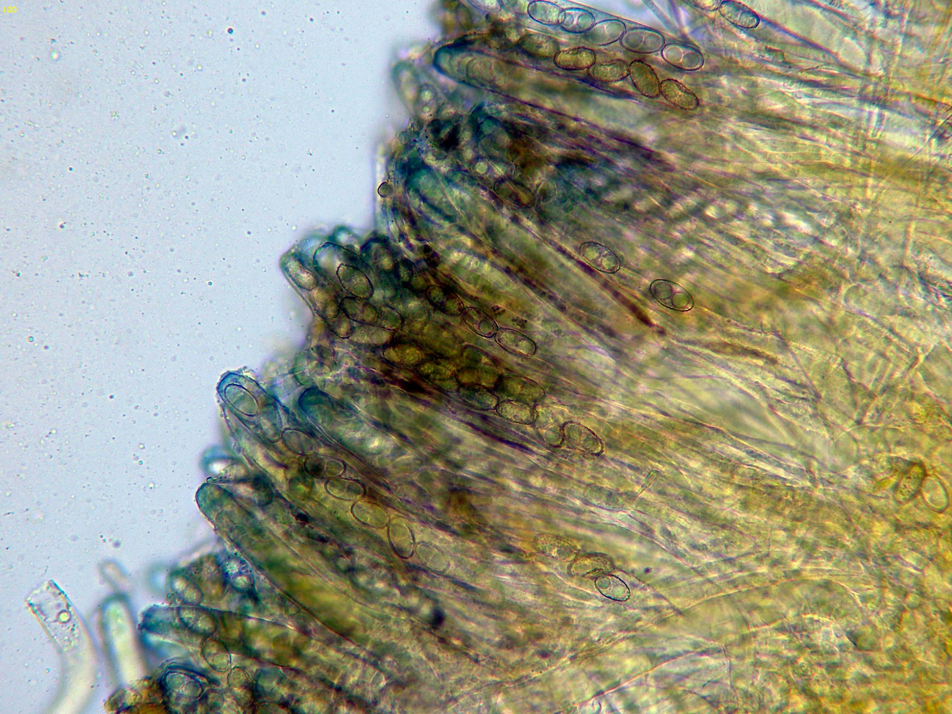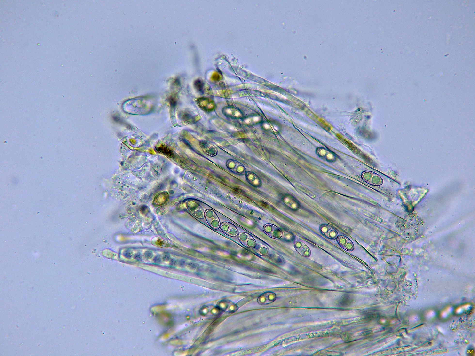 Ascos en Reactivo de Melzer a 400 aumentos, con reacción amiloide.