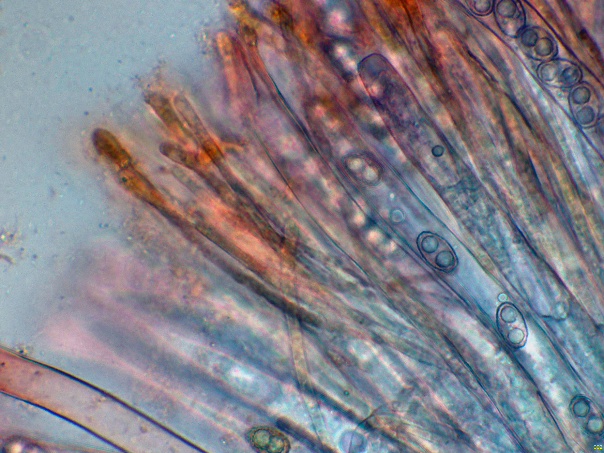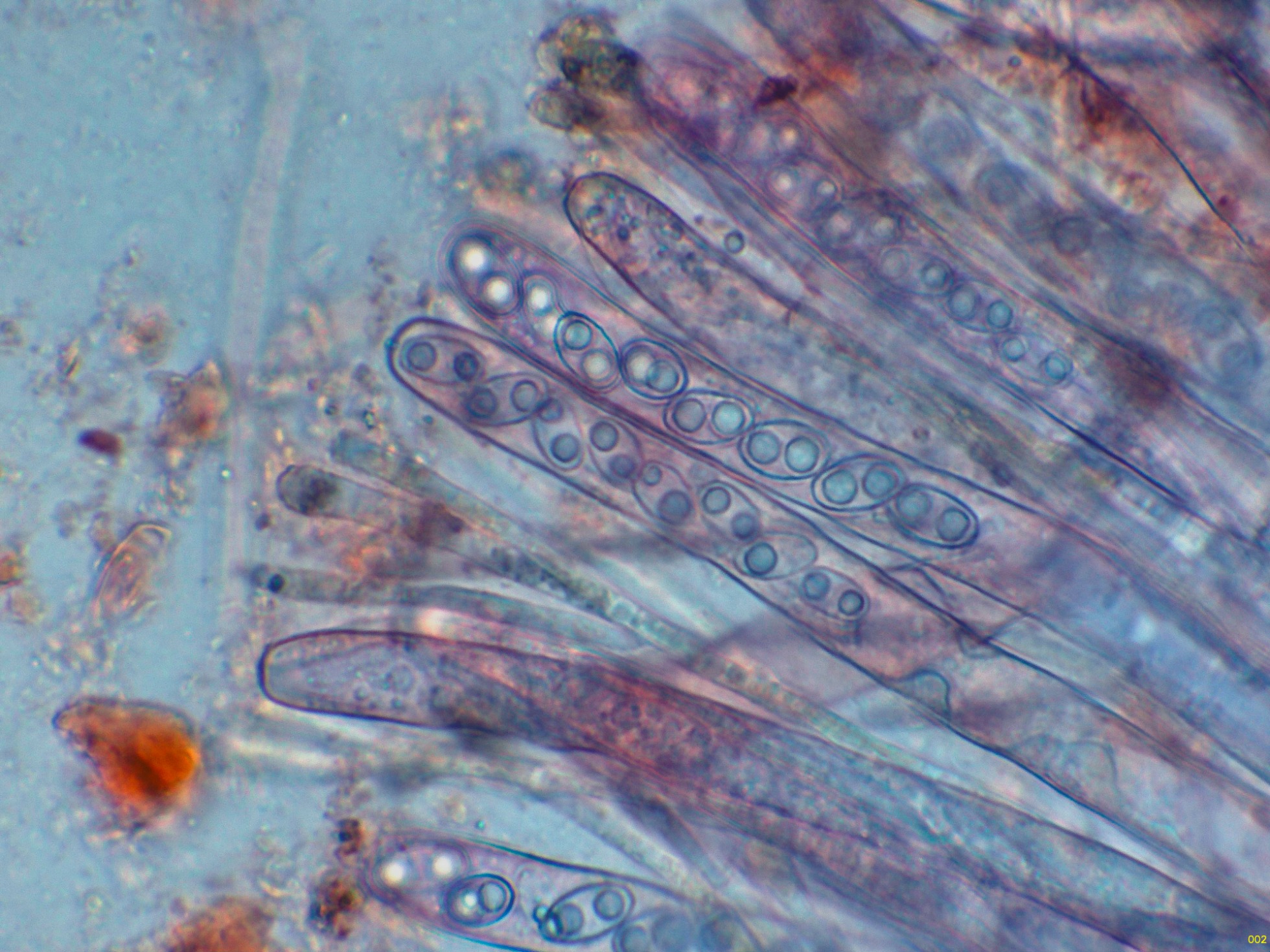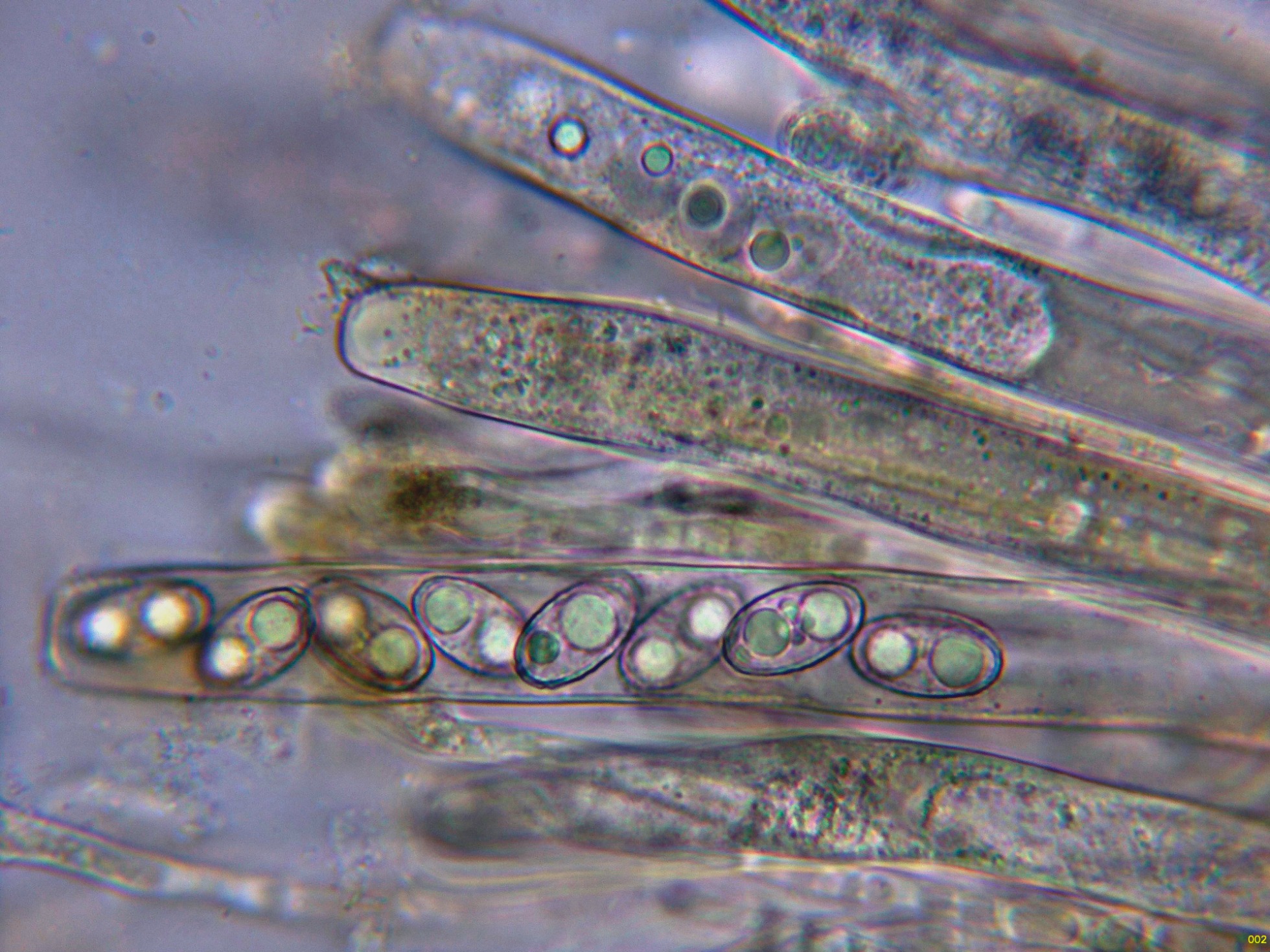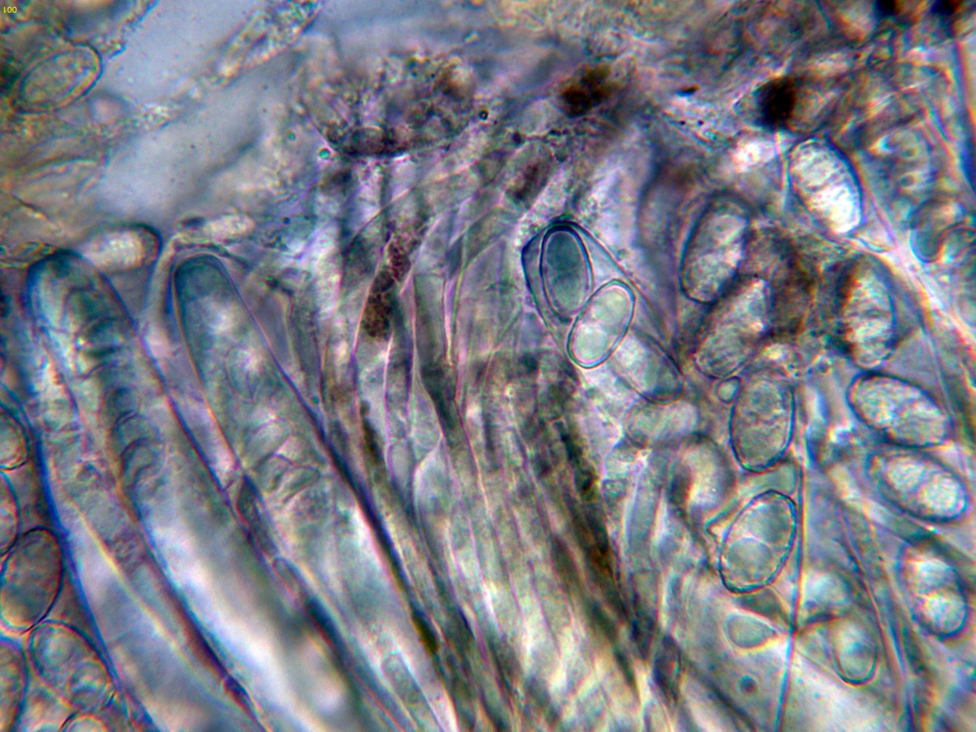 Ascos en Reactivo de Melzer a 400 aumentos, con reacción amiloide.