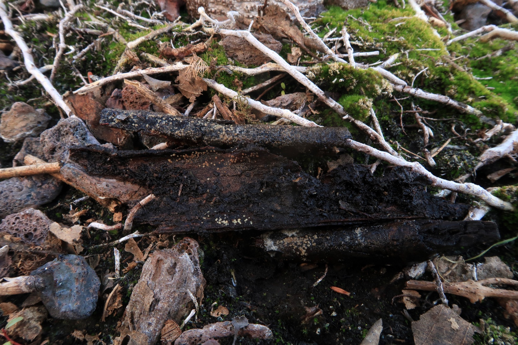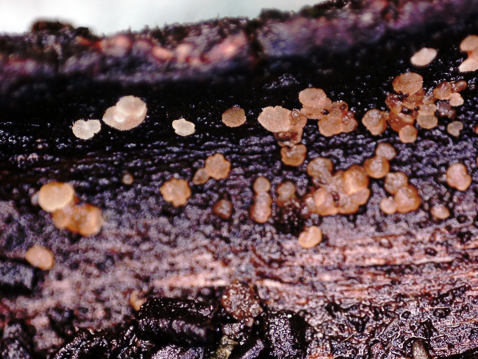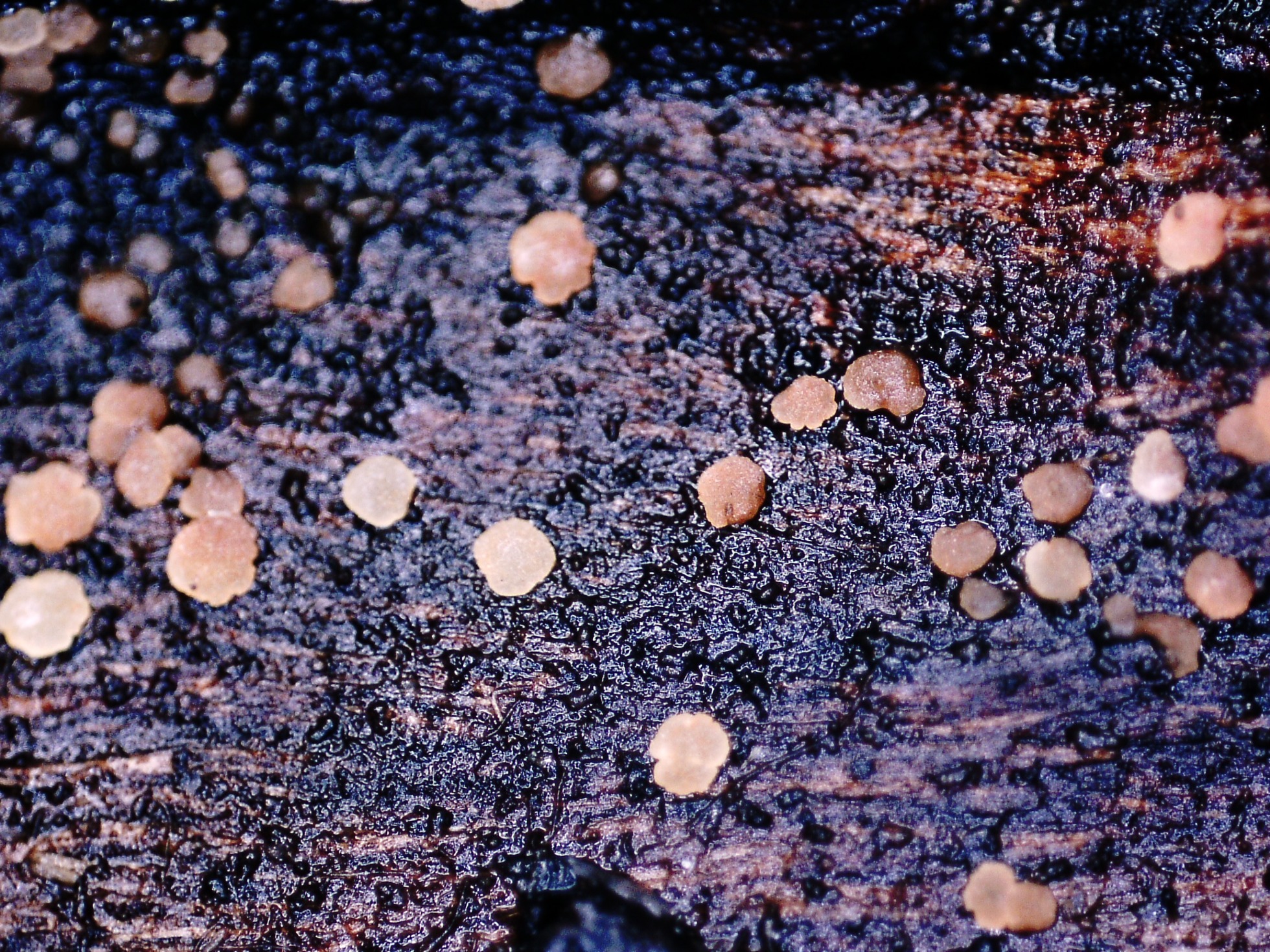 Los apotecios que aparecen sobre la corteza de la parte central, tanto los de la parte superior como de la parte inferior aunque con un aspecto muy distinto, terminaron siendo de lo mismo, al igual que los apotecios de los troncos que aparecen en la imágen, estos apotecios van cambiando de color con el desarrollo.