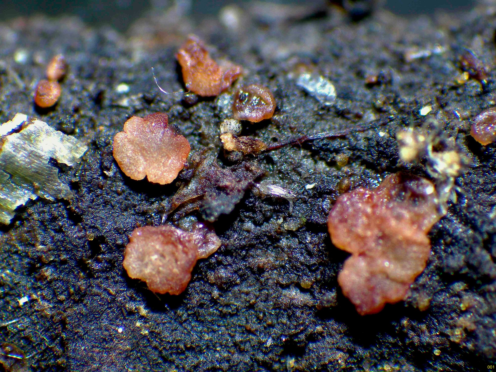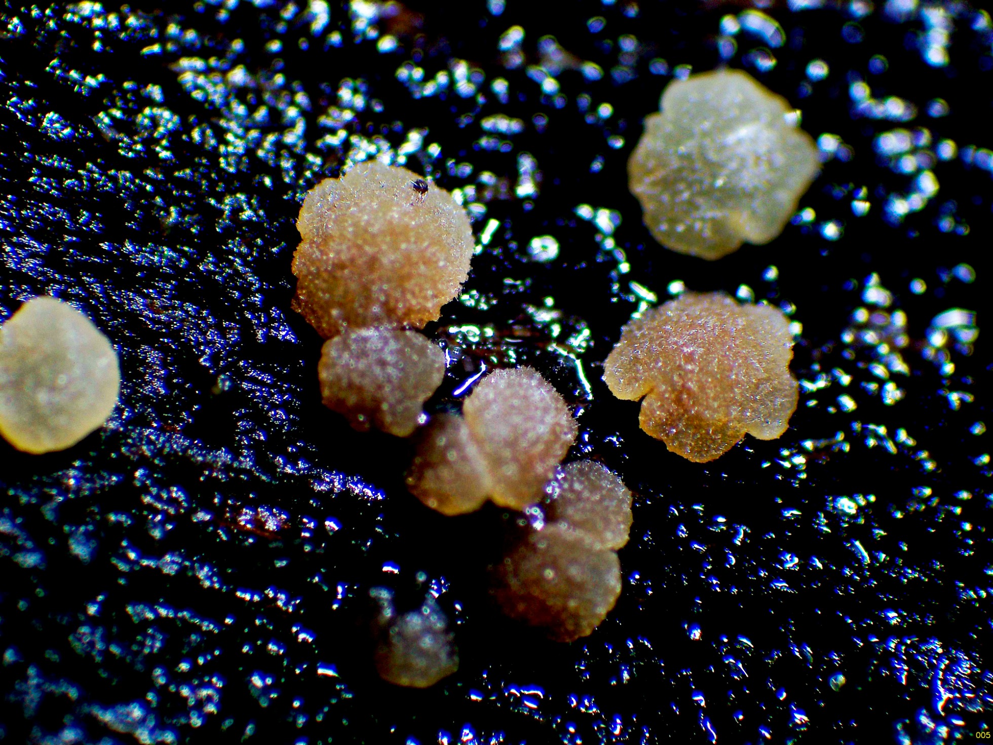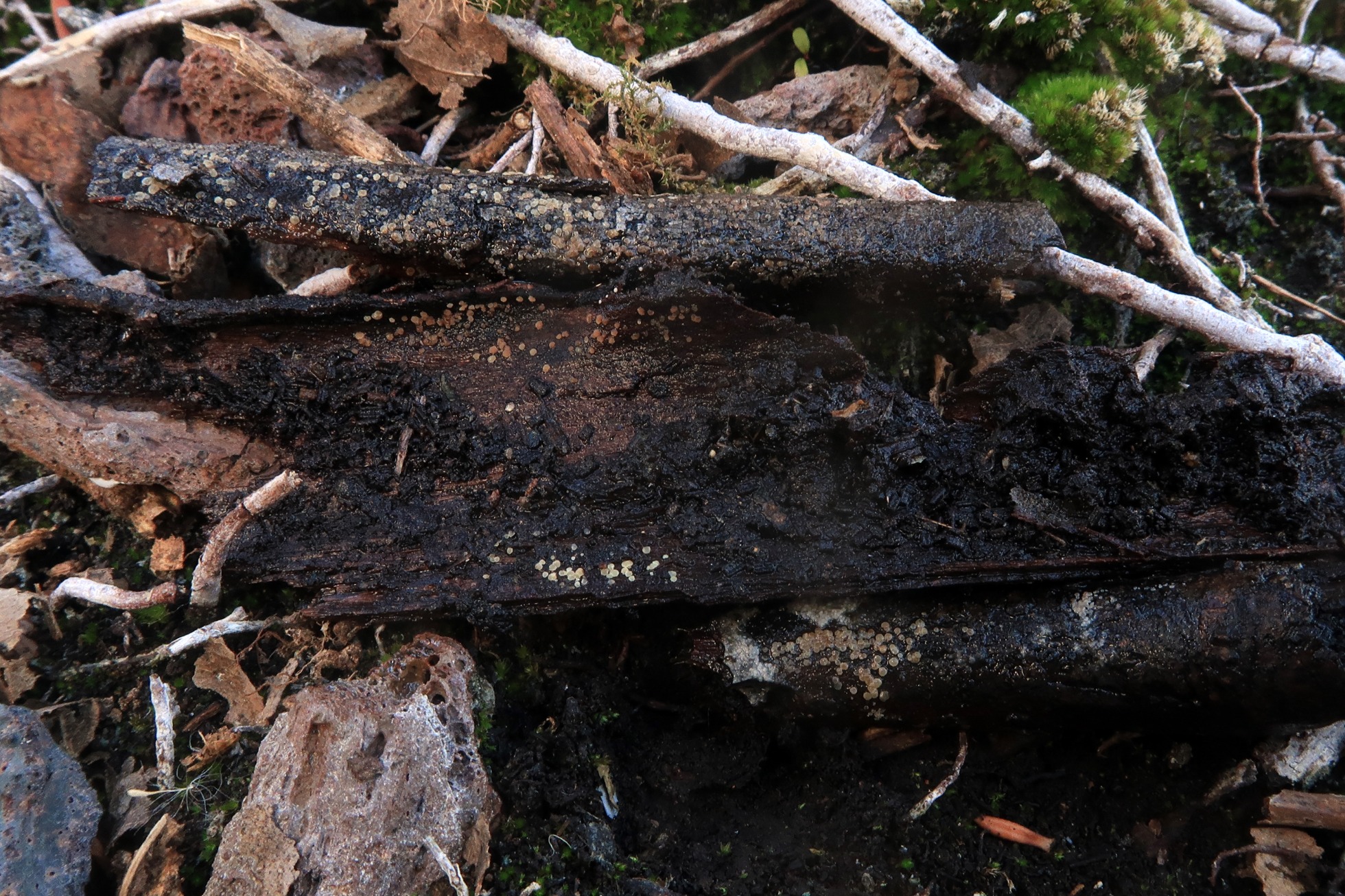 Los apotecios que aparecen sobre la corteza de la parte central, tanto los de la parte superior como de la parte inferior aunque con un aspecto muy distinto, terminaron siendo de lo mismo, al igual que los apotecios de los troncos que aparecen en la imágen, estos apotecios van cambiando de color con el desarrollo.
