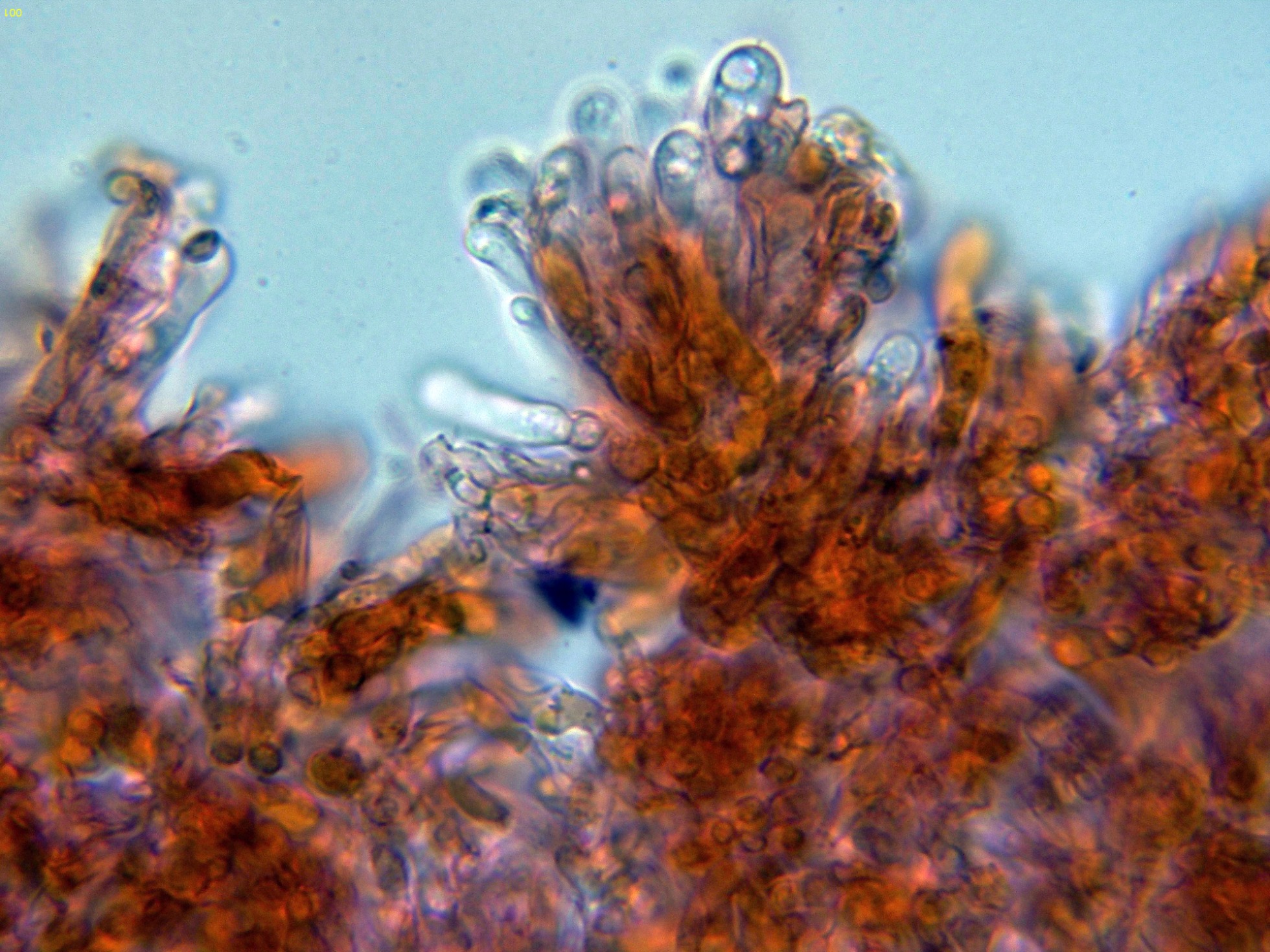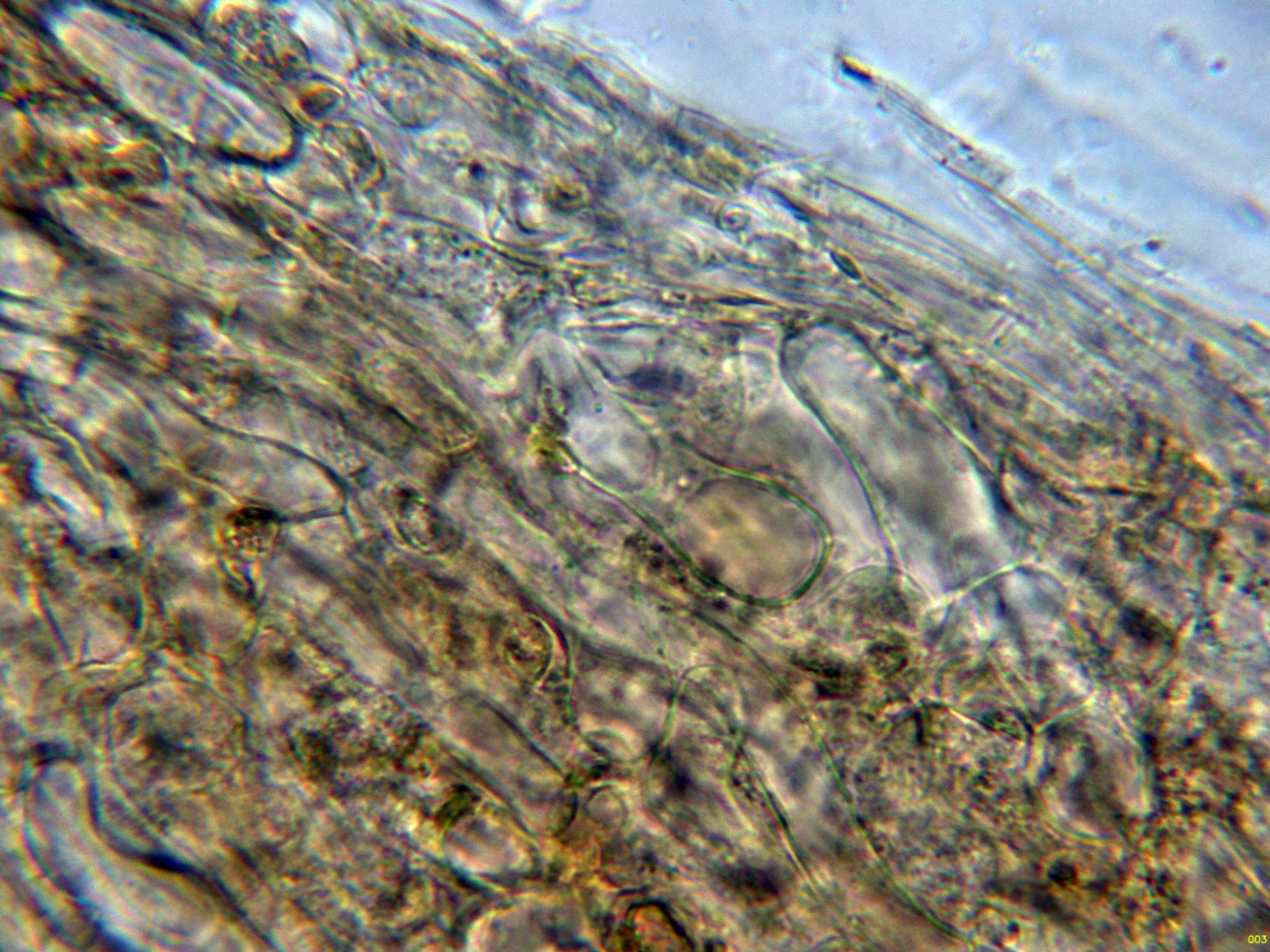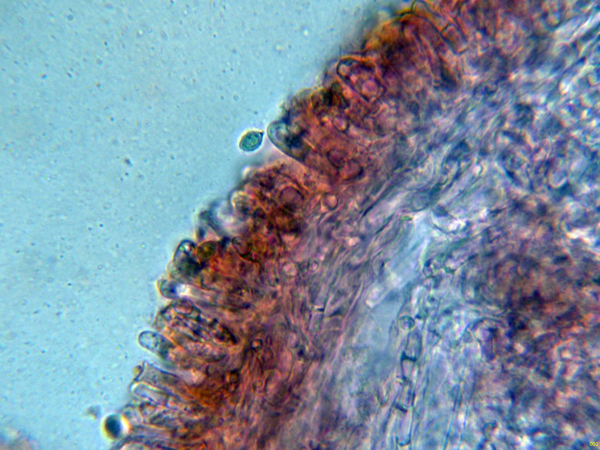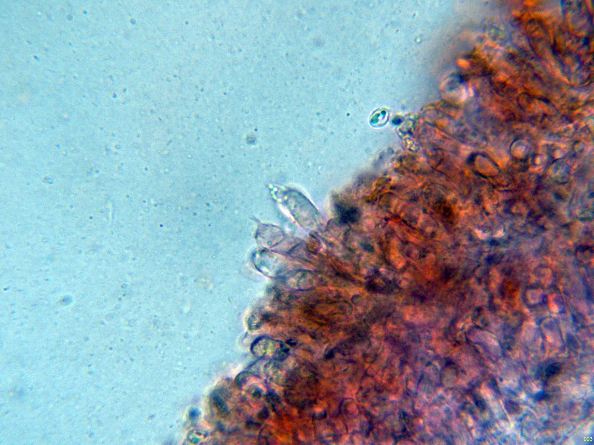 Arista laminar sin cistidios claramente diferenciados, solo con algunos elementos más estrechos que los basidios, sinuosos y que sobresalen poco por encima de estos, que se corresponderían a queilocistidios.