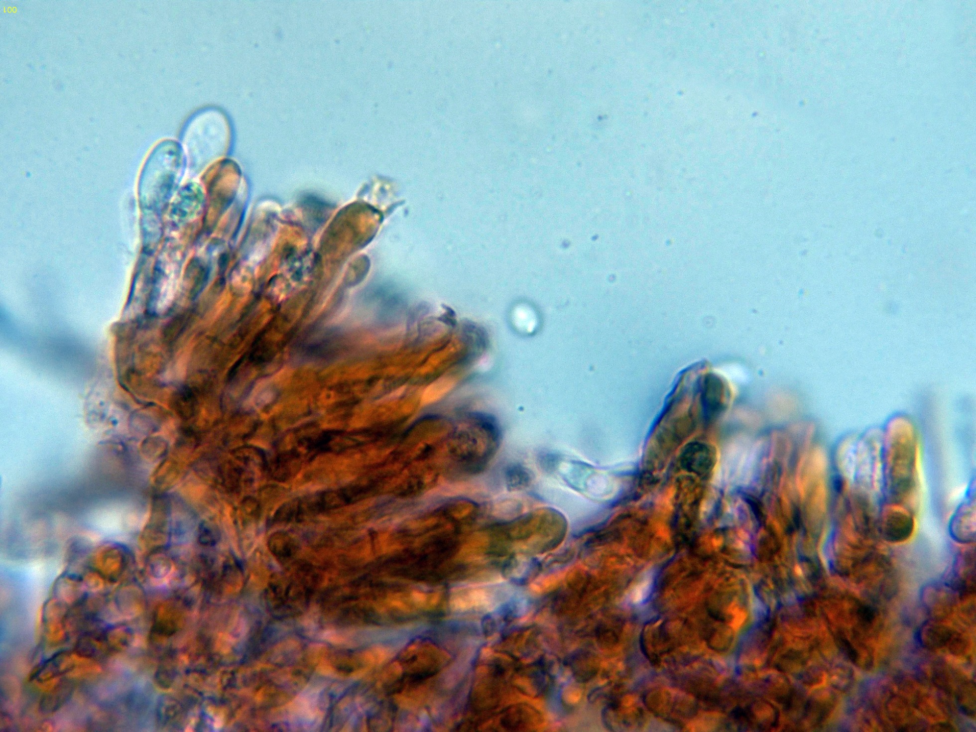 Las hifas de la suprapellis, dispuestas más o menos paralelamente, pigmentadas, con tabiques cortos y sin fíbulas.