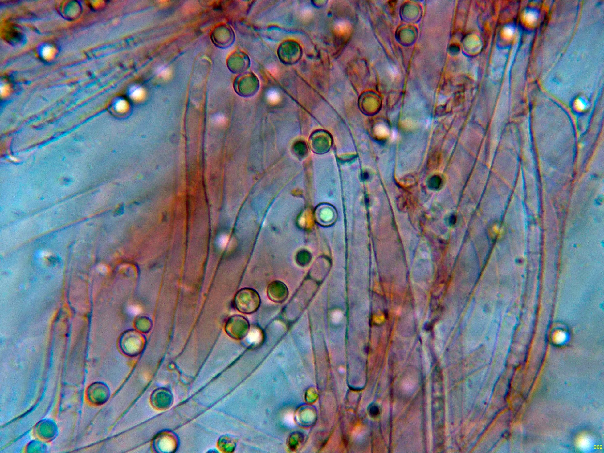 Hifas tramales en solución de Rojo Congo, en las que se puede apreciar algunas gruesas fíbulas.