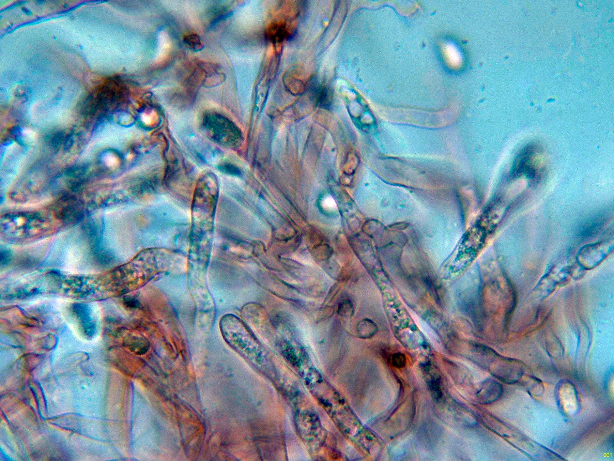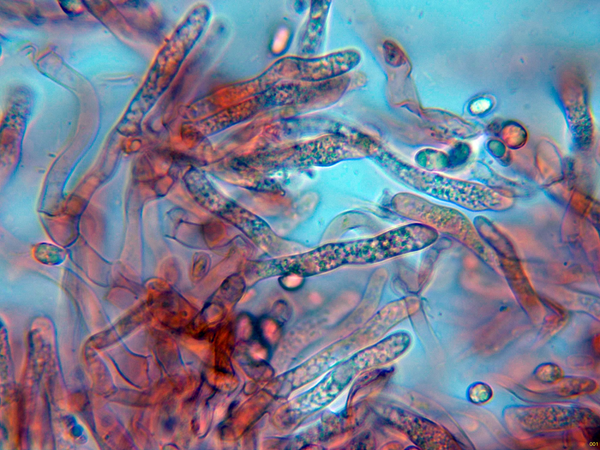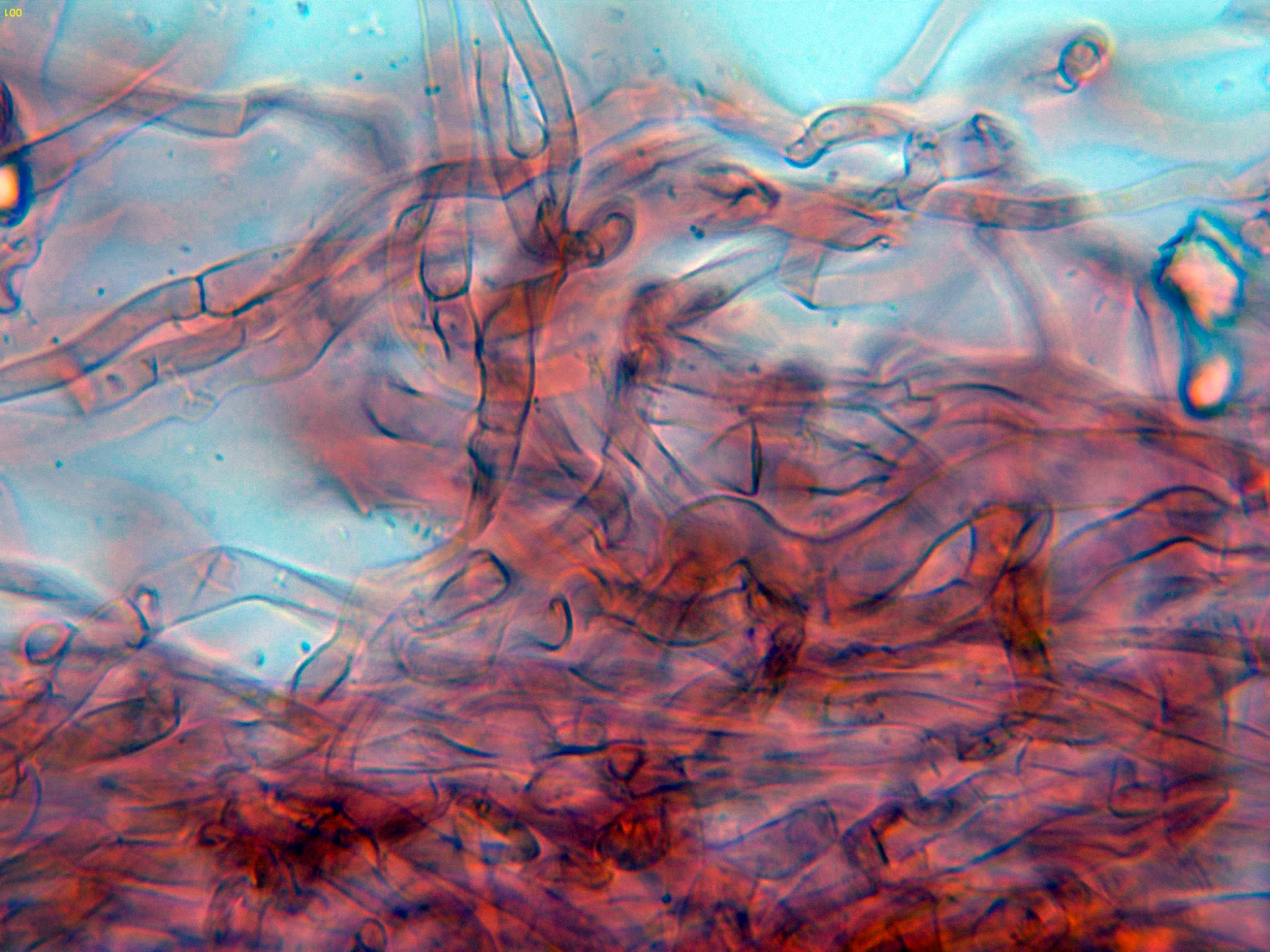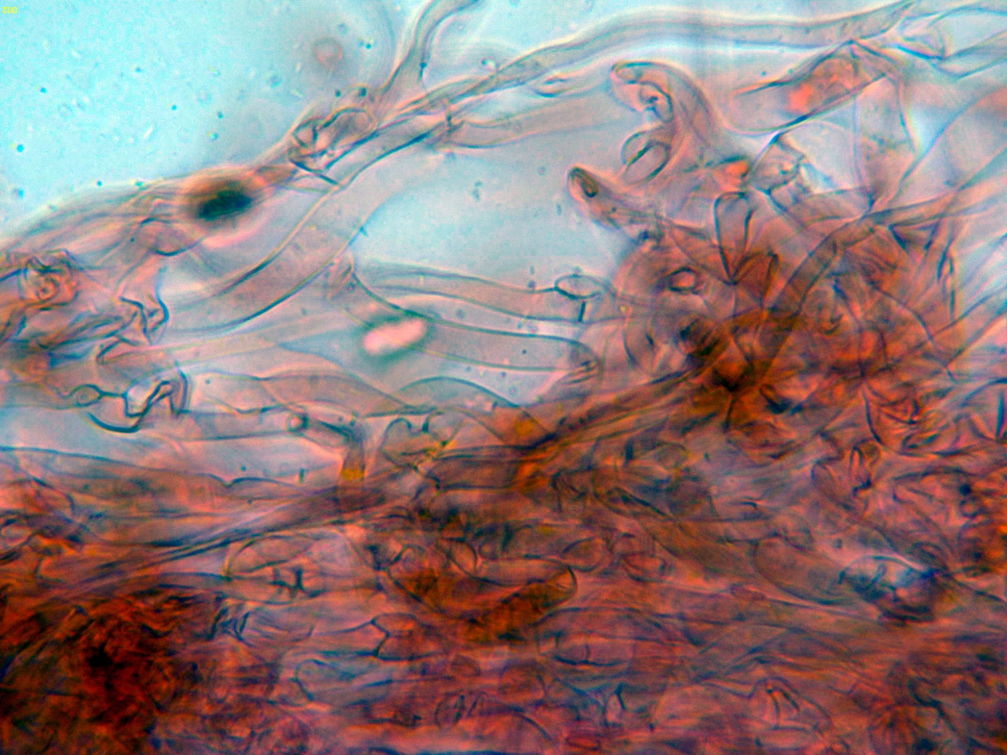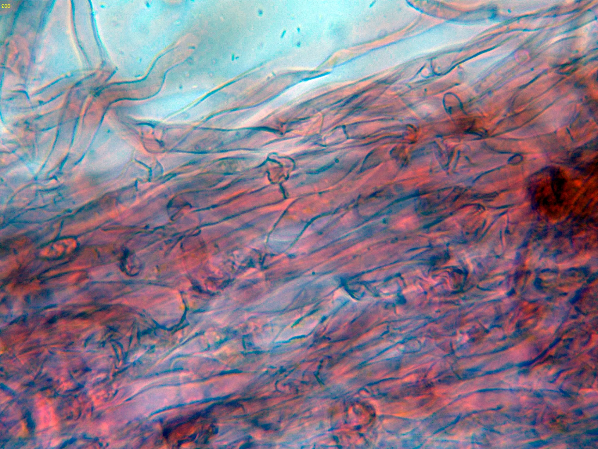 Hifas de la suprapellis filamentosas, con marcadas fíbulas en los tabiques.