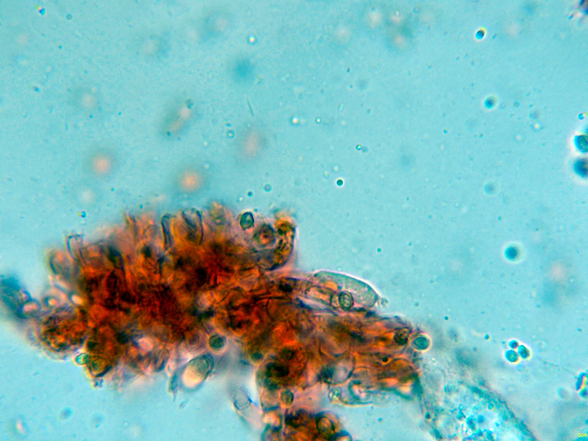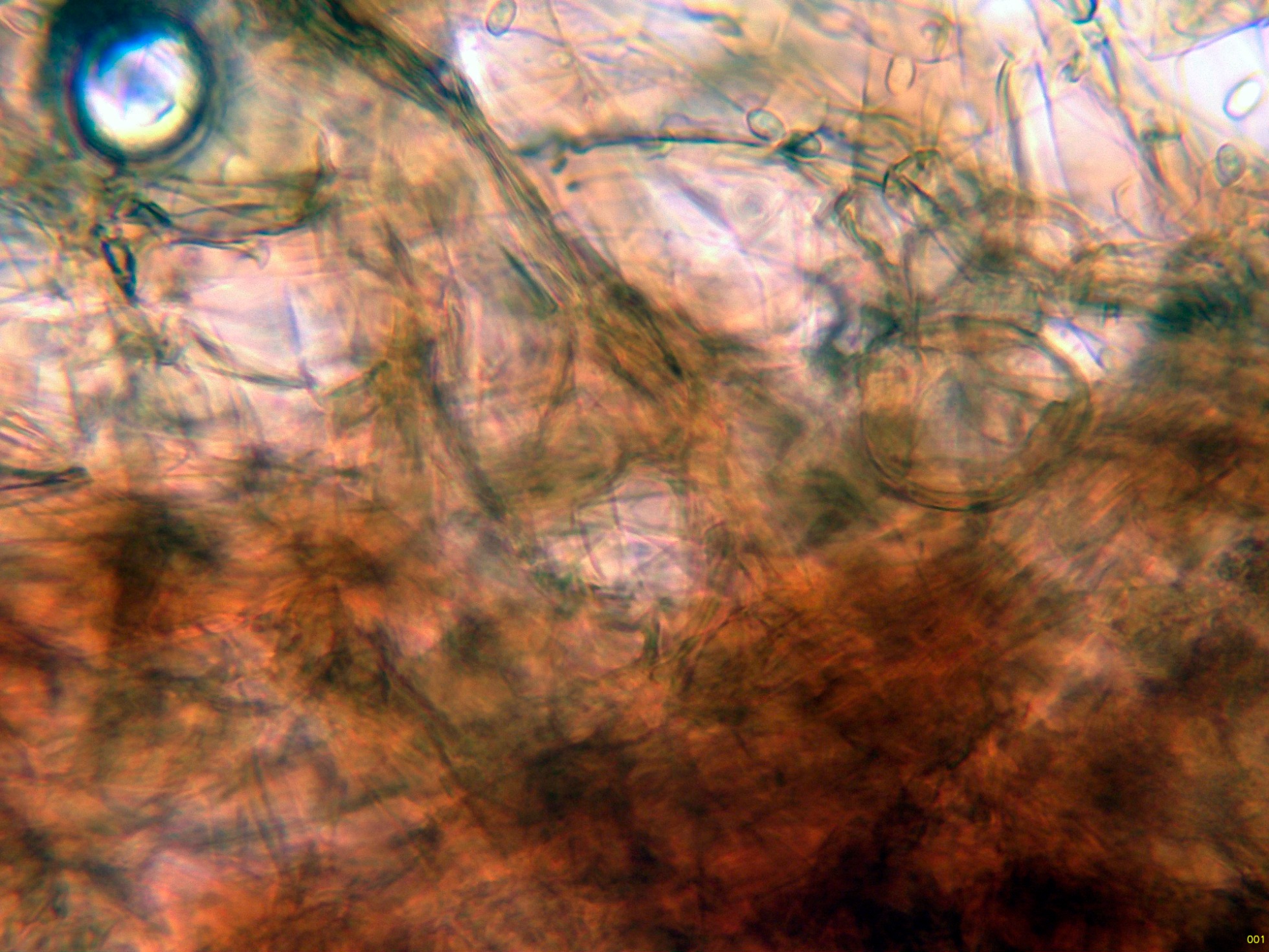 Hifas de la suprapellis en solución de Rojo Congo, con algunas hifas globosas, este detalle típico del género Echinoderma.