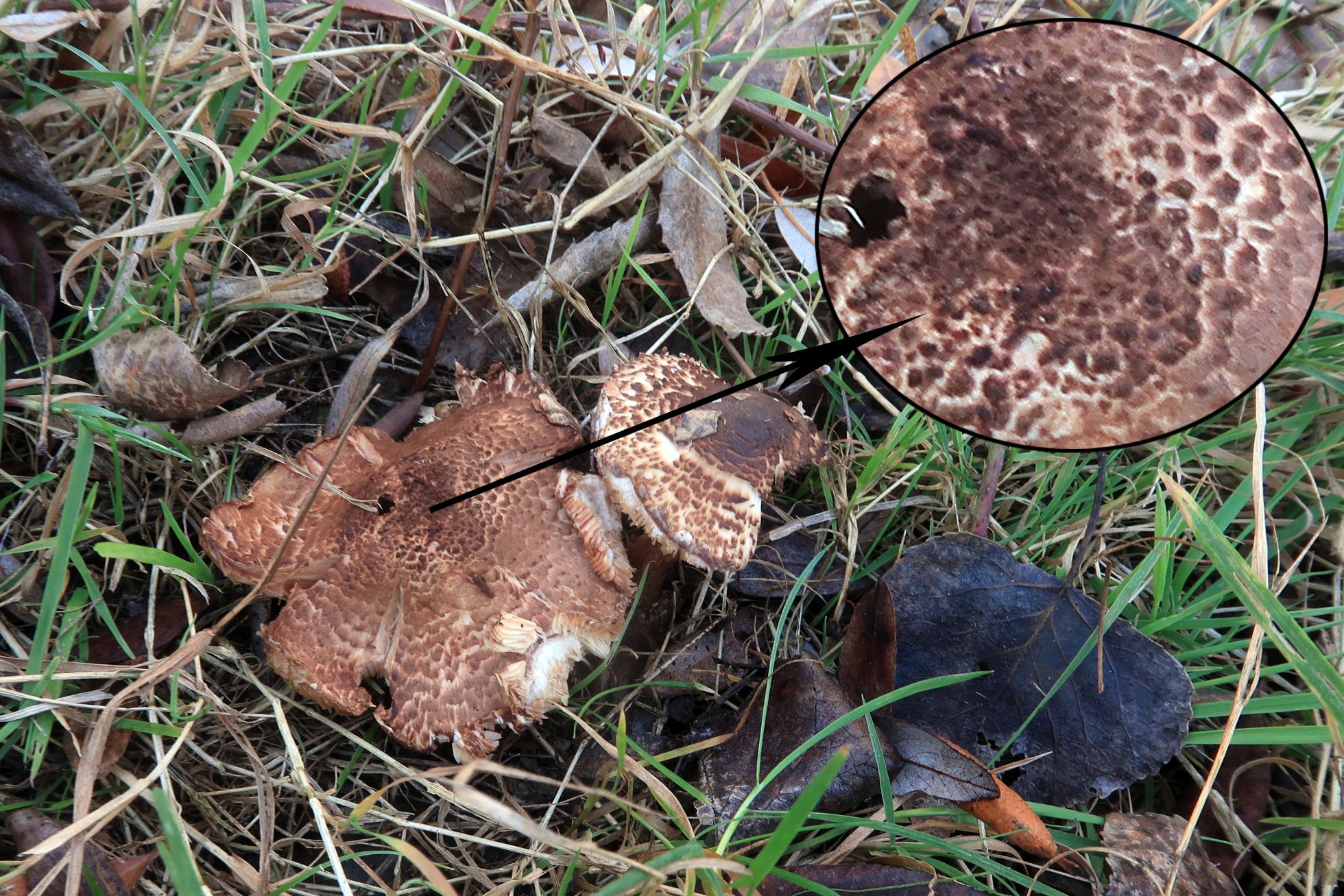 En una ampliación del centro del sombrero, se aprecian unas escamas piramidales que son típicas del género Echinoderma.