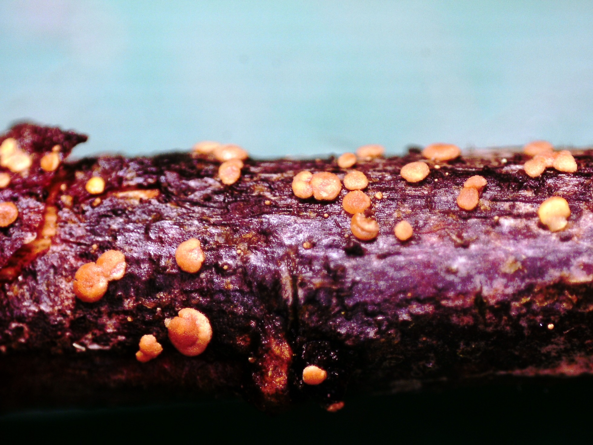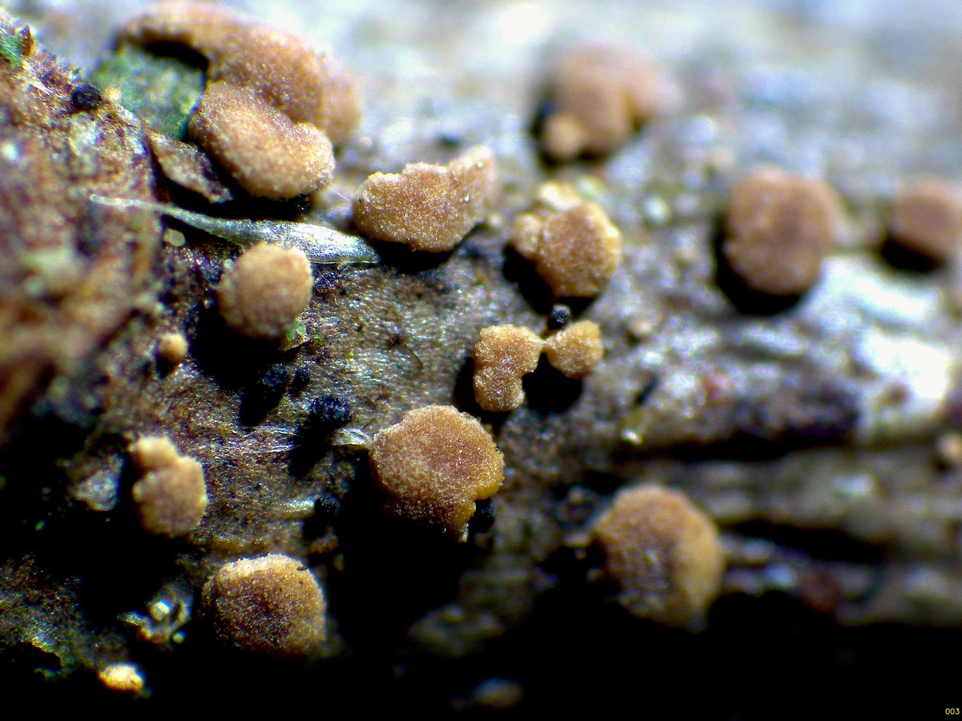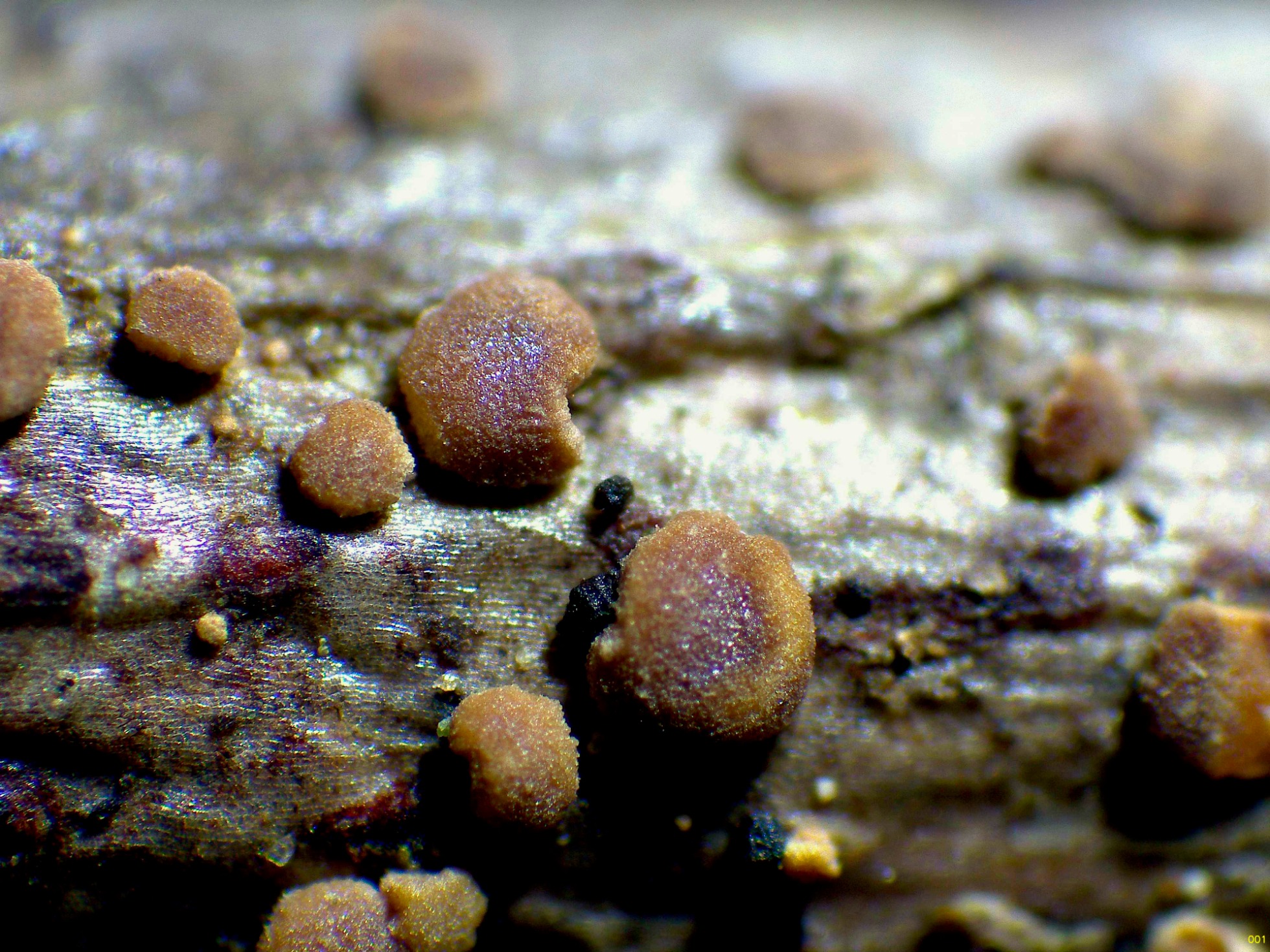 Unos pequeños apotecios brotando de manera masiva sobre un fino tronco de Laurus nobilis.