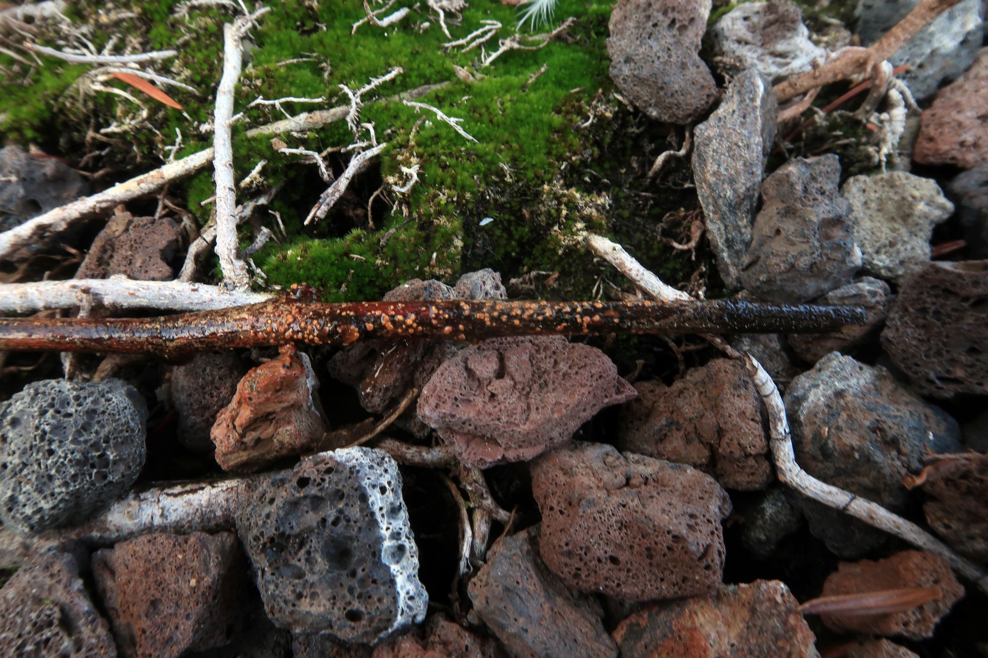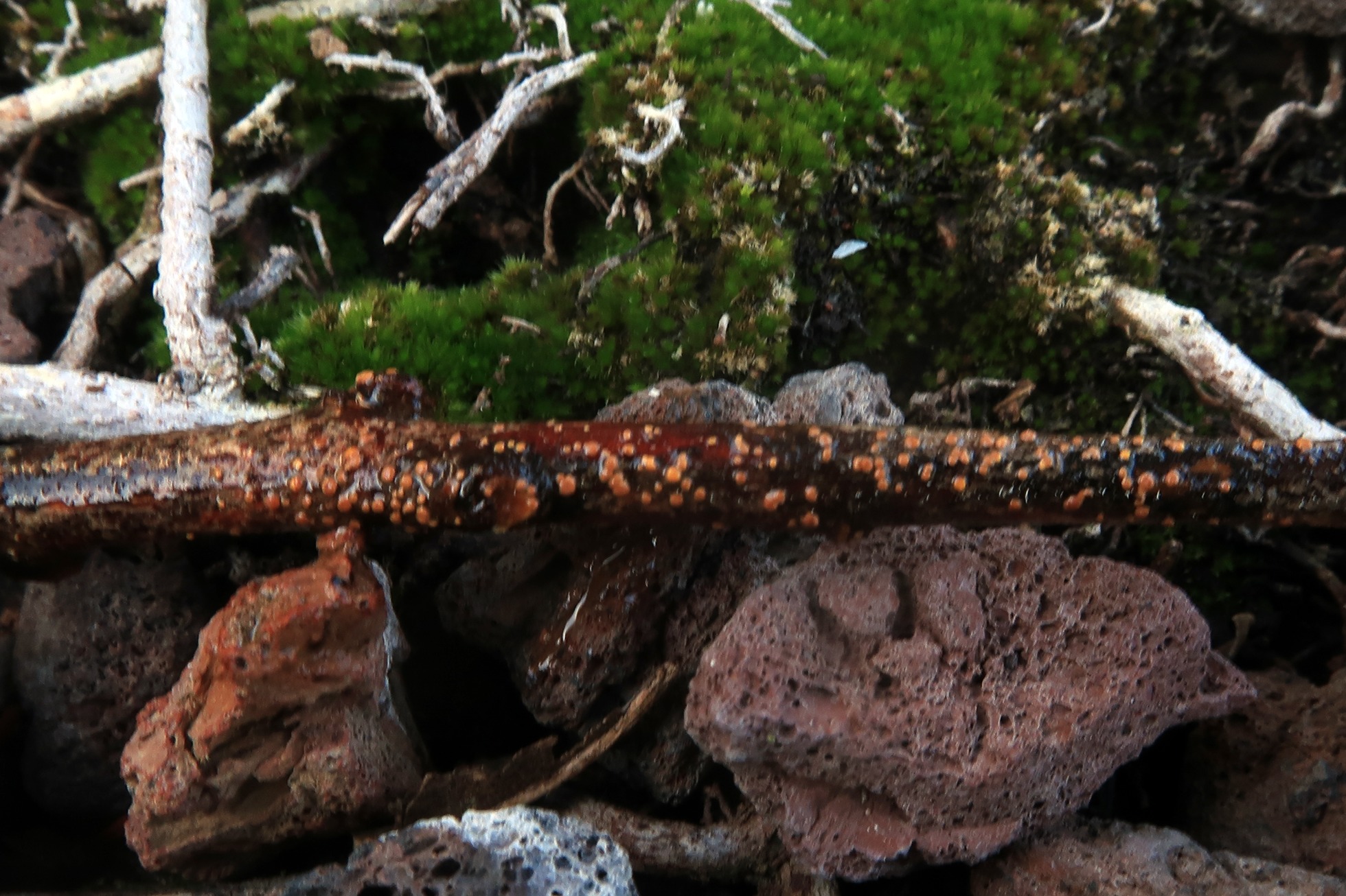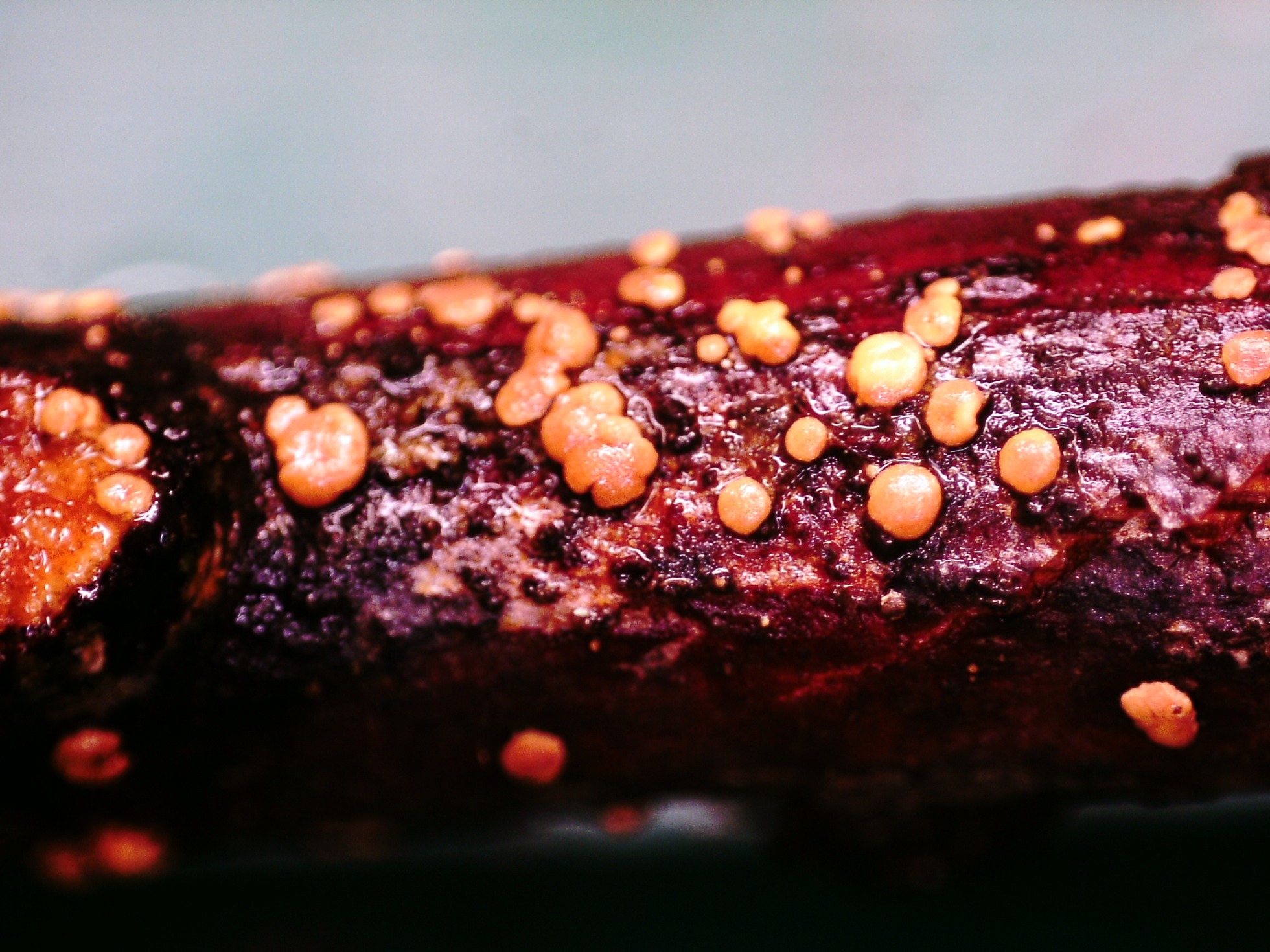 Unos pequeños apotecios brotando de manera masiva sobre un fino tronco de Laurus nobilis.