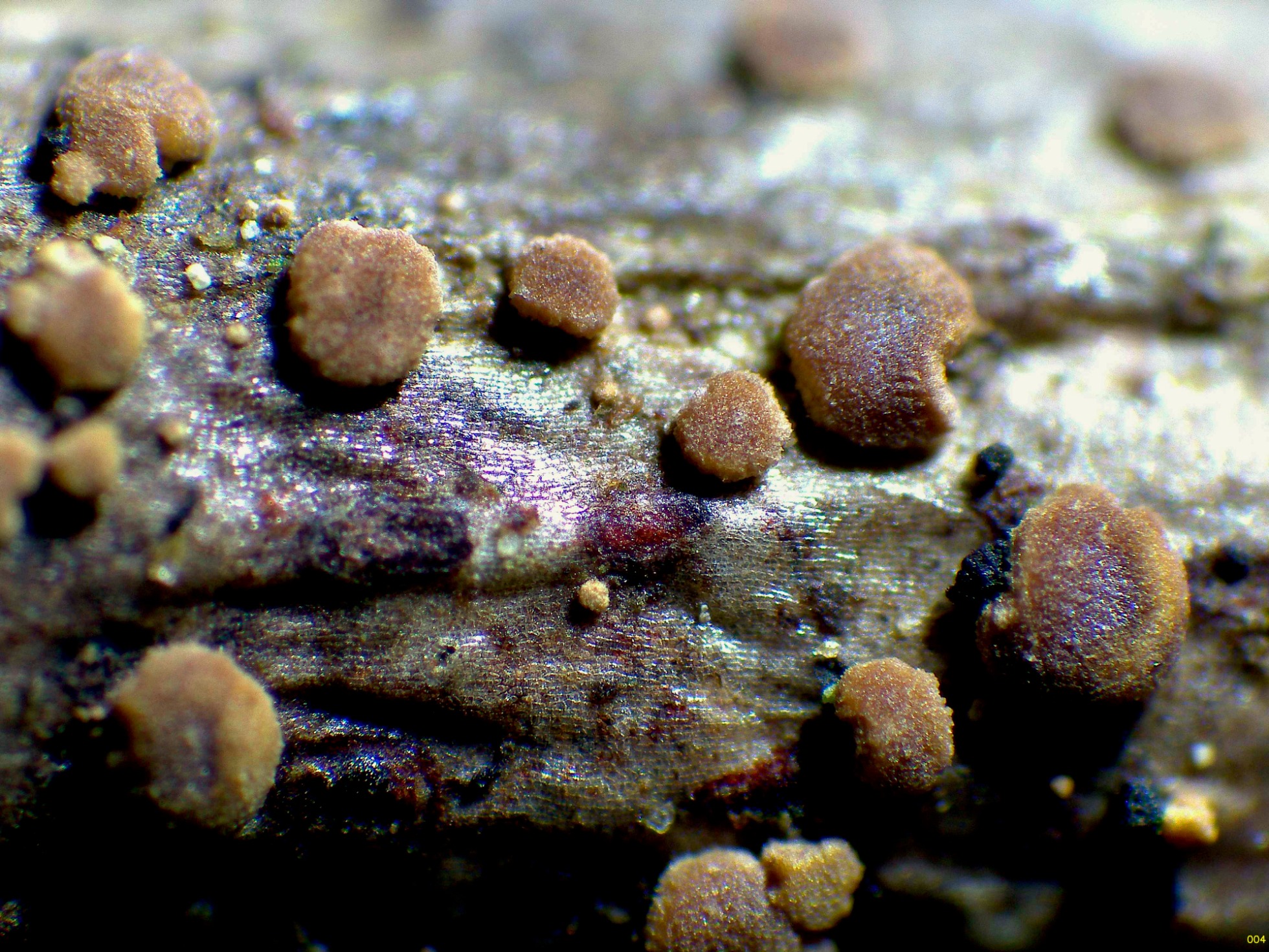 De forma esférica, algo aplanada, de color anaranjado en húmedo y color marrón verdoso en seco. con un diámetro de entre 0,2 a 0,7 mm.Los apotecios a 20 aumentos.